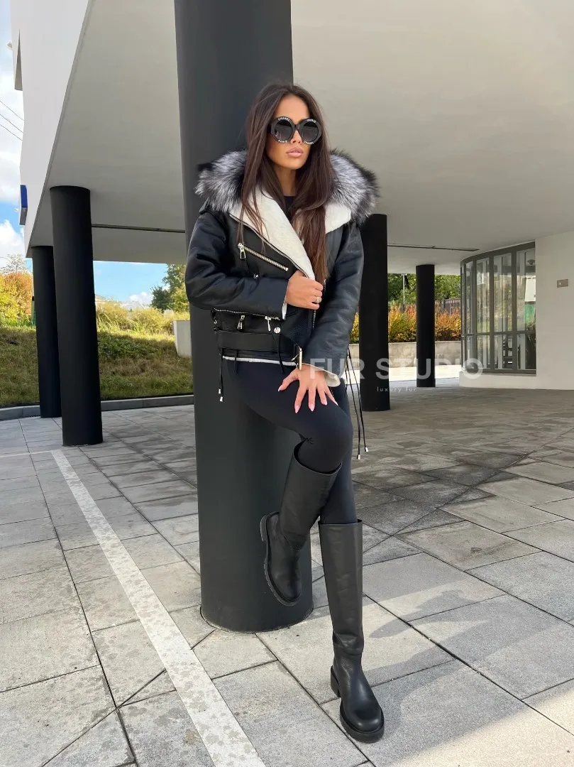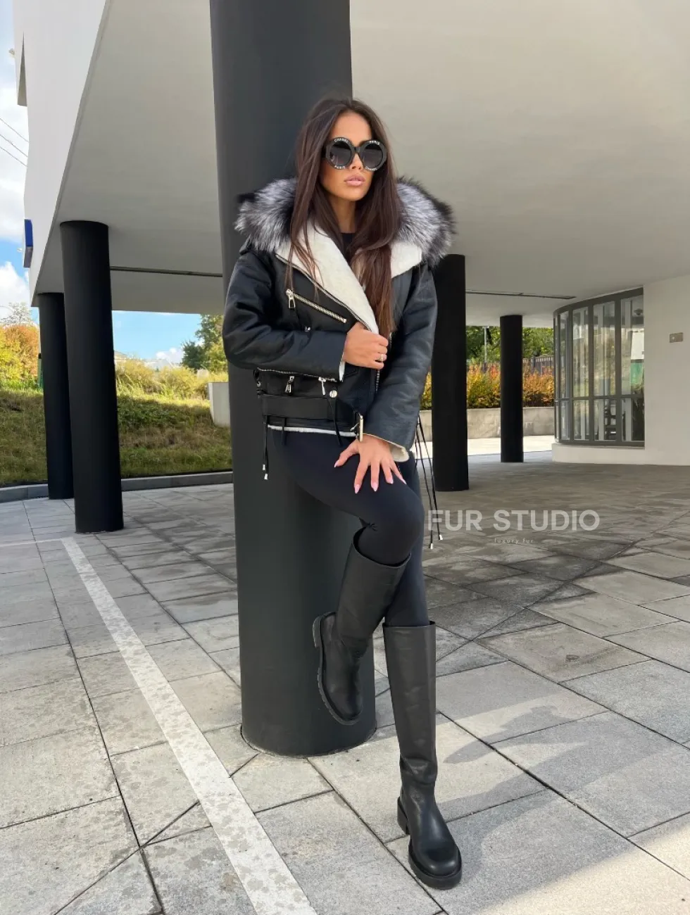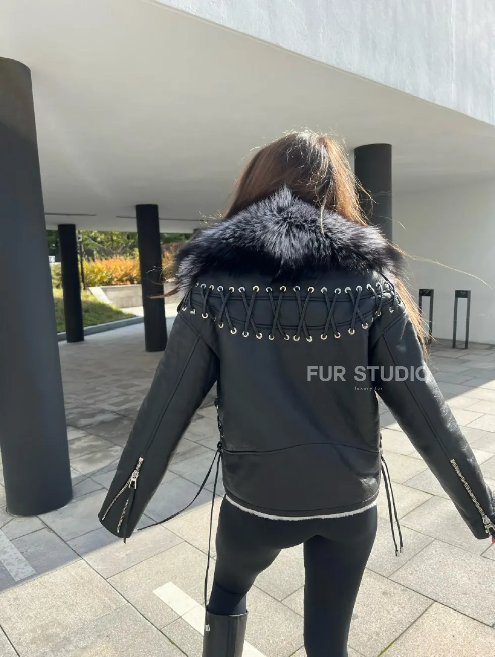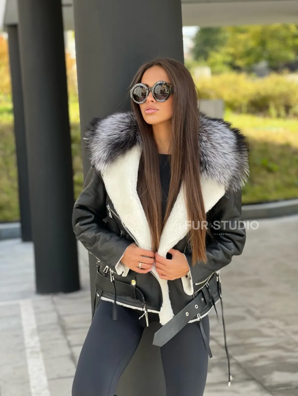 Авиатор из натуральной кожи с воротником из чернобурой лисы – выбор современных женщин. Модель авиатор – тренд последнего десятилетия. Мех стриженой овчины согреет владелицу в холодную погоду. Натуральная кожа приятна на ощупь и неприхотлива в уходе. Оригинальная шнуровка на спине делает образ экстравагантным и необычным. Роскошный воротник из меха чернобурой лисы подчеркивает изящность шеи.