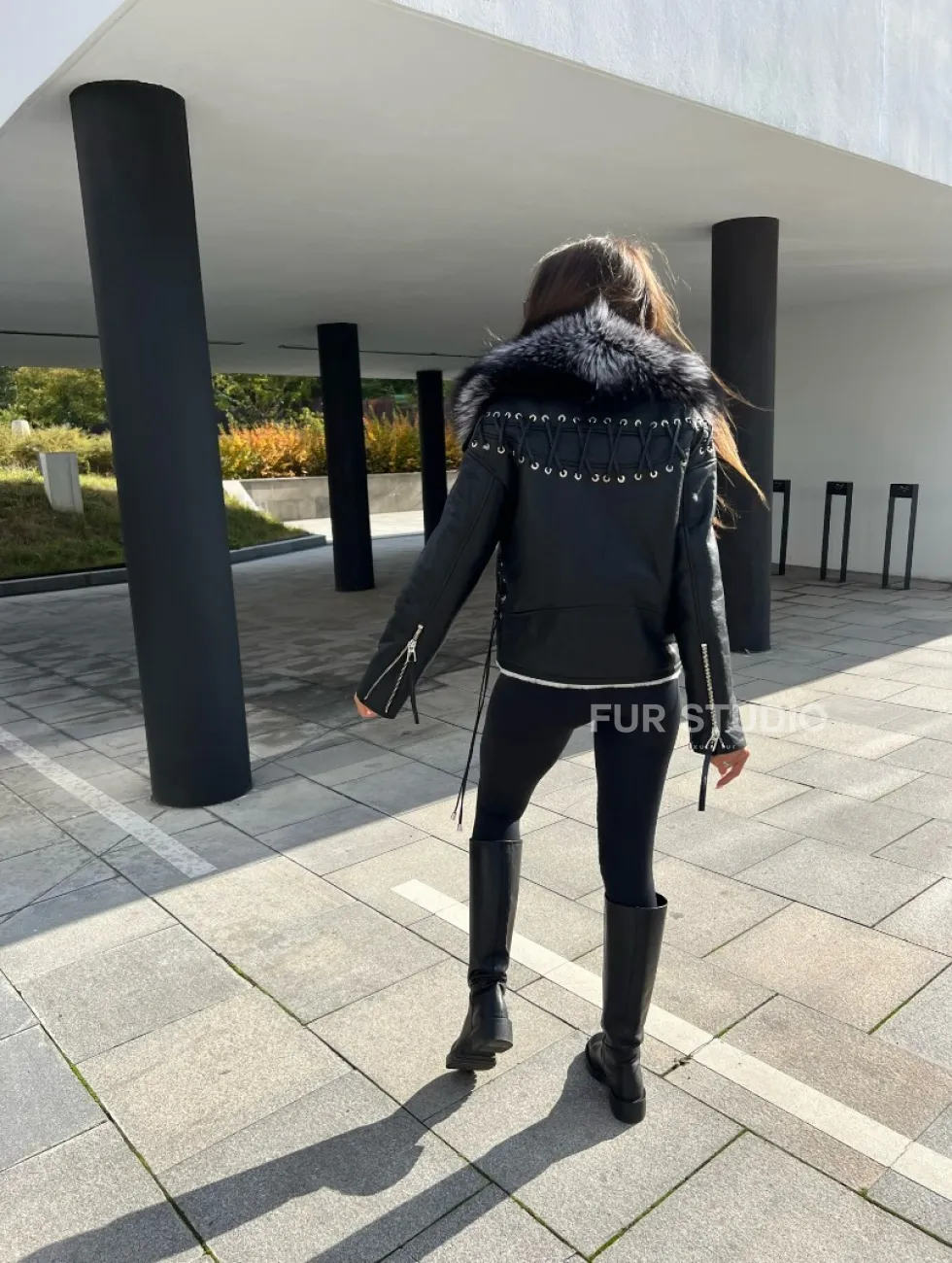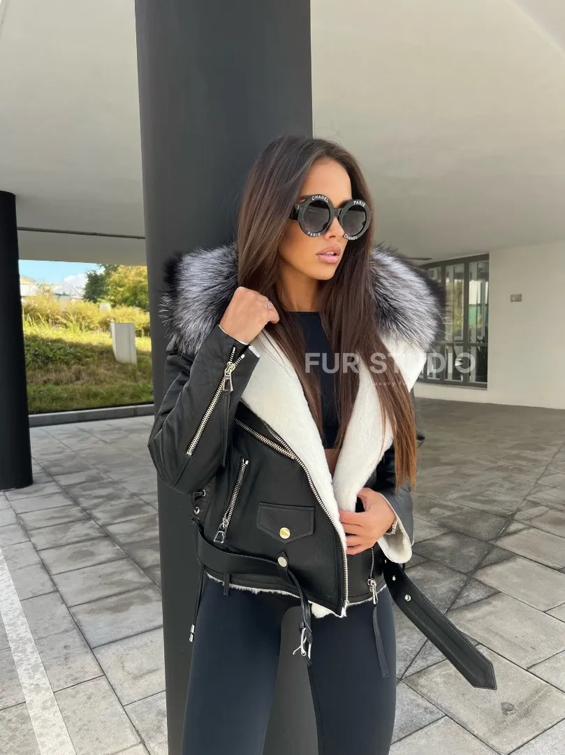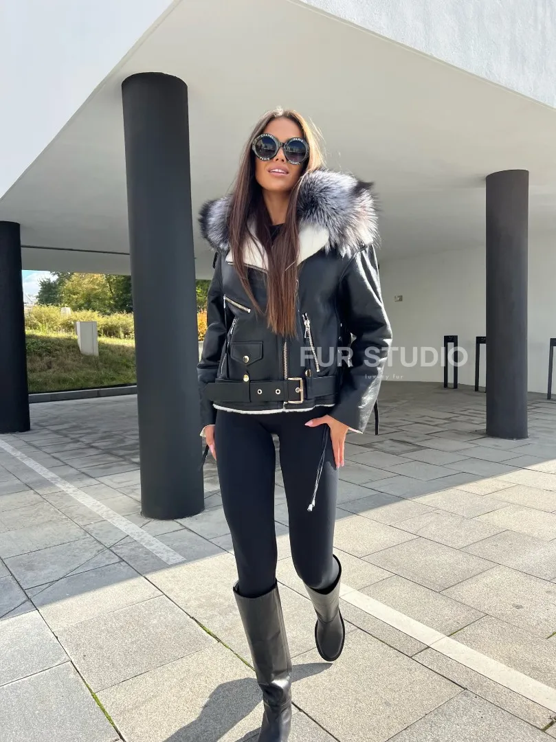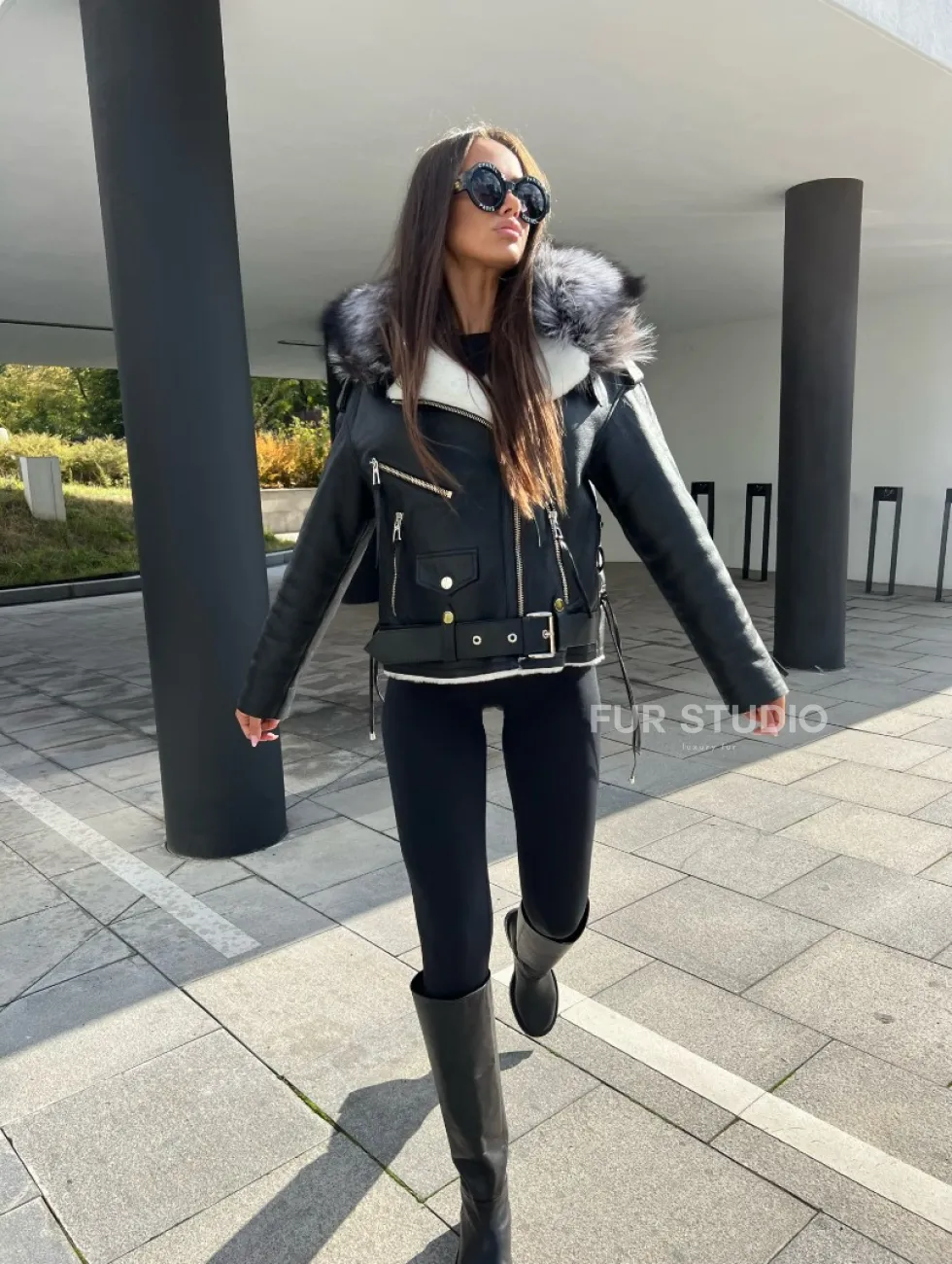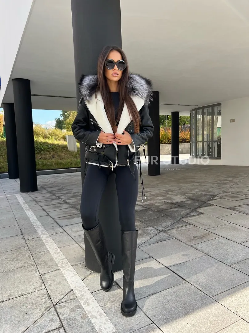 Авиатор из натуральной кожи с воротником из чернобурой лисы – выбор современных женщин. Модель авиатор – тренд последнего десятилетия. Мех стриженой овчины согреет владелицу в холодную погоду. Натуральная кожа приятна на ощупь и неприхотлива в уходе. Оригинальная шнуровка на спине делает образ экстравагантным и необычным. Роскошный воротник из меха чернобурой лисы подчеркивает изящность шеи.