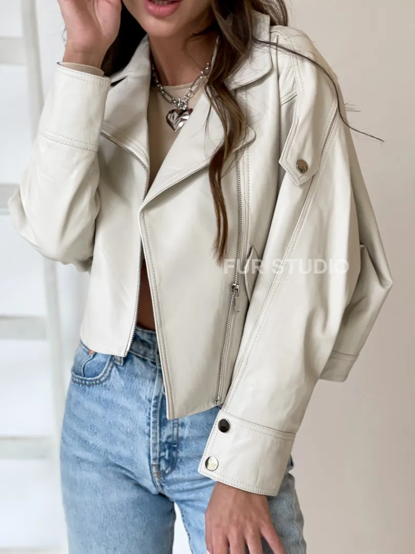Белая короткая кожаная куртка – выбор девушек с изысканным вкусом. Укороченная модель акцентирует внимание на изяществе фигуры. Оригинальный воротник выгодно подчеркнет грациозность шеи. Натуральная кожа приятна телу и практически не ощущается. Изделие можно носить прохладным летом и теплой зимой.