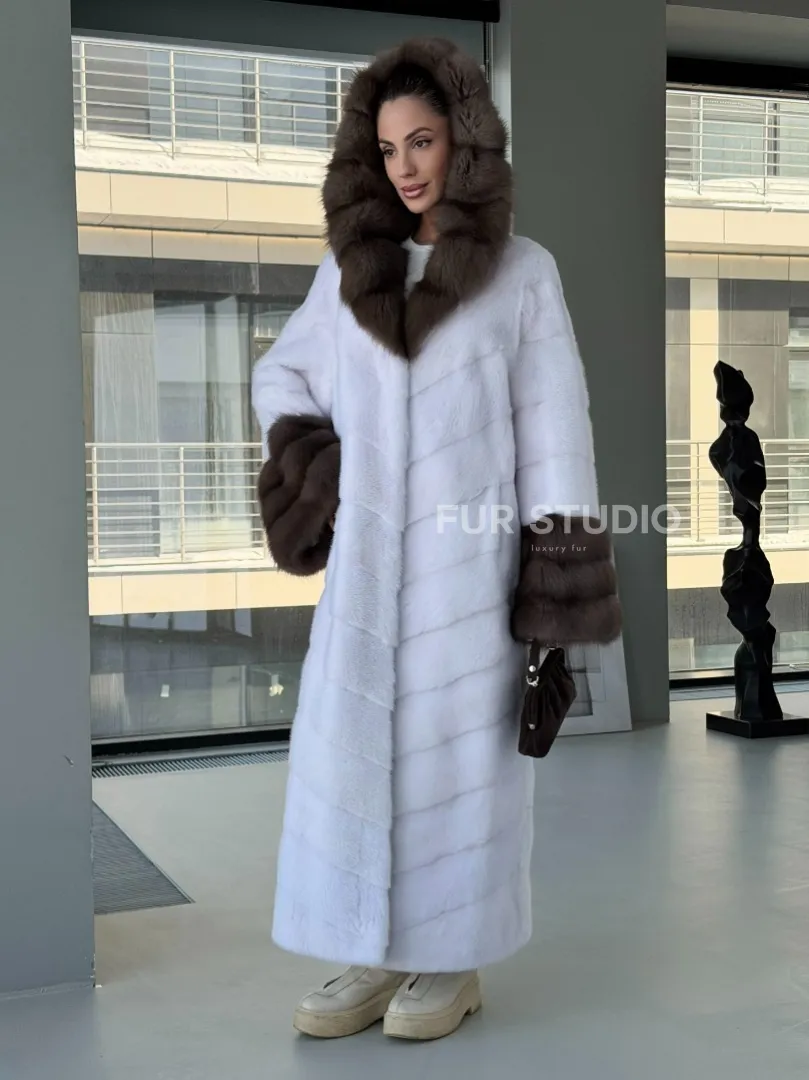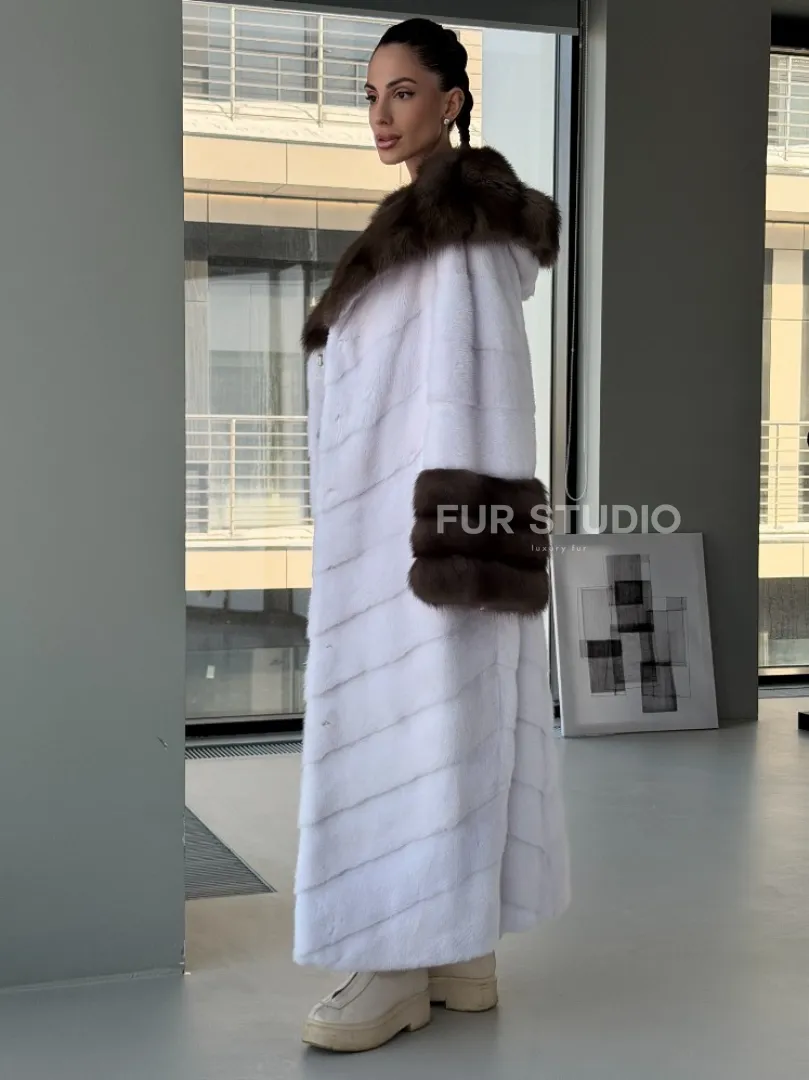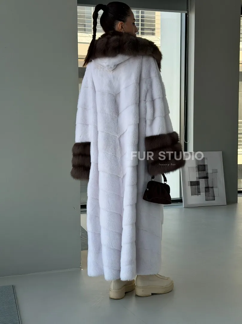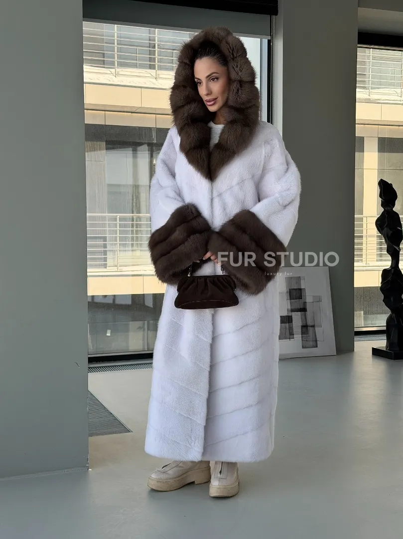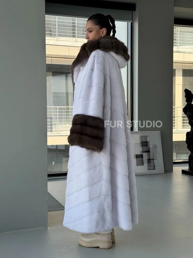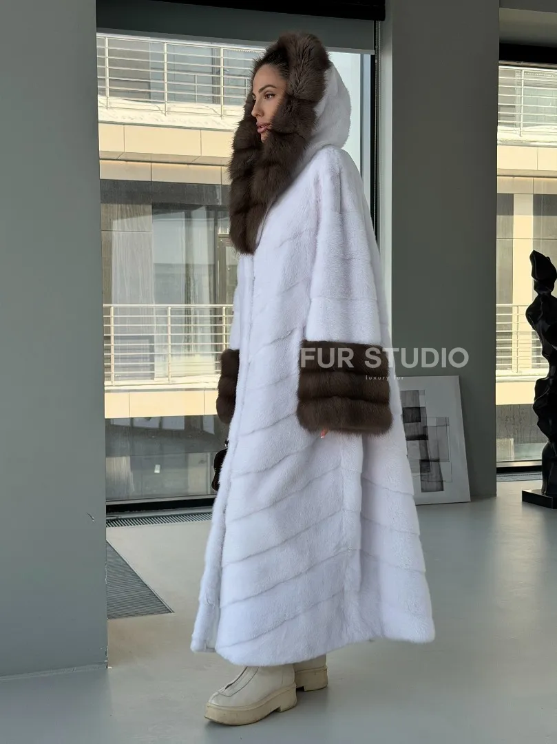 Белая норковая шуба с отделкой из куницы на рукавах и капюшоне доступна для покупки в нашем шоуруме Furs Studio в Москве. У нас так же есть доставка во все города России. Добавьте немного роскоши в свой гардероб с этой шубой, которая будет служить вам многие годы.