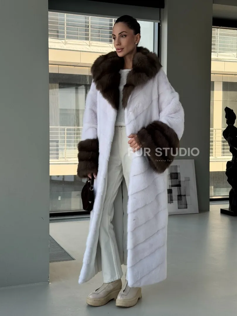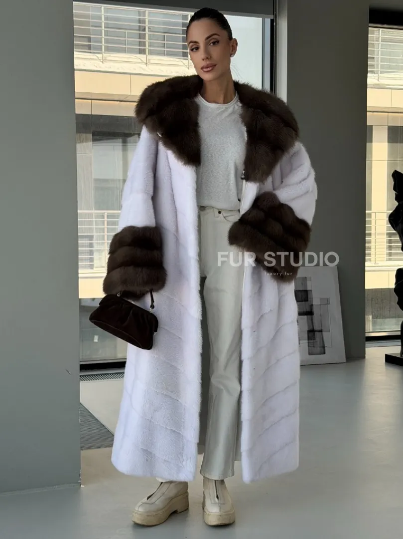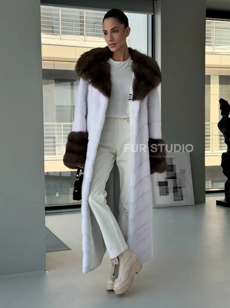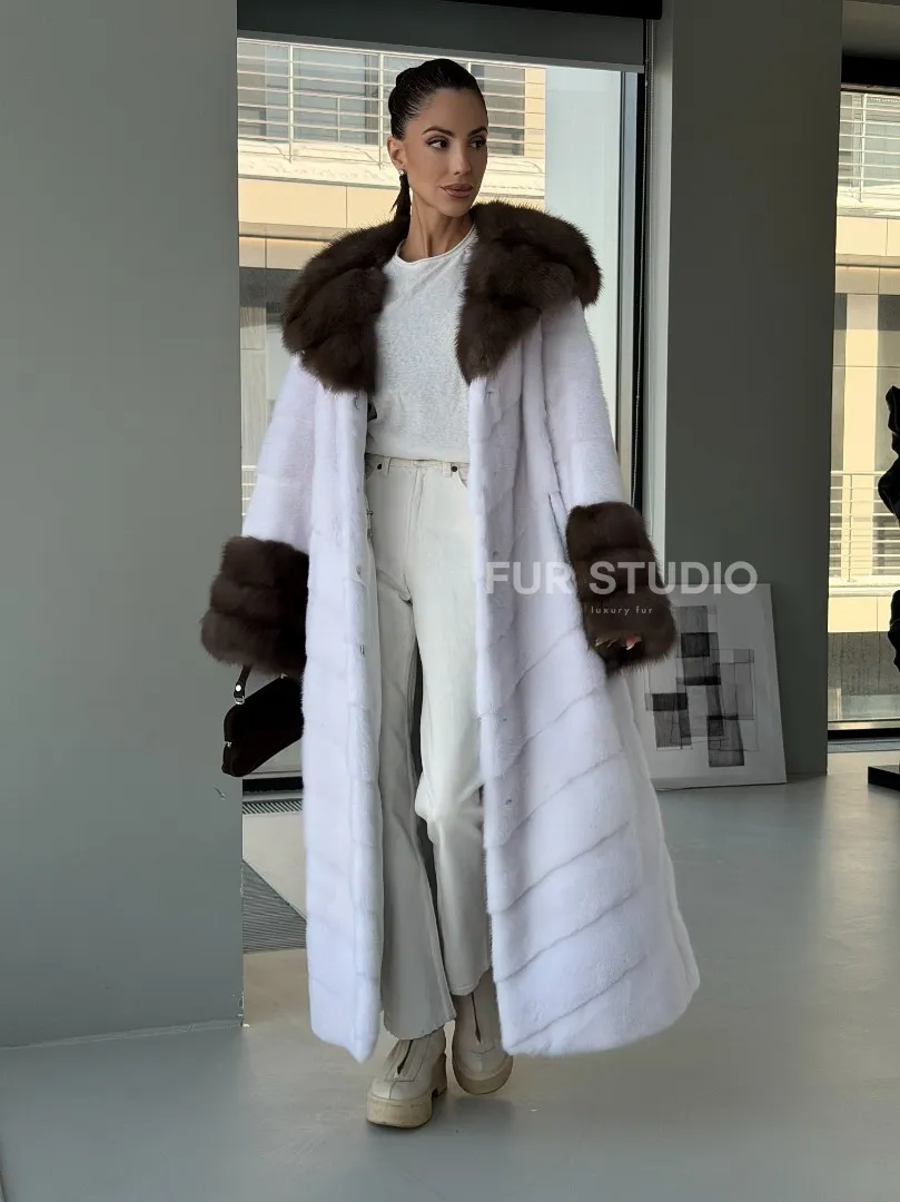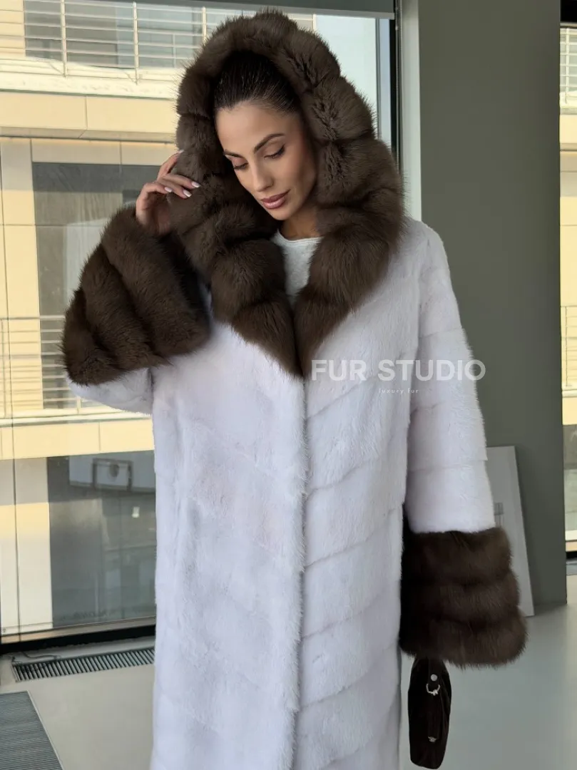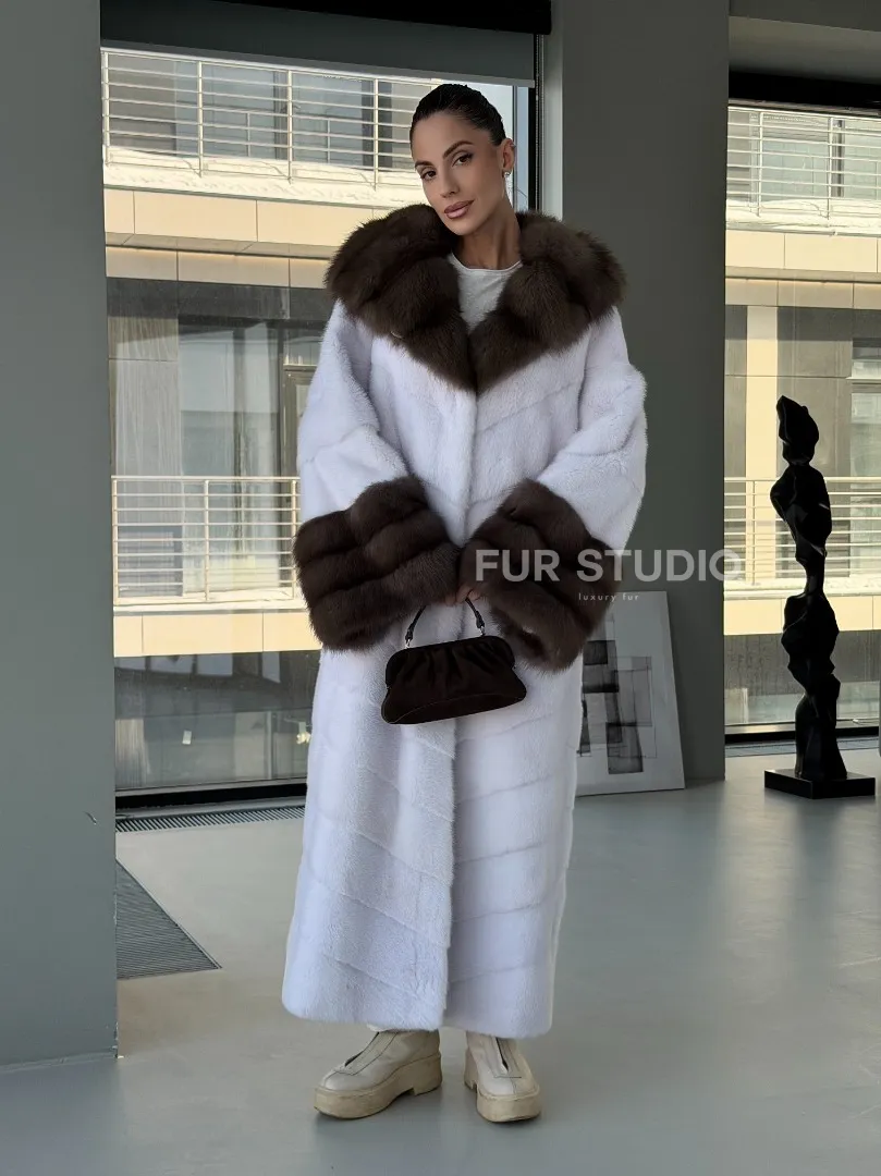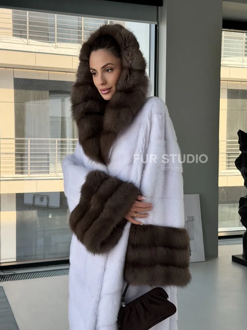 Белая норковая шуба с отделкой из куницы на рукавах и капюшоне доступна для покупки в нашем шоуруме Furs Studio в Москве. У нас так же есть доставка во все города России. Добавьте немного роскоши в свой гардероб с этой шубой, которая будет служить вам многие годы.