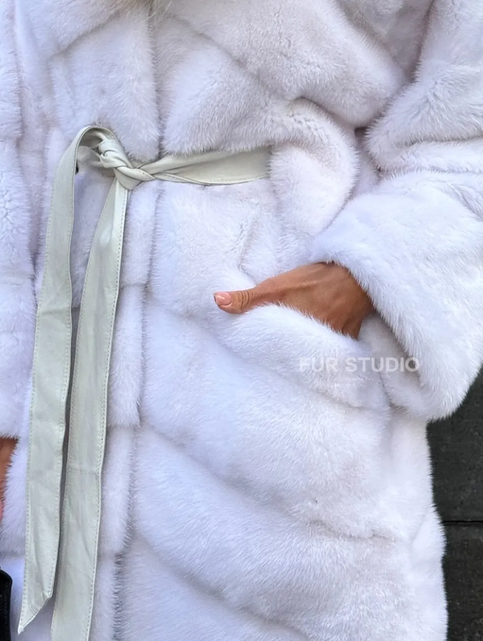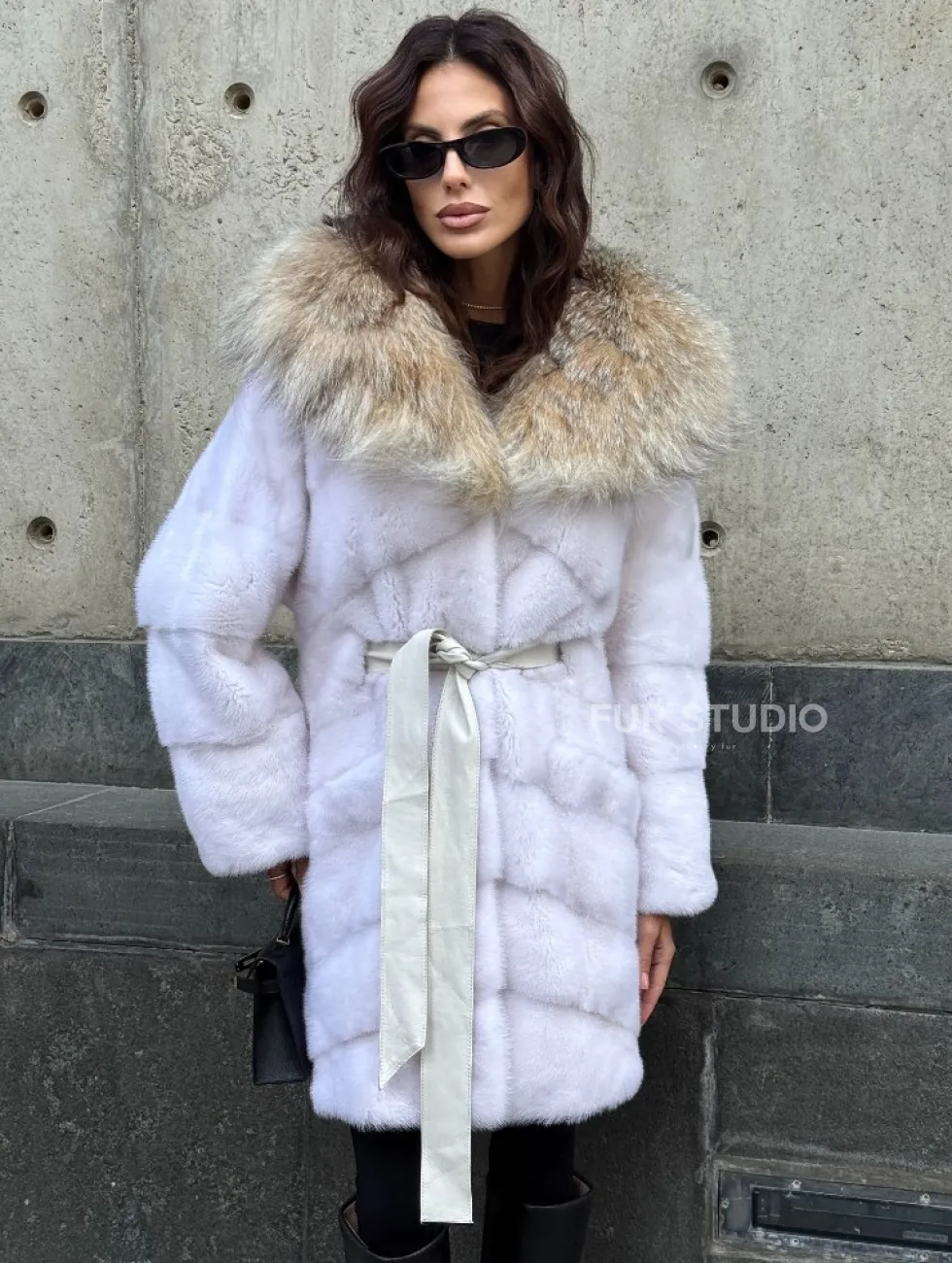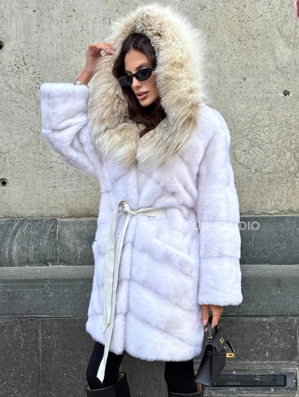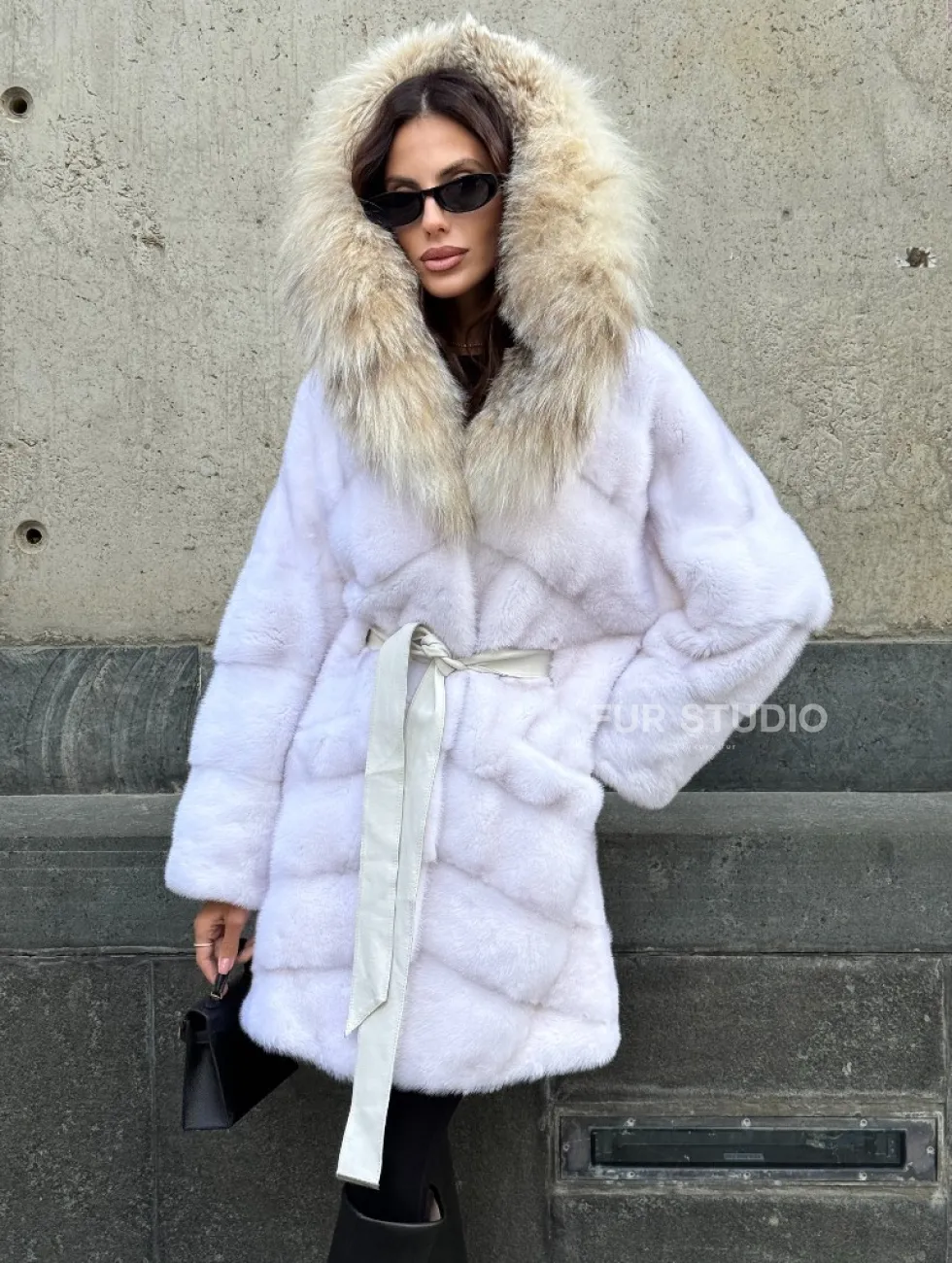 Белая норковая шуба средней длины с капюшоном из рыси 102102