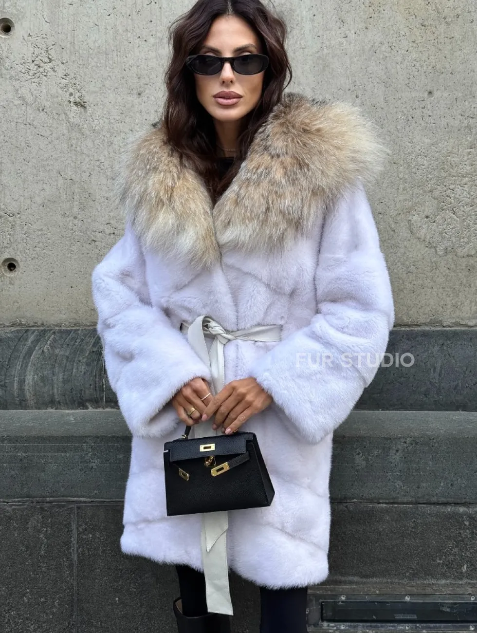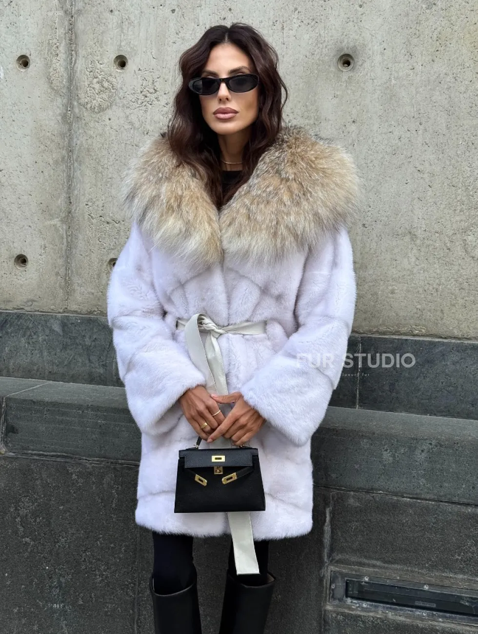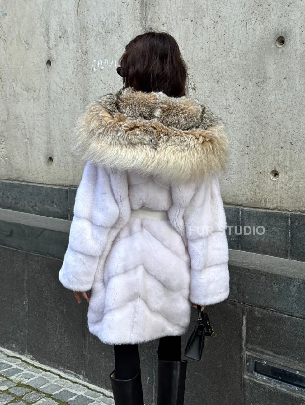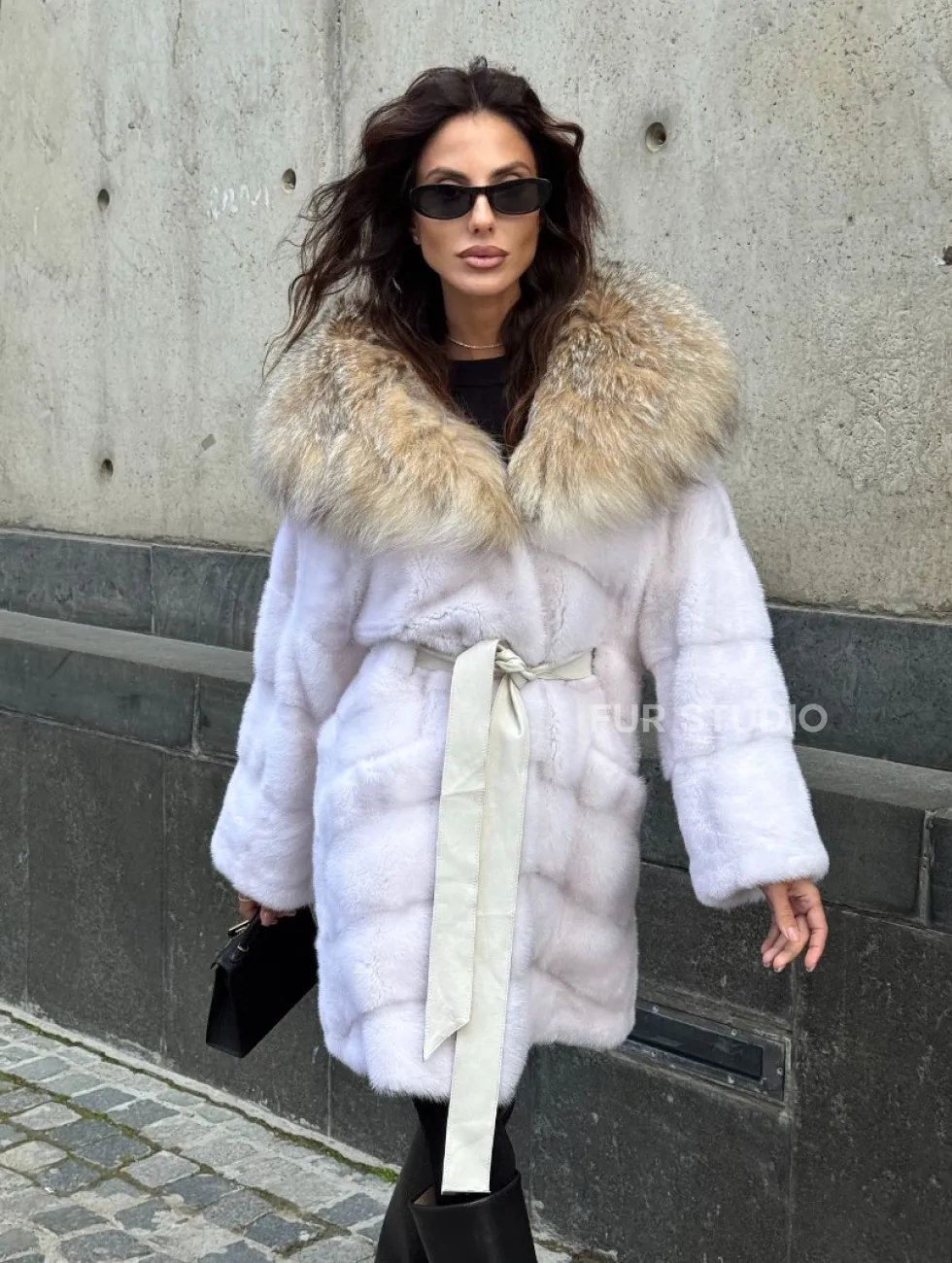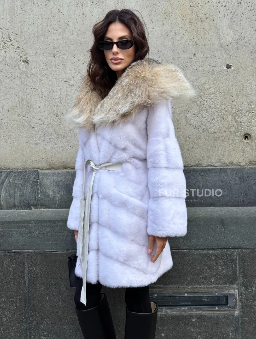 Белая норковая шуба средней длины с капюшоном из рыси 102102