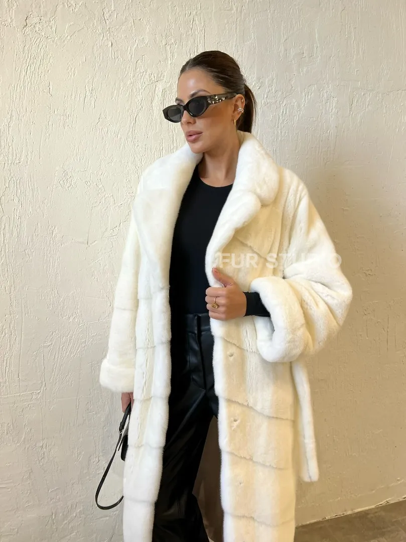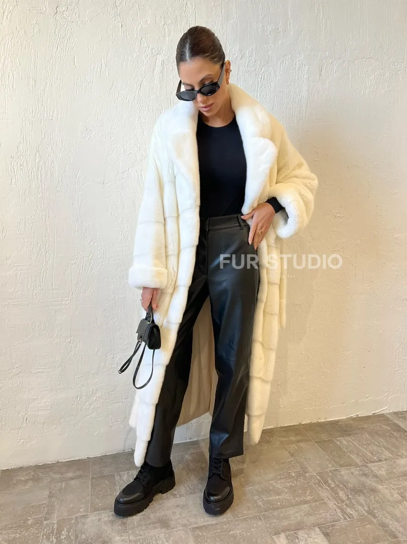 Роскошные рукава добавляют изысканности модели. Шикарные карманы позаботятся о комфорте ручек. Миниатюрная сумочка и грубая обувь сделают ваш образ гармоничным. Качество изделия будет радовать многие годы. Купить белую шубу из плюшевой норки с английским воротником могут дамы, которые обладают безукоризненным вкусом стиля.
