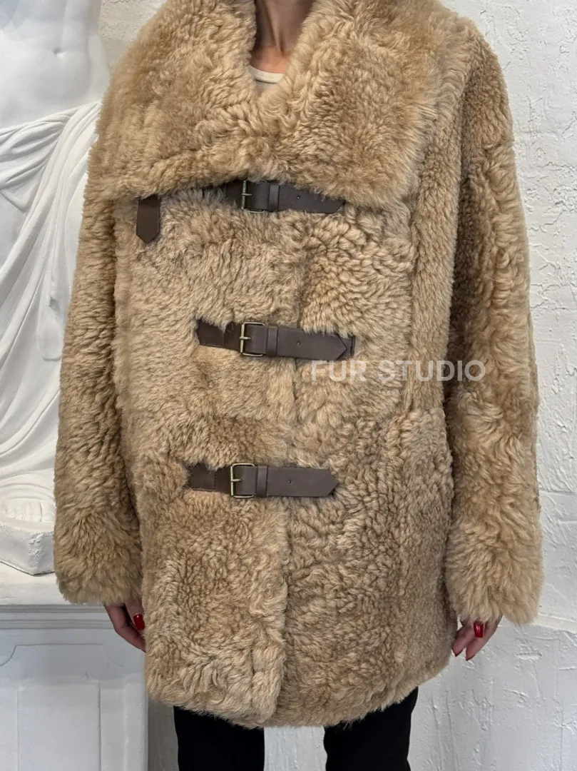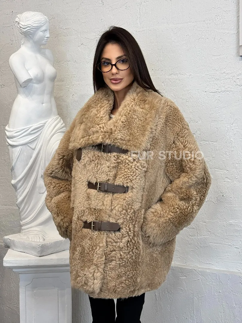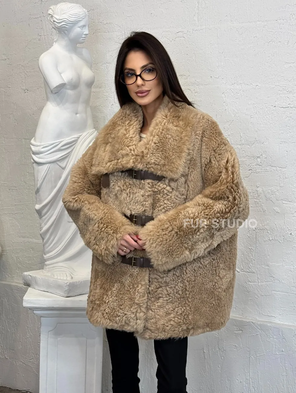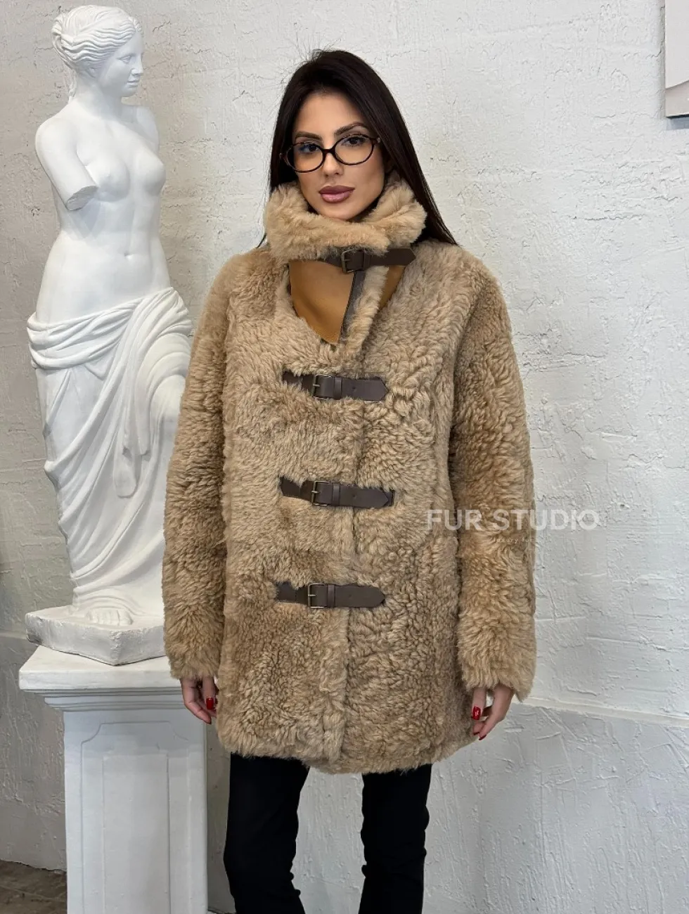 Бежевая женская дубленка из натуральной овчины Тиградо средней длины с отложным воротником доступна для покупки в нашем шоуруме Furs Studio в Москве, а также предлагается удобная доставка во все города России. Обогатите свой гардероб этой дубленкой, которая прослужит вам многие годы, добавив немного роскоши в ваш повседневный образ.