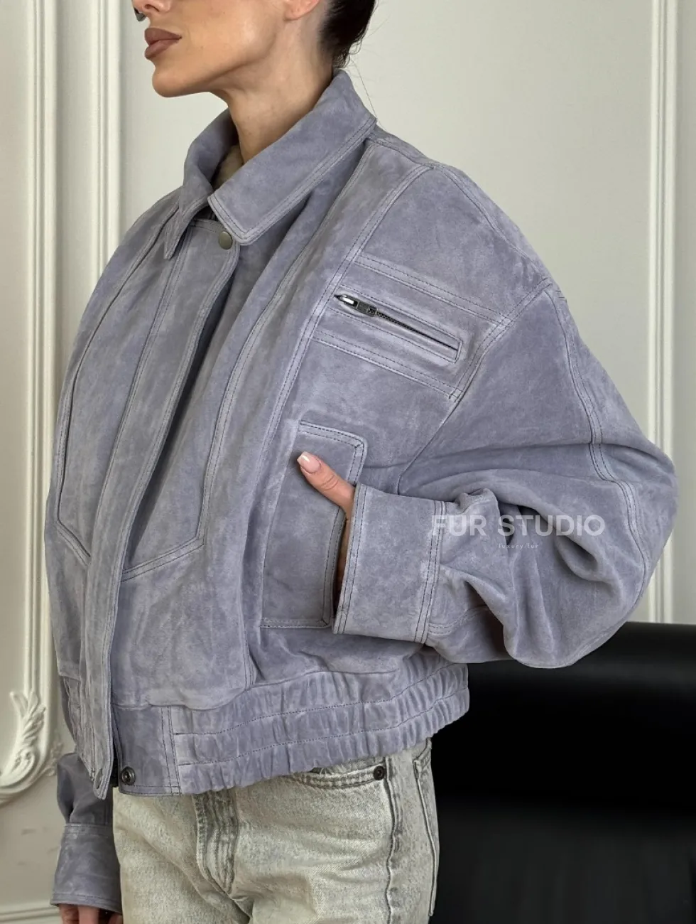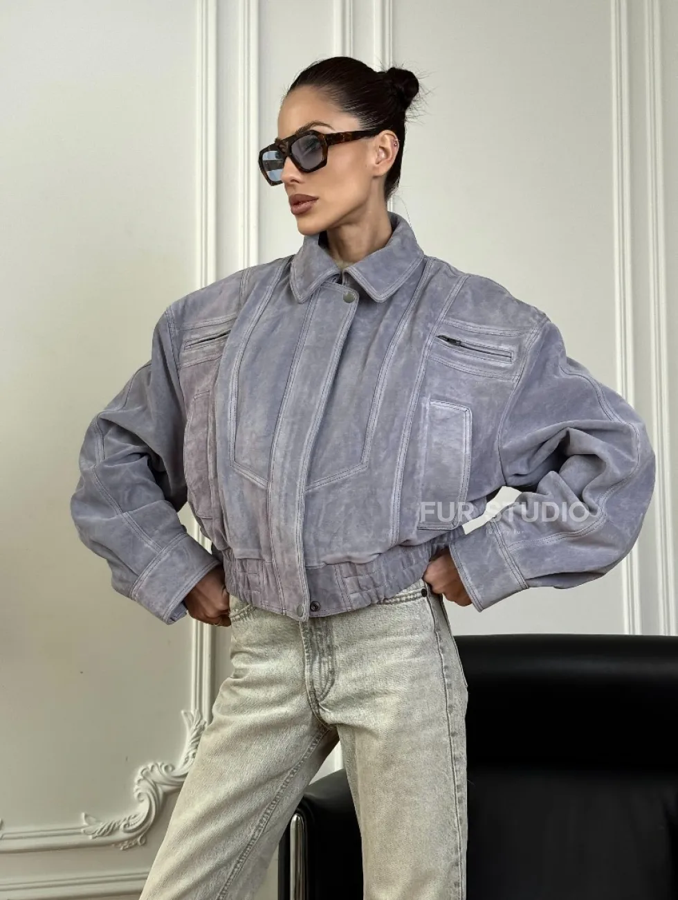 Восхититесь элегантностью и несравненным комфортом с нашей эксклюзивной коллекцией кожаных изделий. Изготовленная из первоклассной натуральной кожи, Бомбер - куртка весенняя оверсайз из натуральной кожи (замши) Grey blue не только согреет вас в прохладные дни, но и подчеркнет ваш изысканный вкус. Уникальный дизайн и высокое качество делают наши представленные образцы идеальным выбором для утончённых образов.