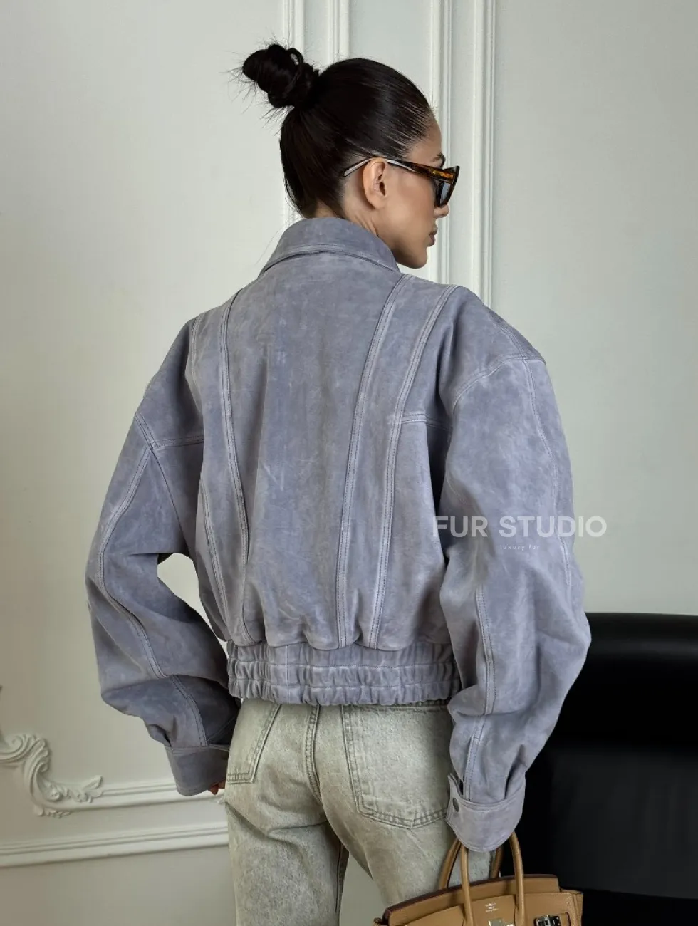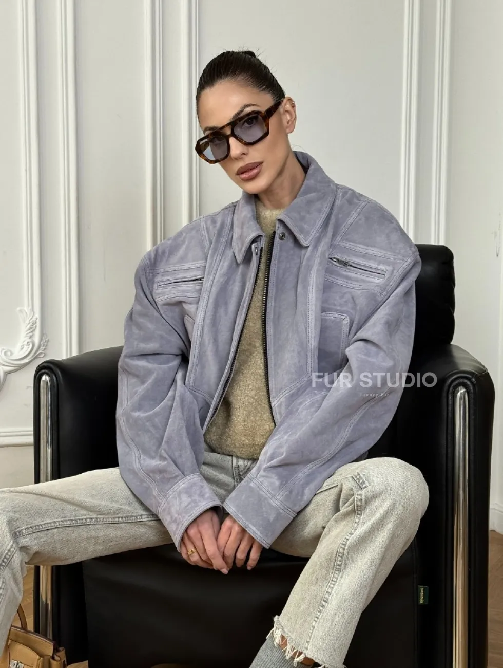 Бомбер - куртка весенняя оверсайз из натуральной кожи (замши) Grey blue доступна для покупки в нашем шоуруме Furs Studio в Москве, где также предоставляется удобная доставка во все города России.