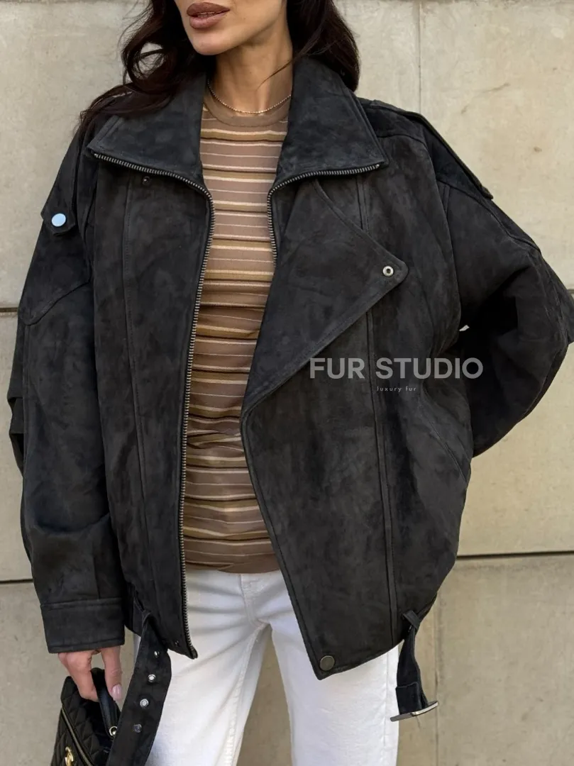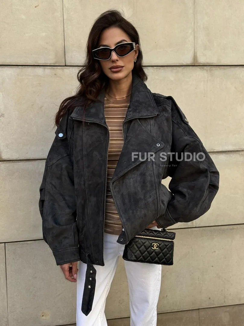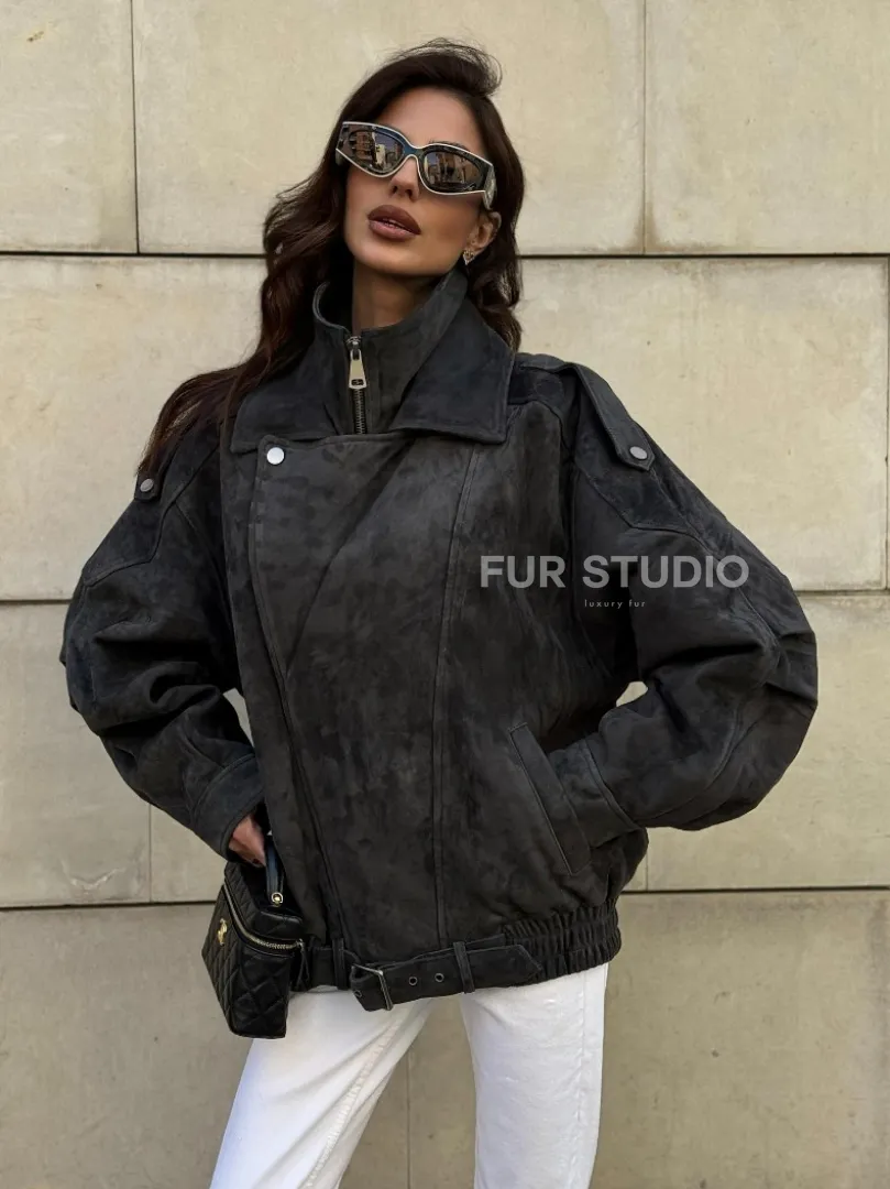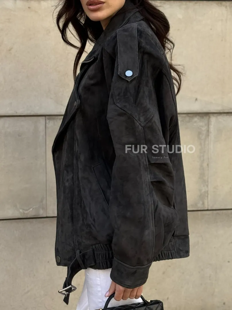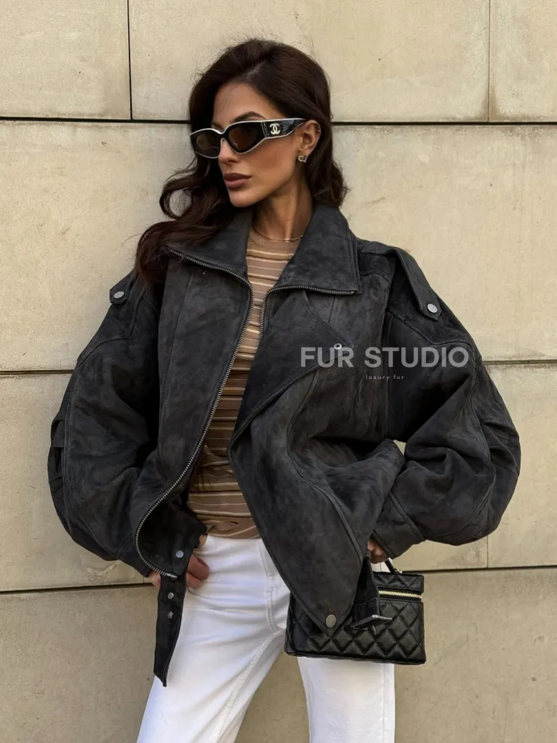 Бомбер оверсайз из замши Grey с двойным воротником и карманами доступна для покупки в нашем шоуруме Furs Studio в Москве, где также предоставляется удобная доставка во все города России.