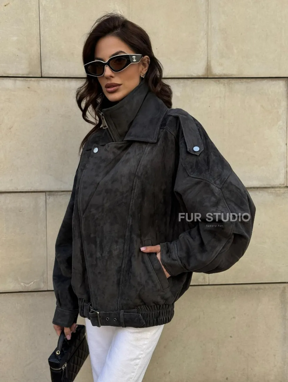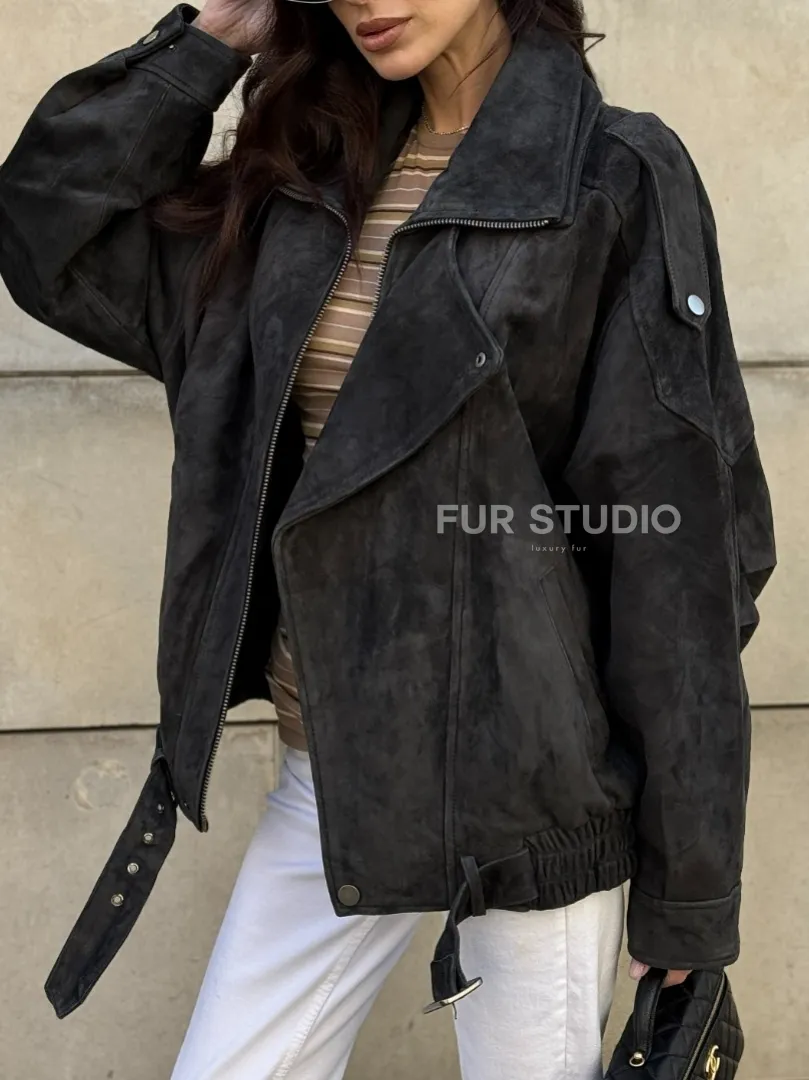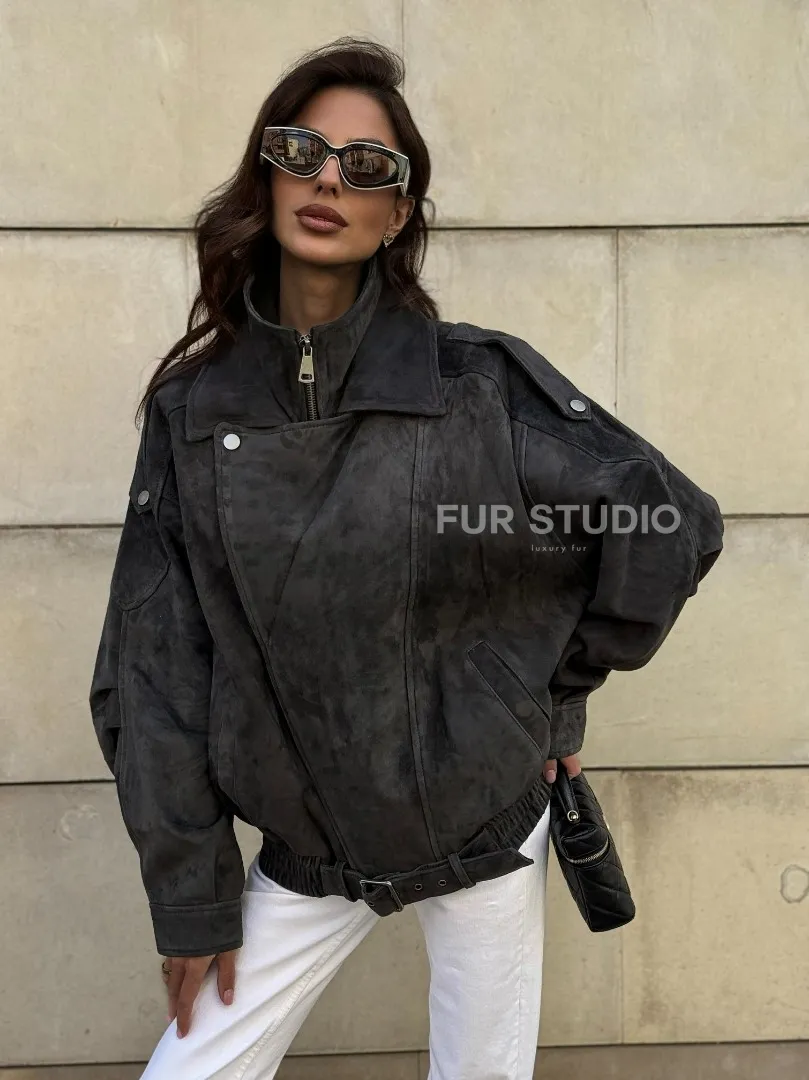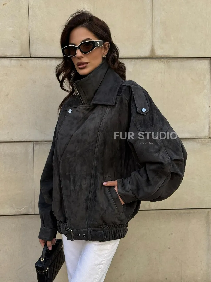 Бомбер оверсайз из замши Grey с двойным воротником и карманами доступна для покупки в нашем шоуруме Furs Studio в Москве, где также предоставляется удобная доставка во все города России.