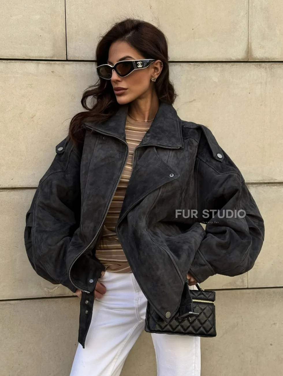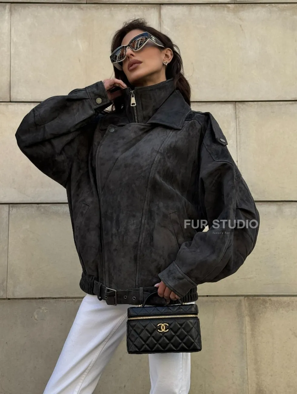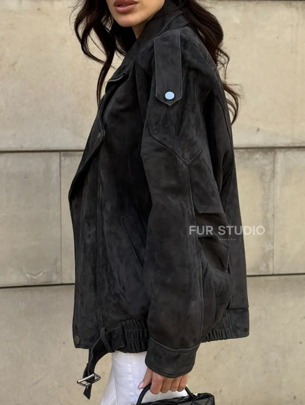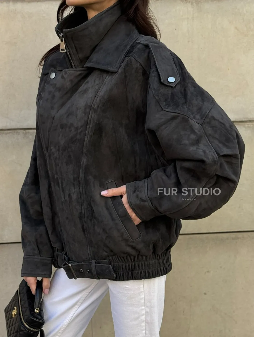 Бомбер оверсайз из замши Grey с двойным воротником и карманами доступна для покупки в нашем шоуруме Furs Studio в Москве, где также предоставляется удобная доставка во все города России.