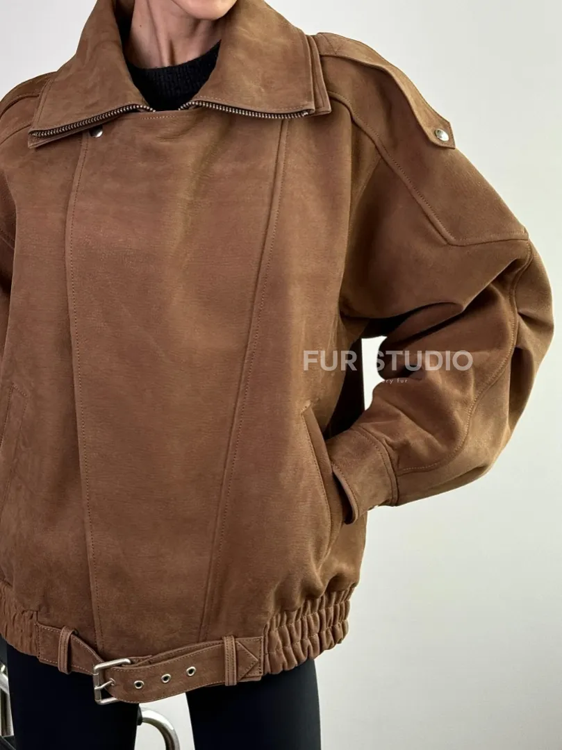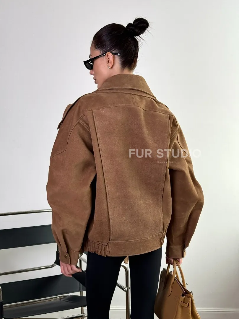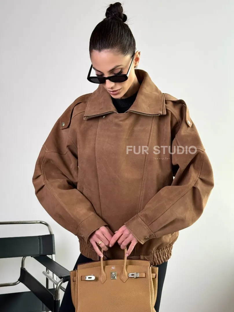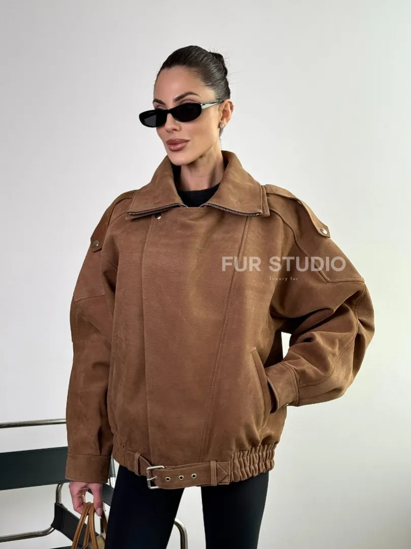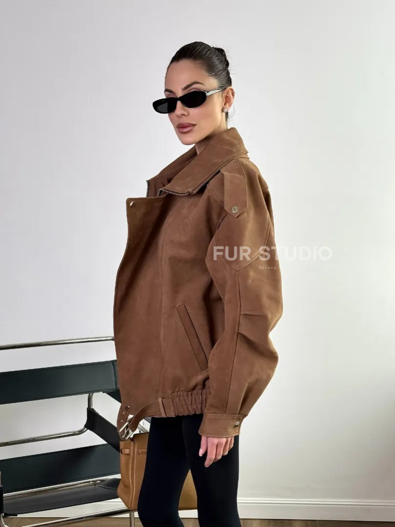 Бомбер "Oversize" из натуральной кожи (замши) Toffee с двойным воротником и карманами доступна для покупки в нашем шоуруме Furs Studio в Москве, где также предоставляется удобная доставка во все города России.