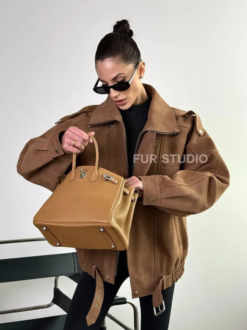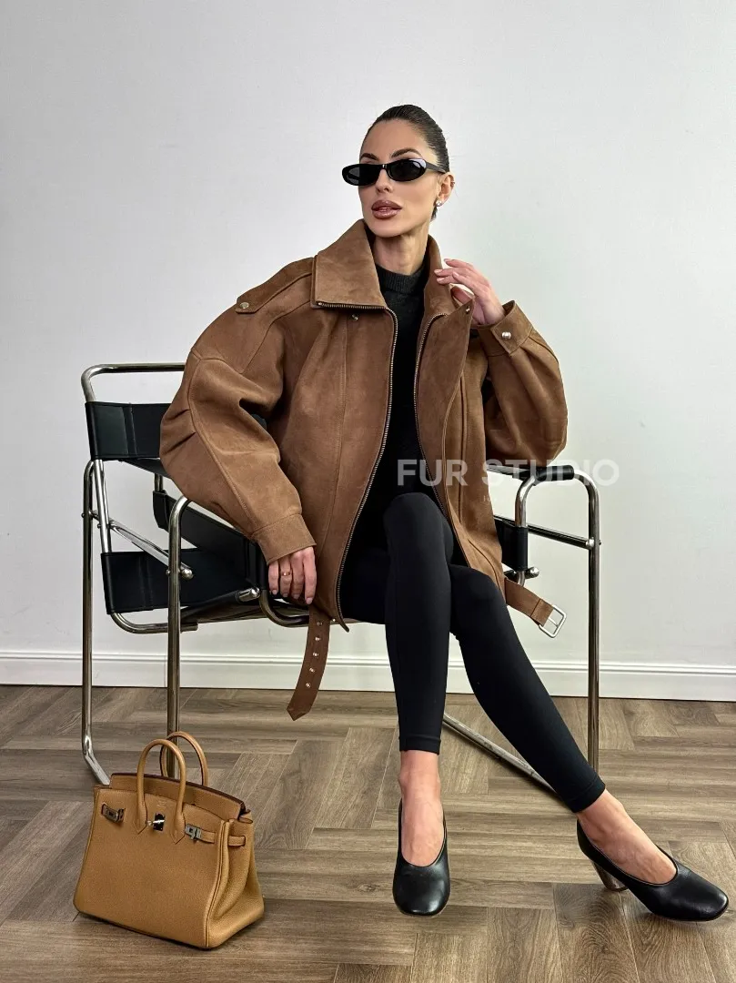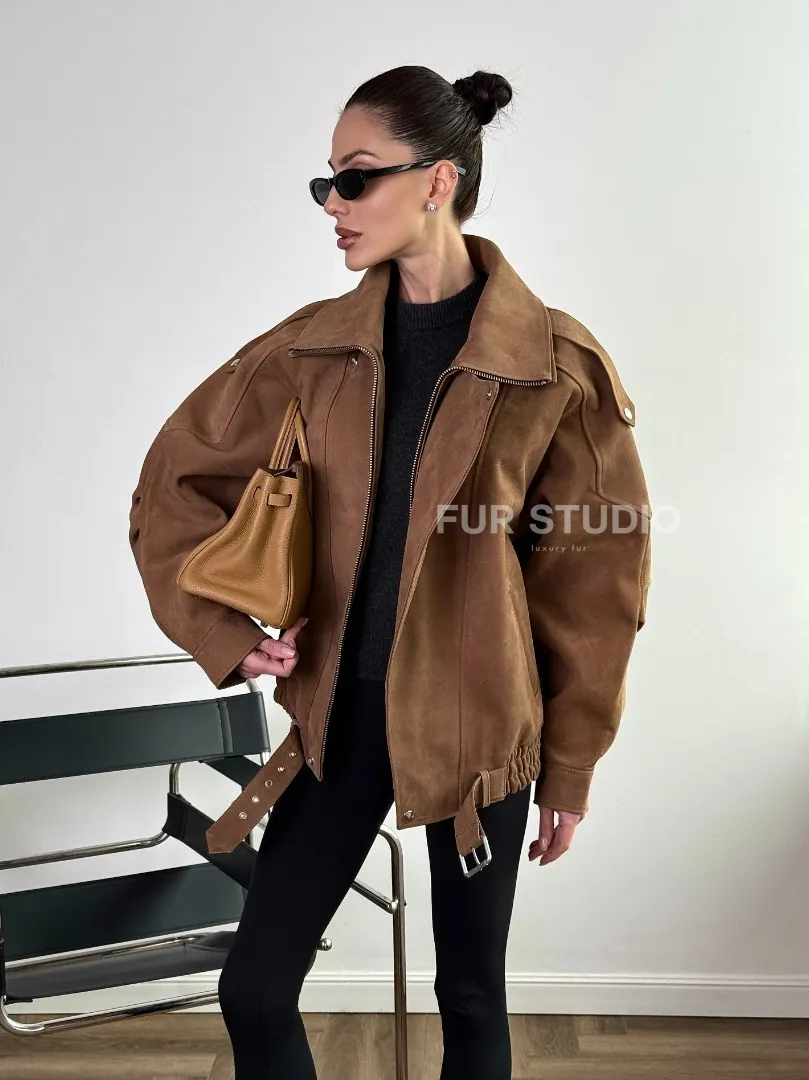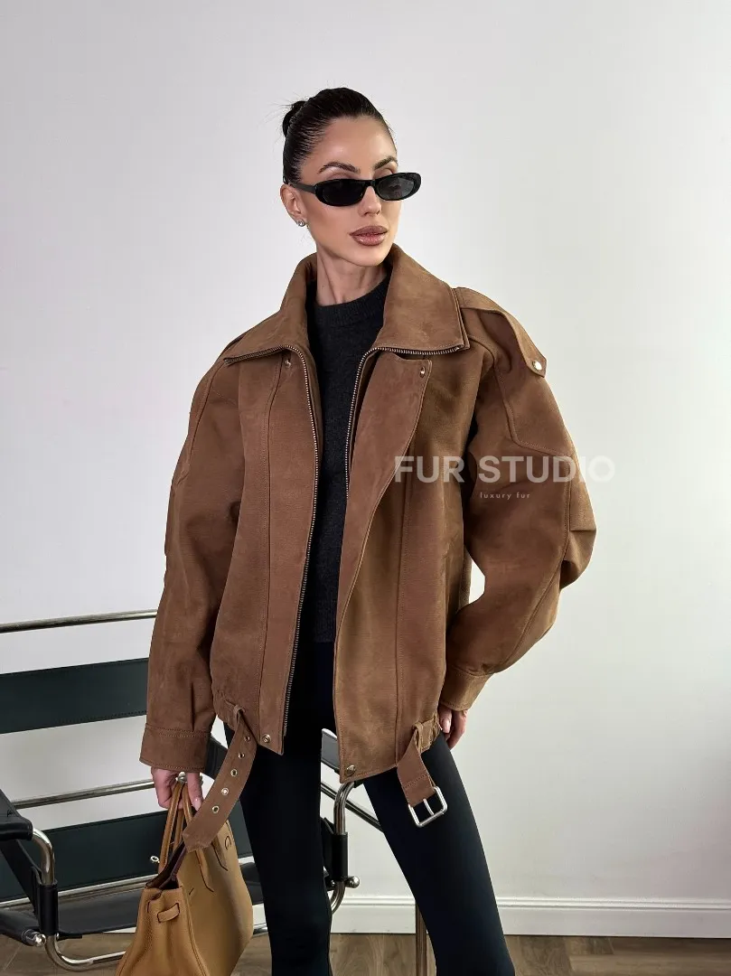 Восхититесь элегантностью и несравненным комфортом с нашей эксклюзивной коллекцией кожаных изделий. Изготовленная из первоклассной натуральной кожи, Бомбер "Oversize" из натуральной кожи (замши) Toffee с двойным воротником и карманами не только согреет вас в прохладные дни, но и подчеркнет ваш изысканный вкус. Уникальный дизайн и высокое качество делают наши представленные образцы идеальным выбором для утончённых образов.