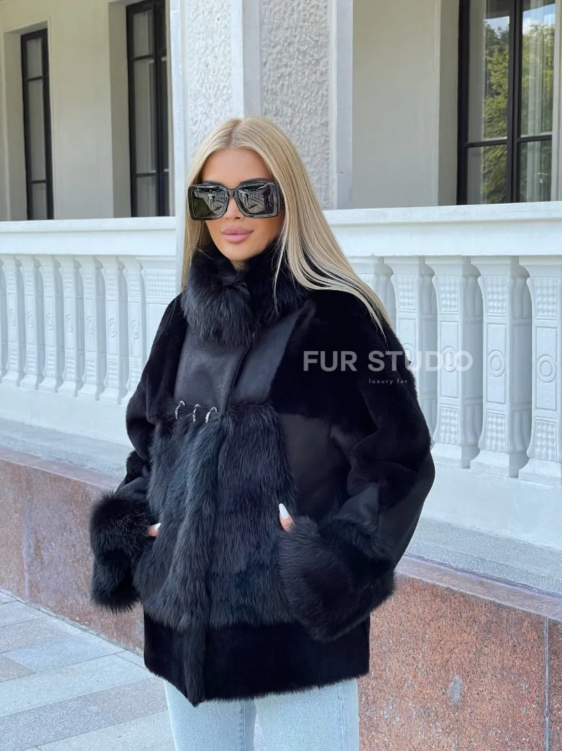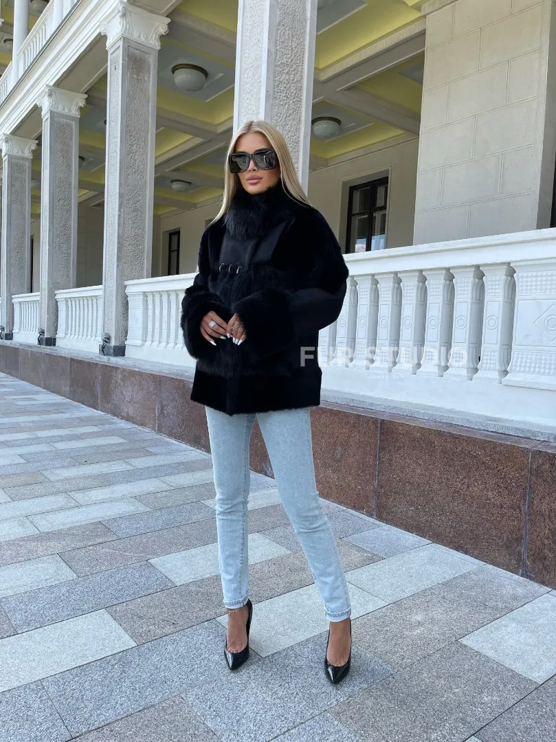 Черная дубленка из натуральной овчины. Модель предлагается в размерах от 42 до . Оптимальная длина моделей 60-65 см подчеркивает линии вашей фигуры. Эта дубленка станет неотъемлемой частью гардероба для тех, кто предпочитает роскошь и утонченность натуральной кожи.