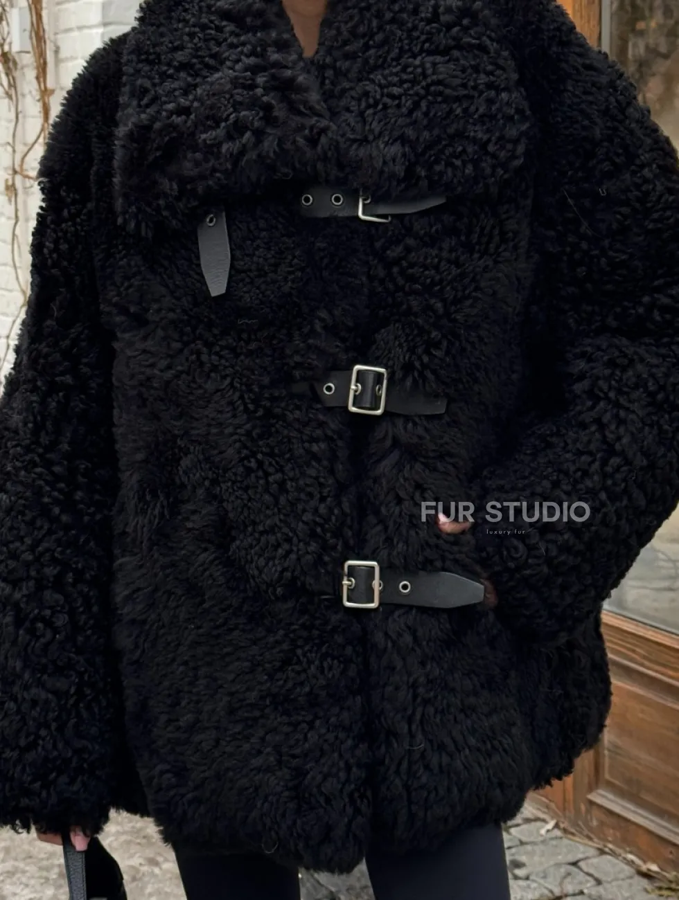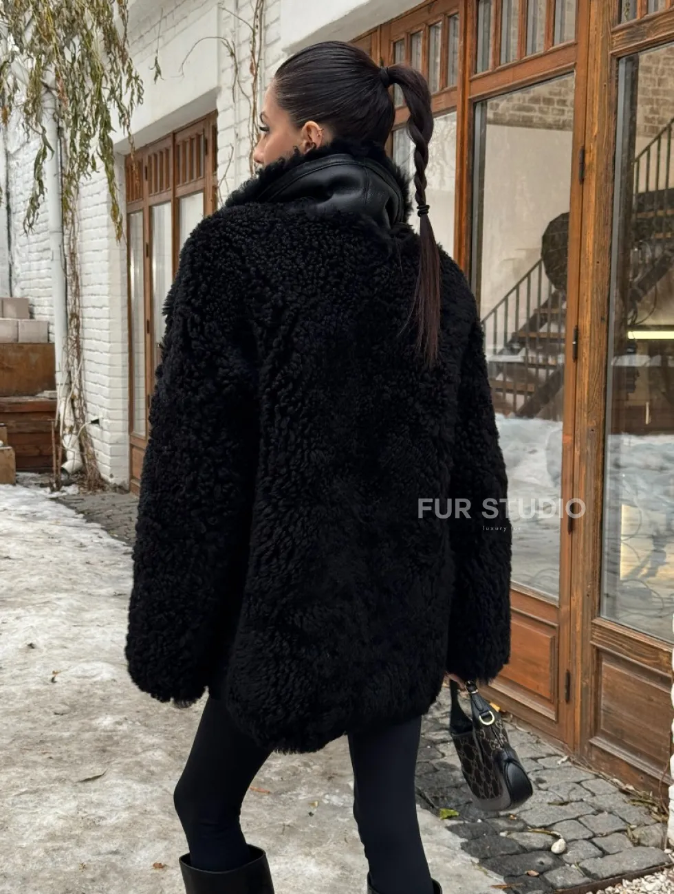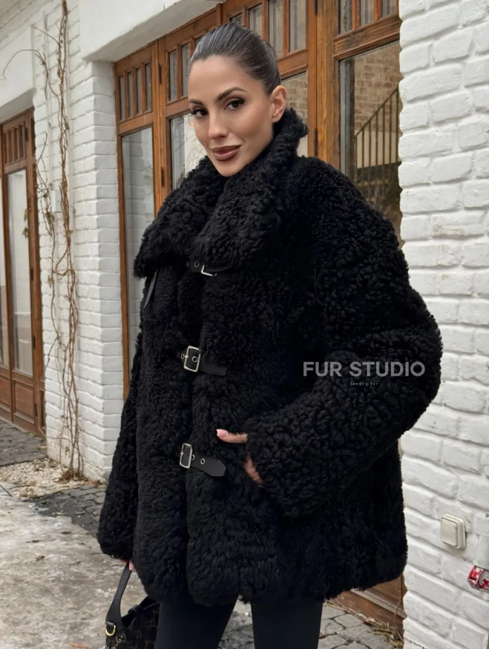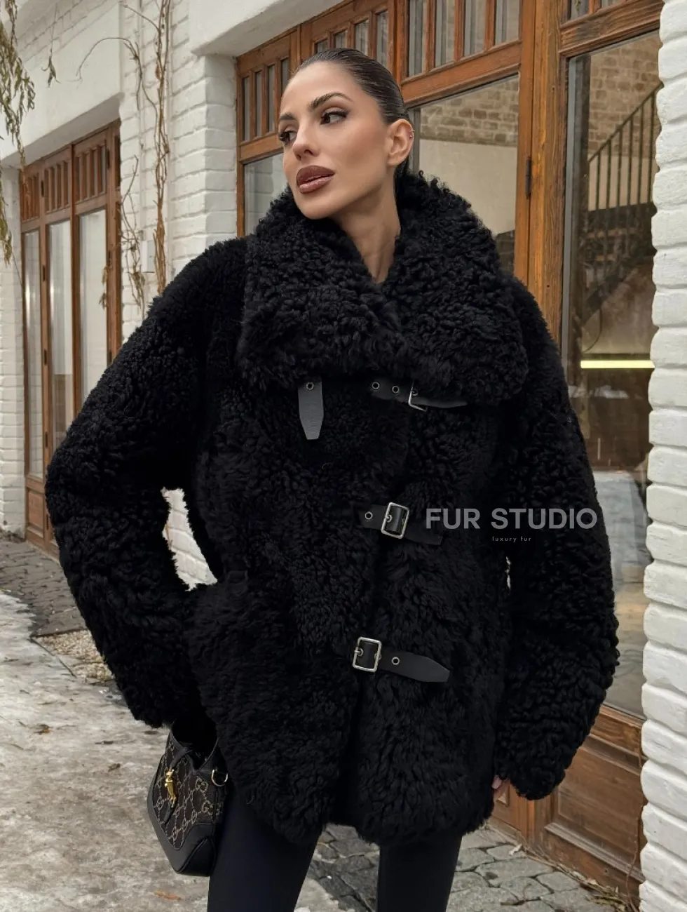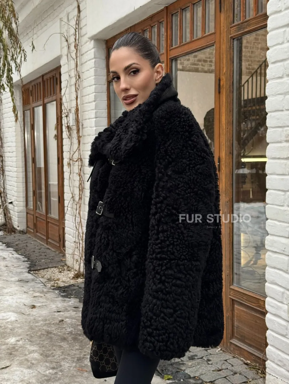 Черная дубленка средней длины из овчины тиградо " Дафлкот ". Модель предлагается в размерах от 42 до 50. Оптимальная длина моделей 70-75 см подчеркивает линии вашей фигуры. Эта дубленка станет неотъемлемой частью гардероба для тех, кто предпочитает роскошь и утонченность натуральной кожи.