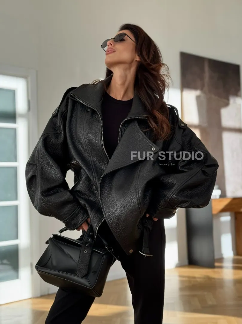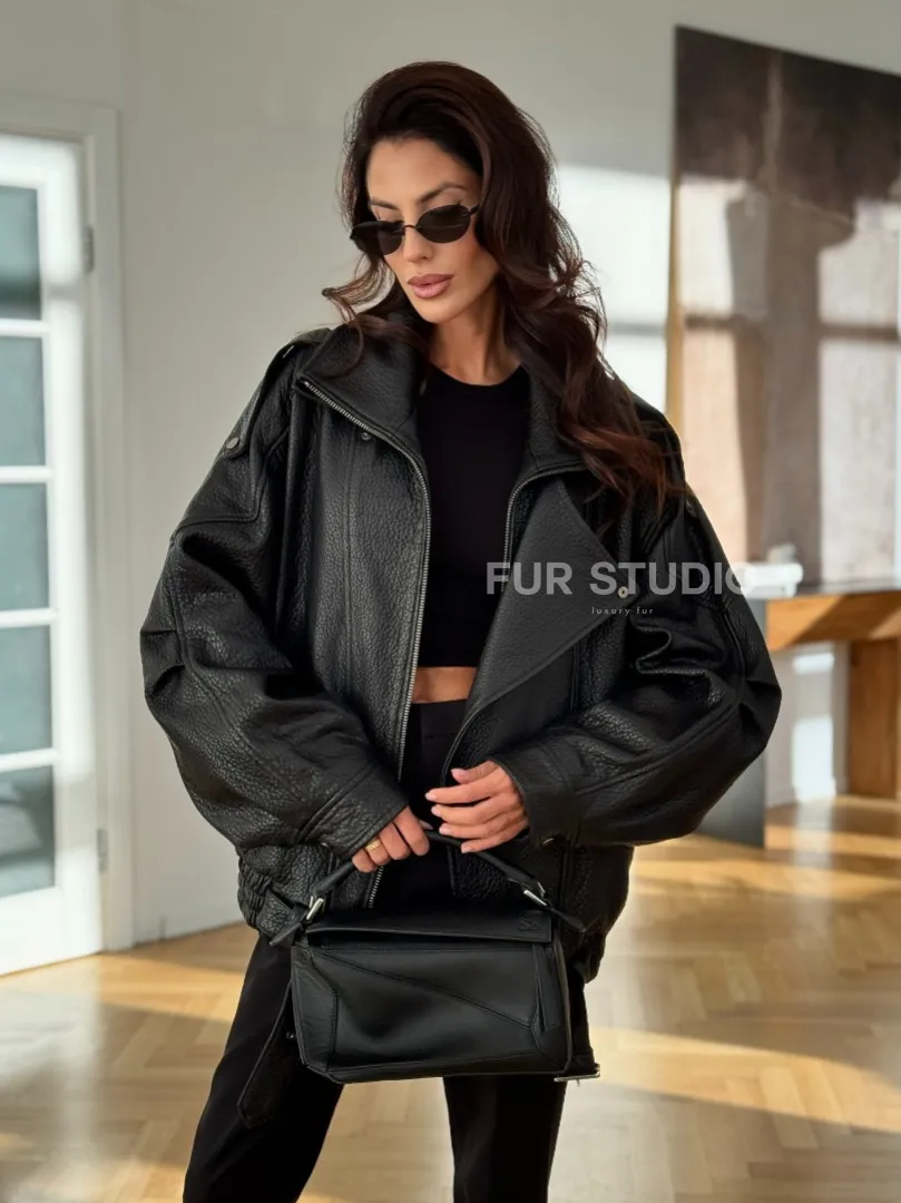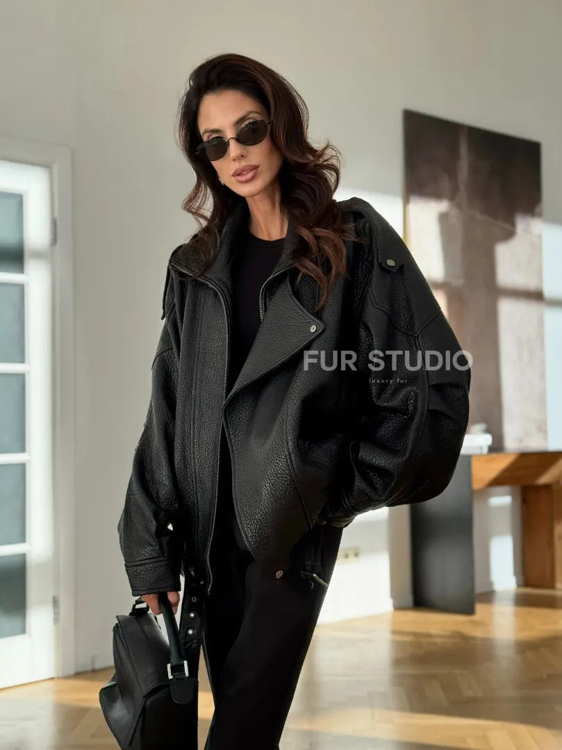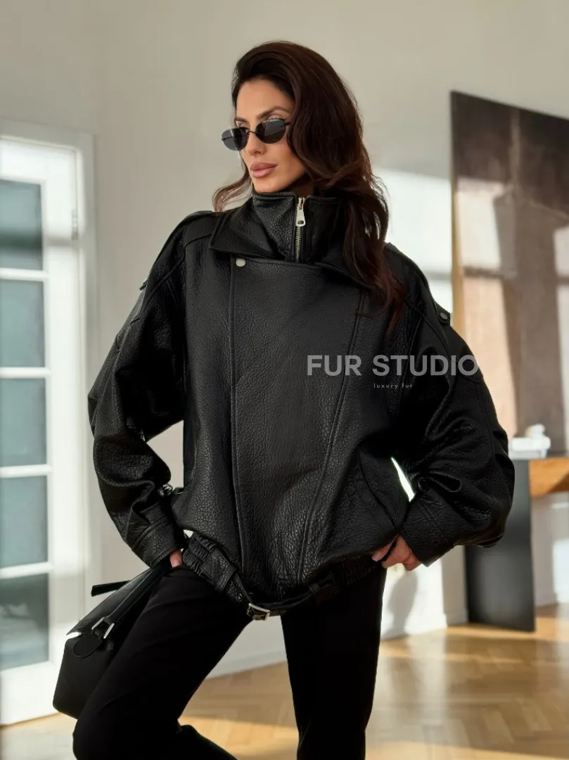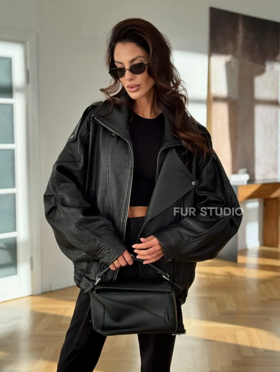 Черная кожаная куртка доступна для покупки в нашем шоуруме Furs Studio в Москве, где также предоставляется удобная доставка во все города России.