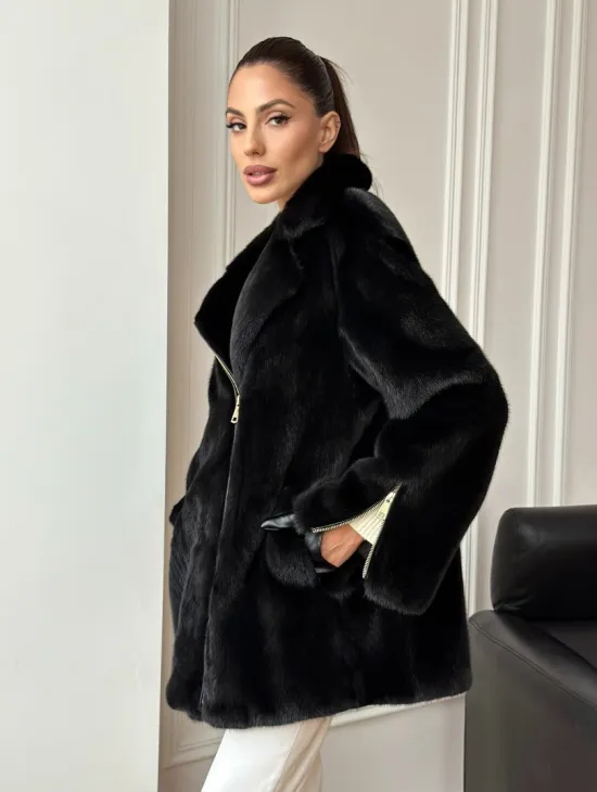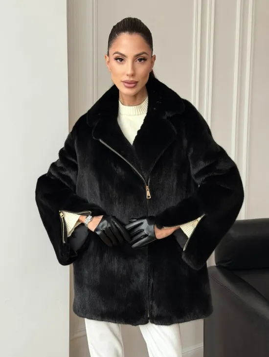 Материал выбранной модели — аукционная норка, доступна в цвете черный. Куртка предлагается в разнообразии размеров, от S до XL, а ее длина составляет 60-65 см, что выигрышно подчеркивает вашу фигуру. Этот вариант идеально подходит для тех, кто ценит роскошь и утонченность натуральных материалов.