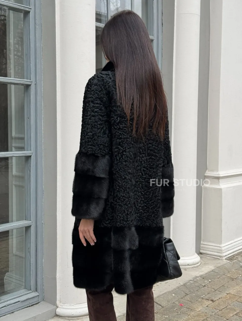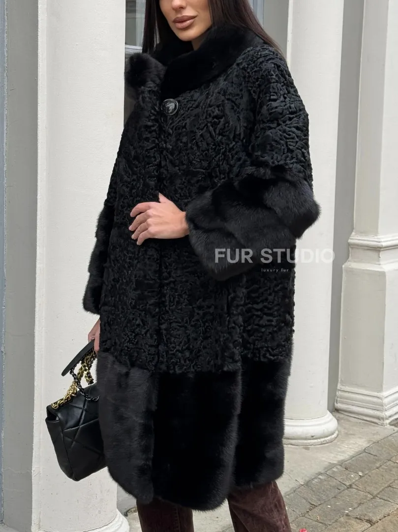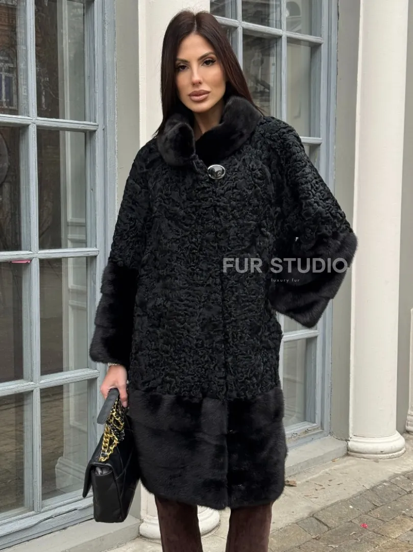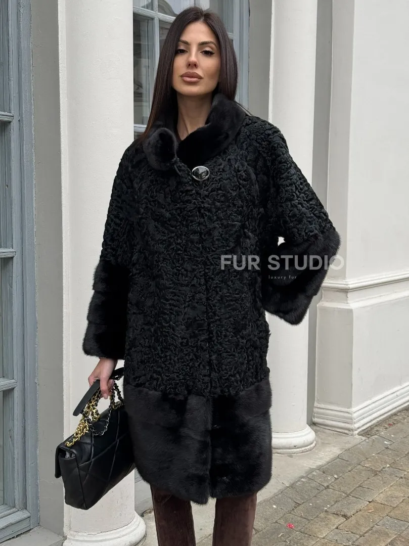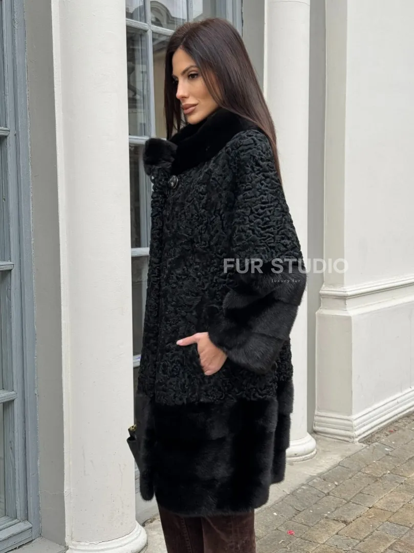 Черная шуба из меха каракульчи с отделкой из меха норки доступна для покупки в нашем шоуруме Furs Studio в Москве. У нас так же есть доставка во все города России. Добавьте немного роскоши в свой гардероб с этой шубой, которая будет служить вам многие годы.