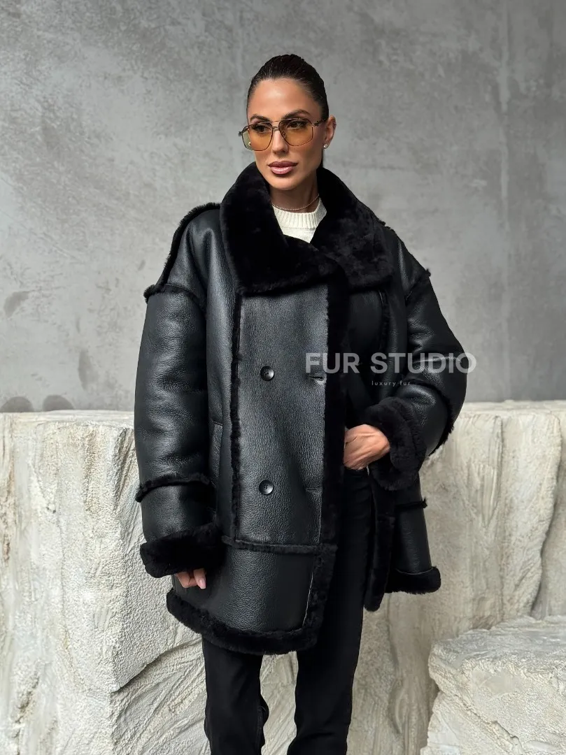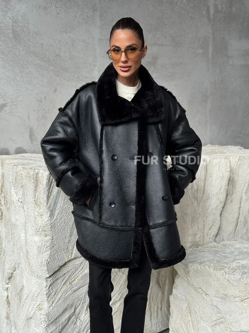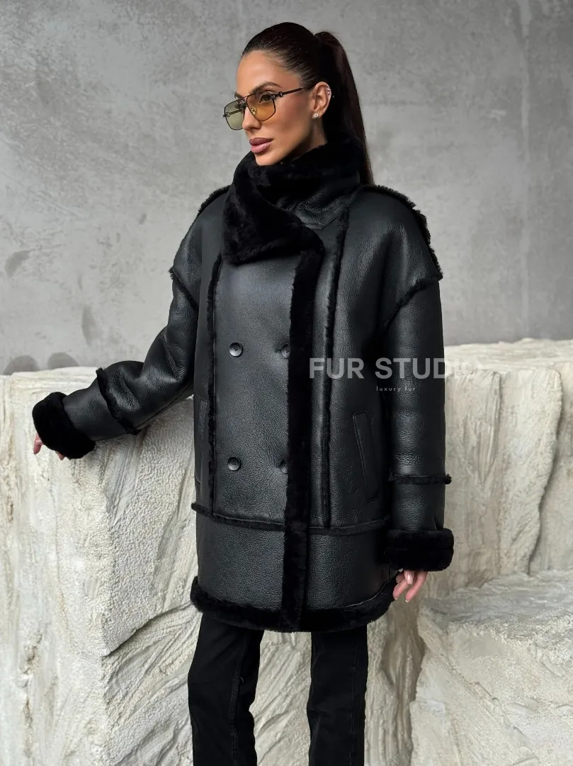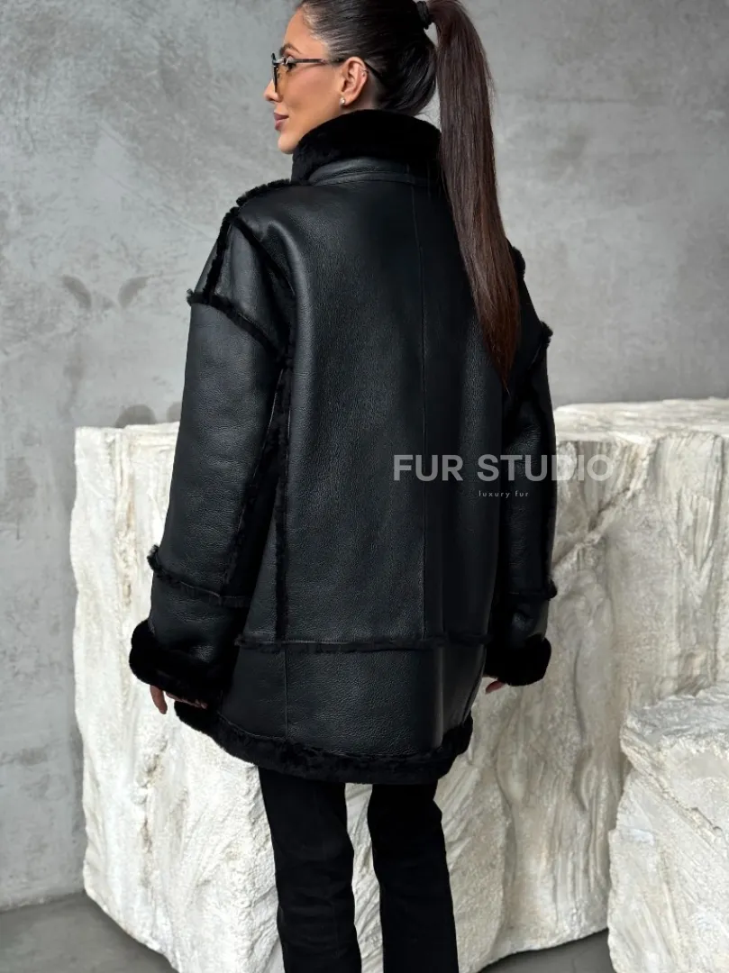 Черная современная дубленка. Модель предлагается в размерах от 44 до 48. Оптимальная длина моделей 75-80 см подчеркивает линии вашей фигуры. Эта дубленка станет неотъемлемой частью гардероба для тех, кто предпочитает роскошь и утонченность натуральной кожи.