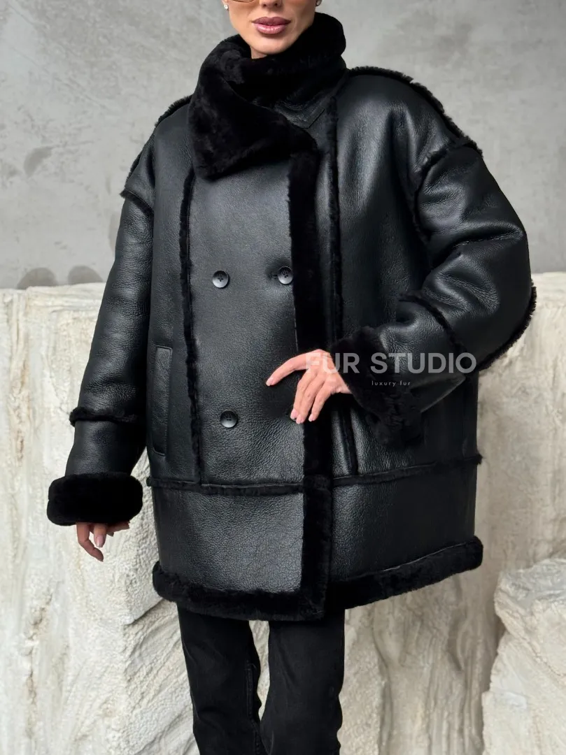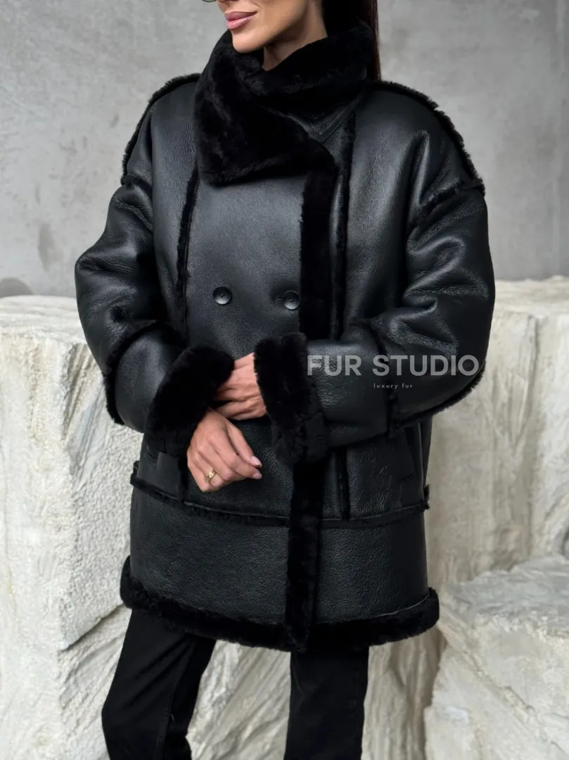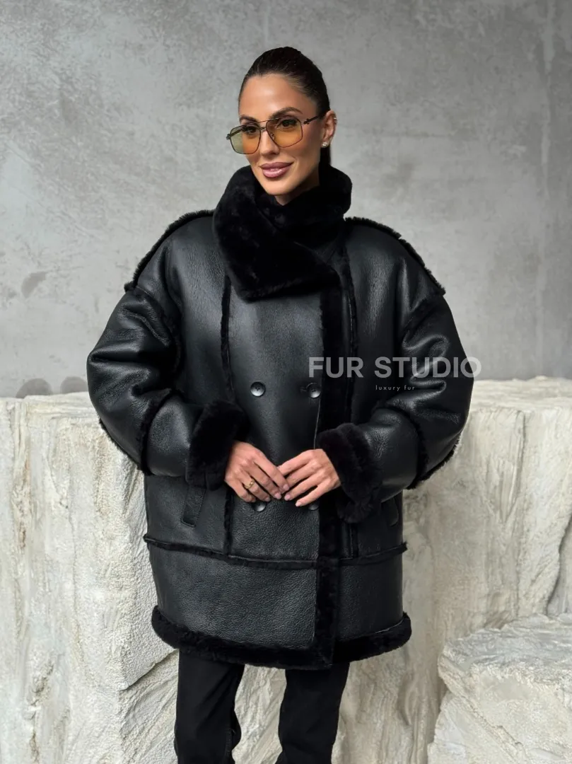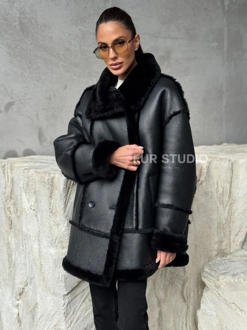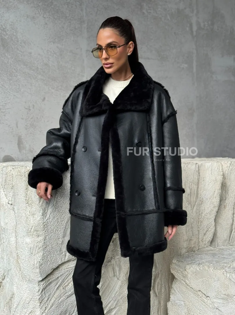 Черная современная дубленка. Модель предлагается в размерах от 44 до 48. Оптимальная длина моделей 75-80 см подчеркивает линии вашей фигуры. Эта дубленка станет неотъемлемой частью гардероба для тех, кто предпочитает роскошь и утонченность натуральной кожи.