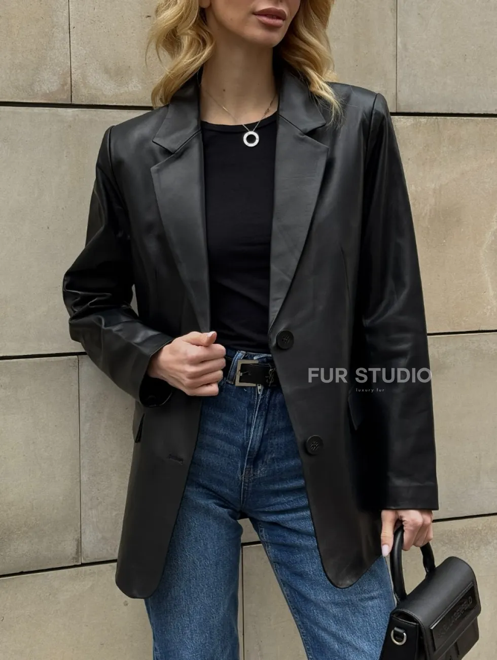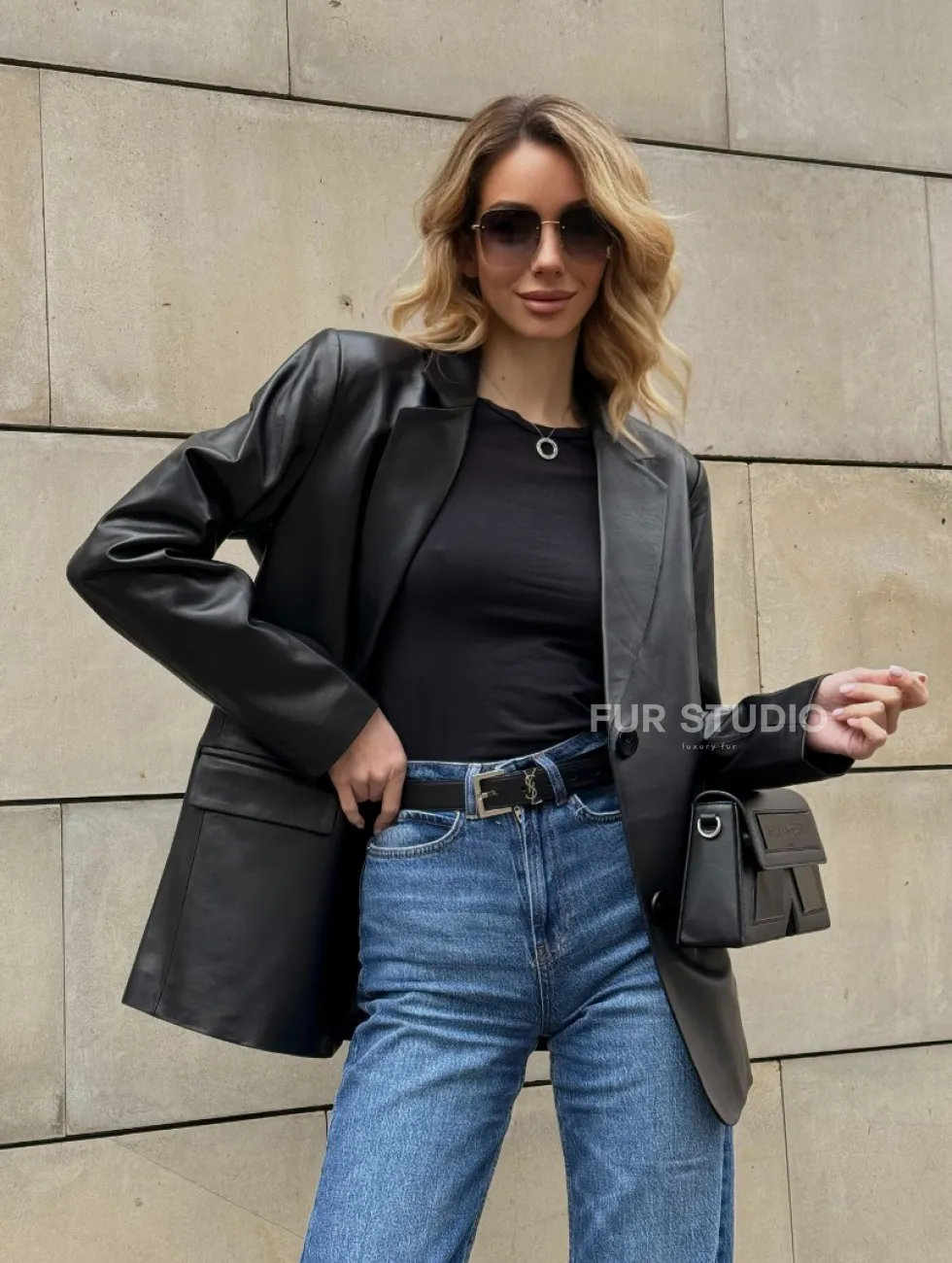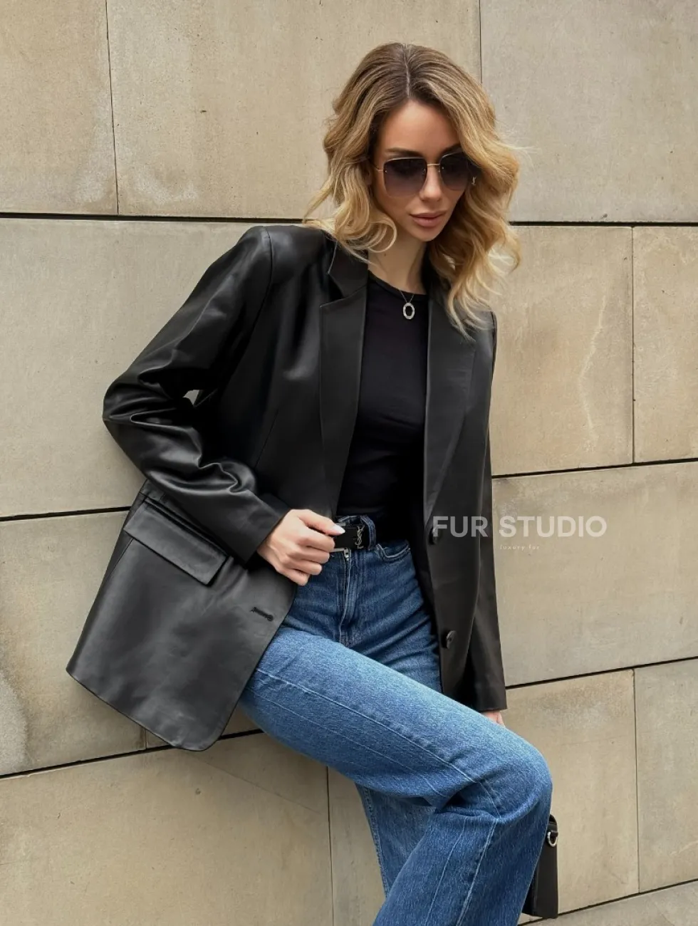 Черный кожаный пиджак классического кроя с клапанами на карманах доступна для покупки в нашем шоуруме Furs Studio в Москве, где также предоставляется удобная доставка во все города России.