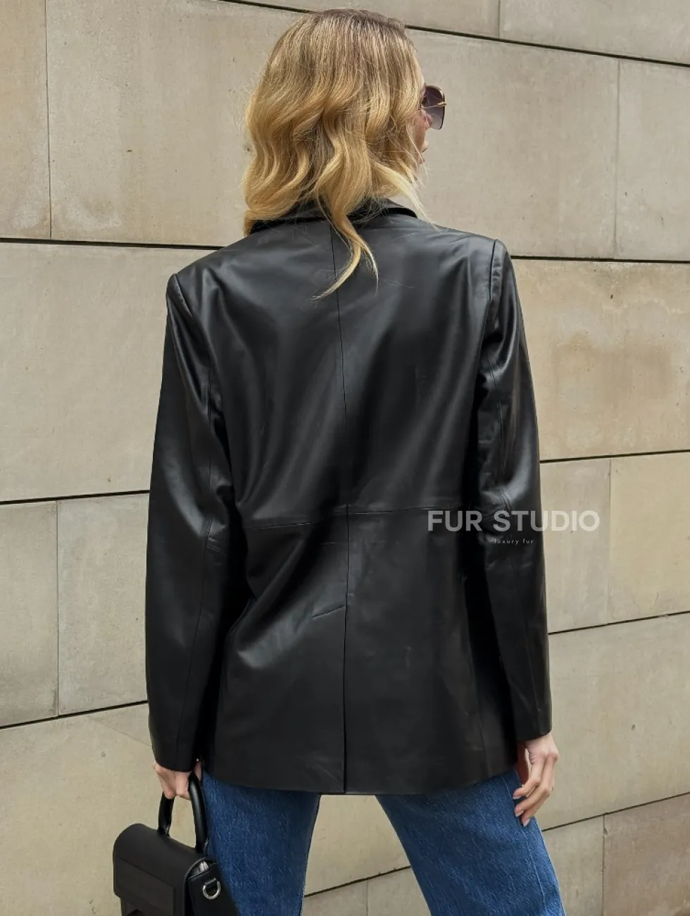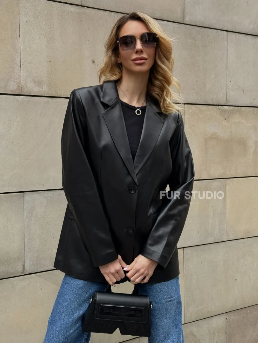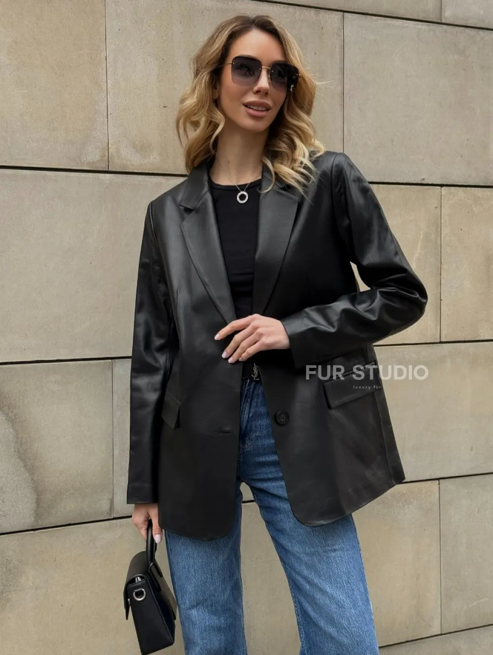 Черный кожаный пиджак классического кроя с клапанами на карманах доступна для покупки в нашем шоуруме Furs Studio в Москве, где также предоставляется удобная доставка во все города России.