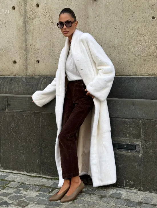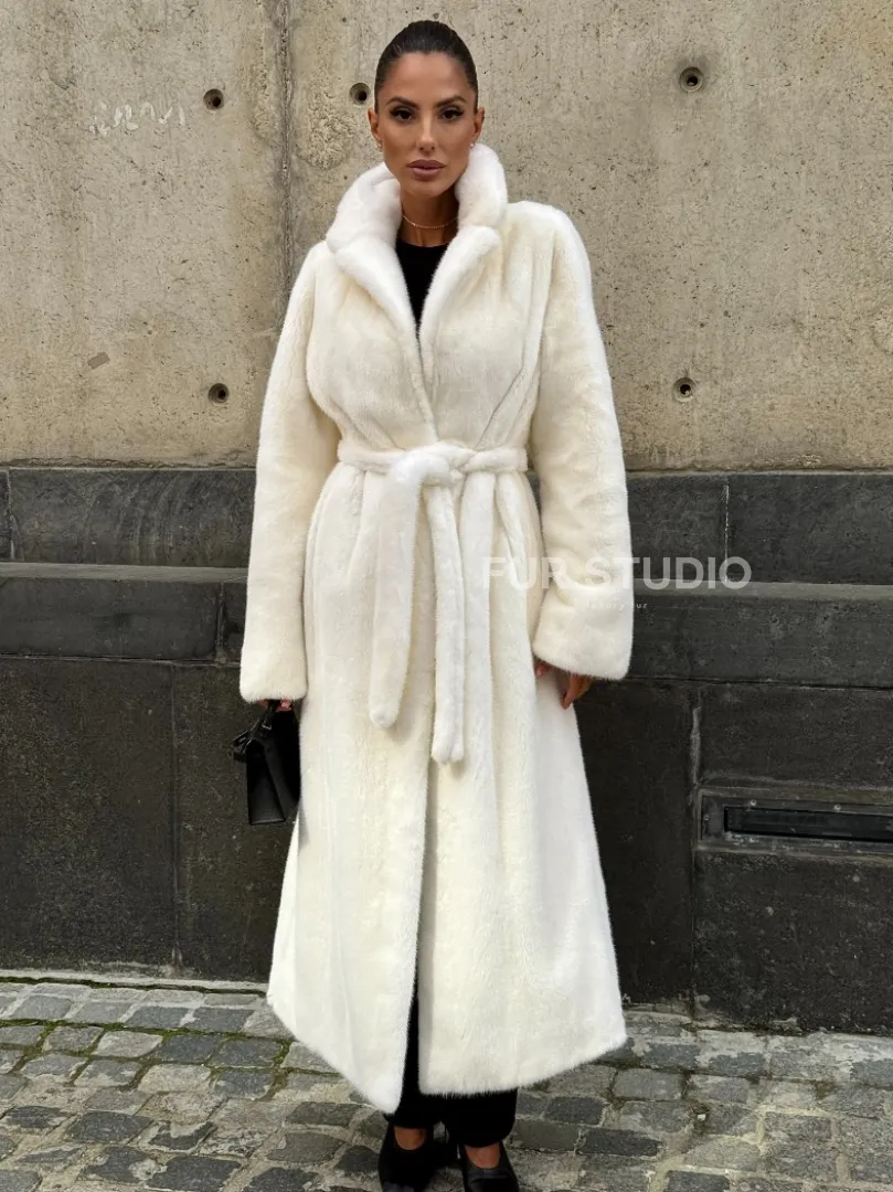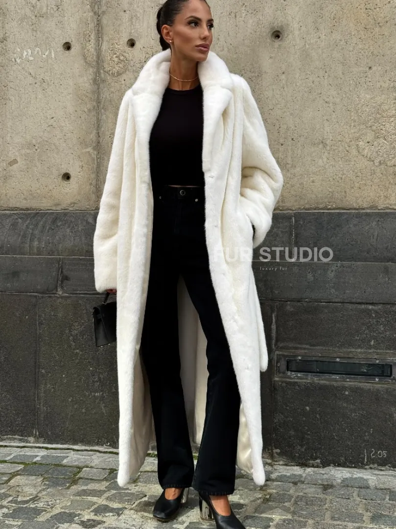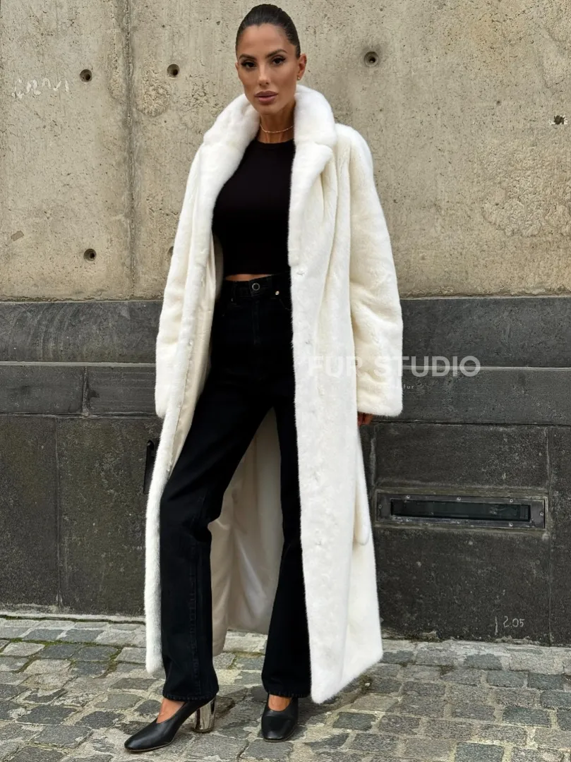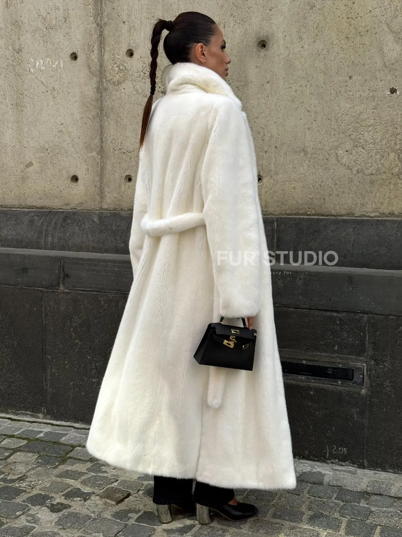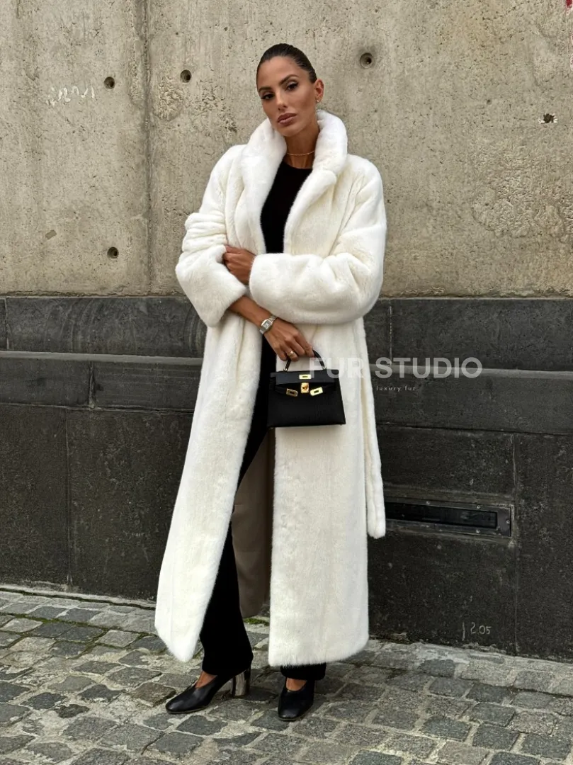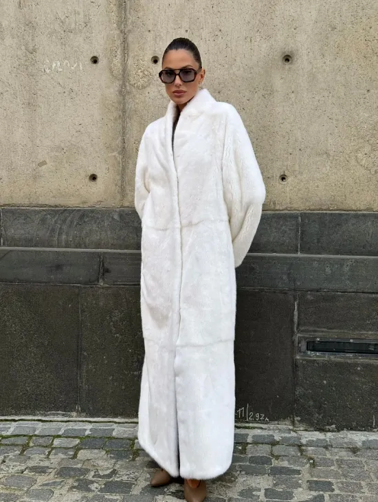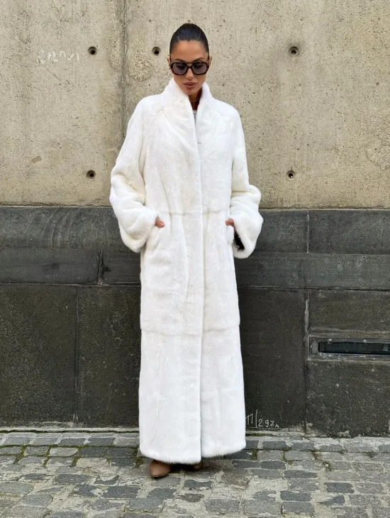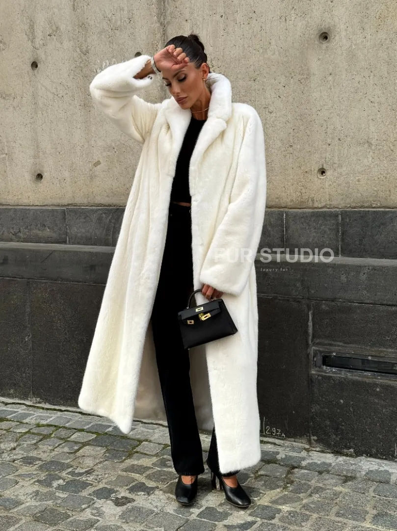 Роскошные рукава добавляют изысканности модели. Шикарные карманы позаботятся о комфорте ручек. Миниатюрная сумочка и грубая обувь сделают ваш образ гармоничным. Качество изделия будет радовать многие годы. Купить белую шубу из плюшевой норки с английским воротником могут дамы, которые обладают безукоризненным вкусом стиля.