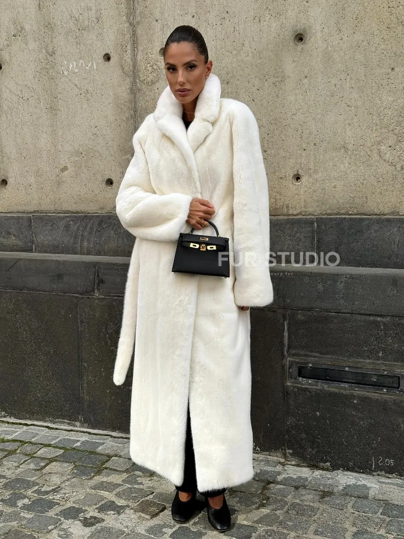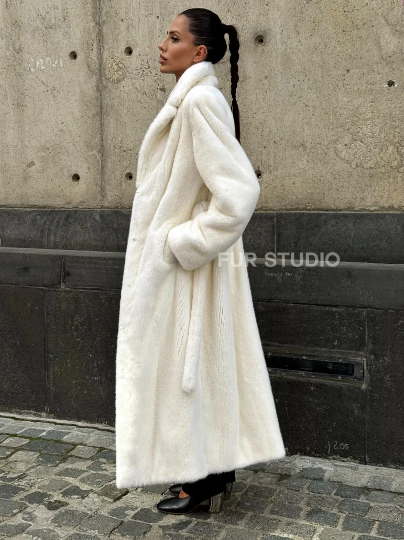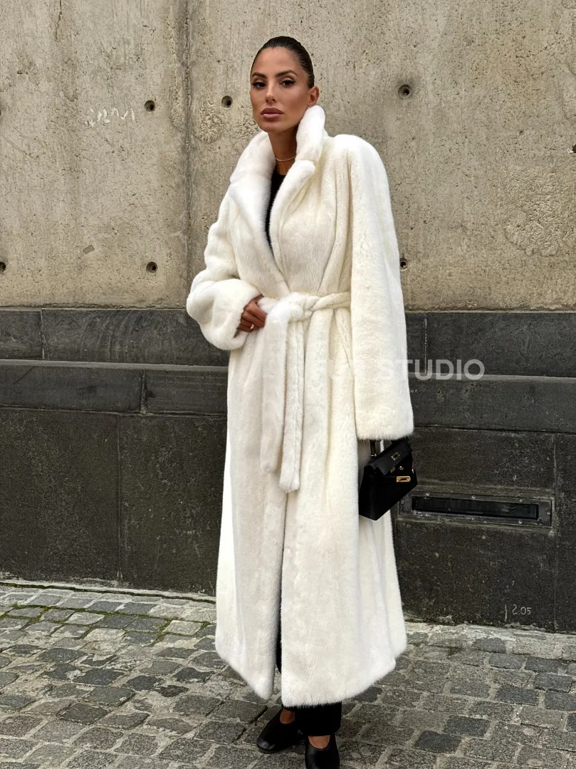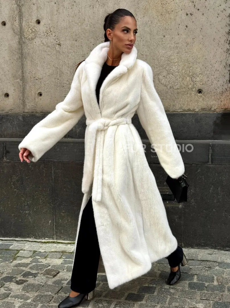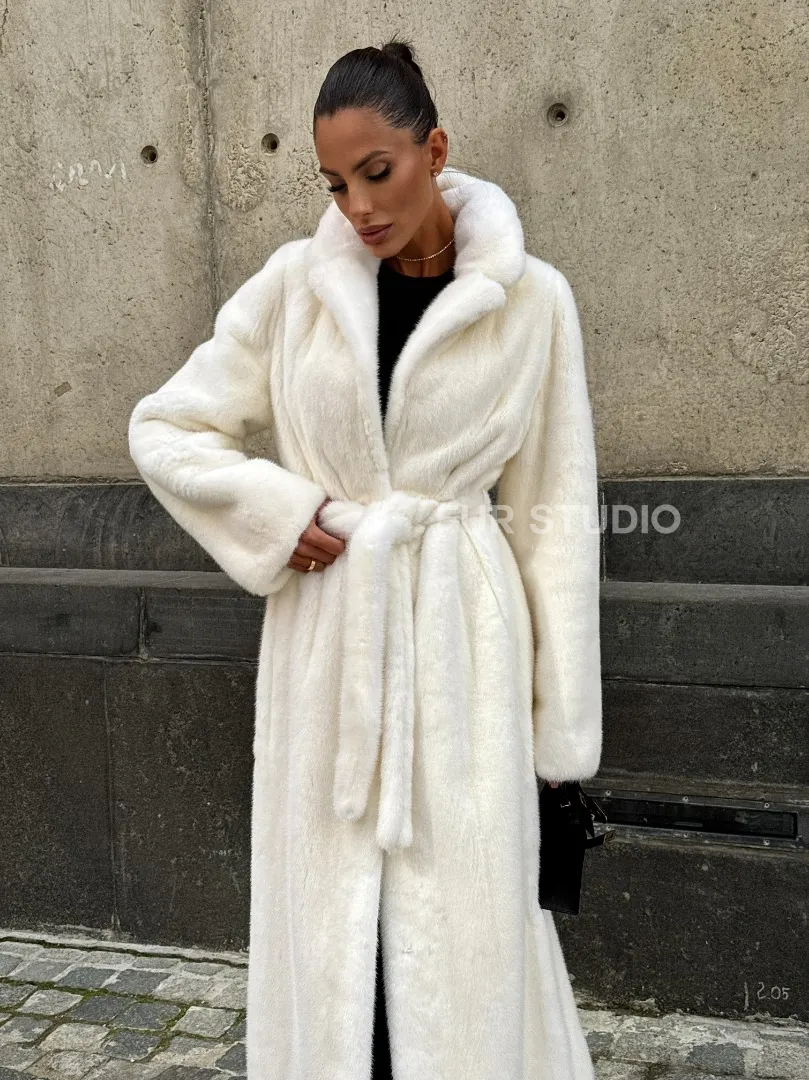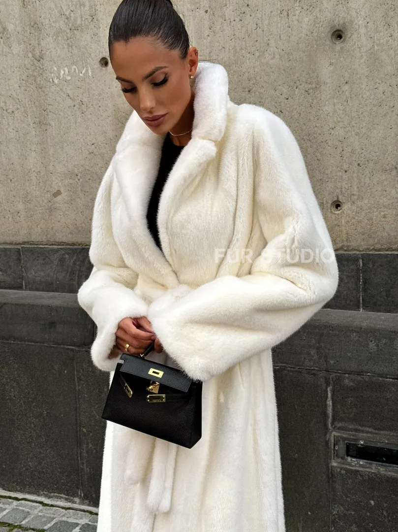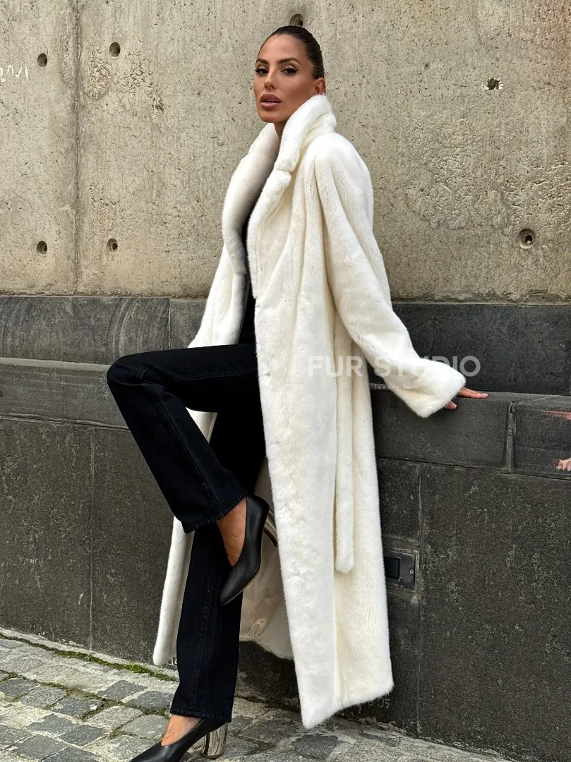 Роскошные рукава добавляют изысканности модели. Шикарные карманы позаботятся о комфорте ручек. Миниатюрная сумочка и грубая обувь сделают ваш образ гармоничным. Качество изделия будет радовать многие годы. Купить белую шубу из плюшевой норки с английским воротником могут дамы, которые обладают безукоризненным вкусом стиля.