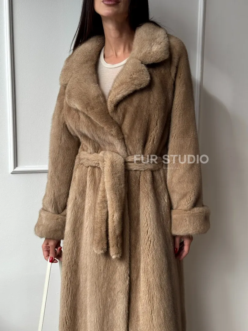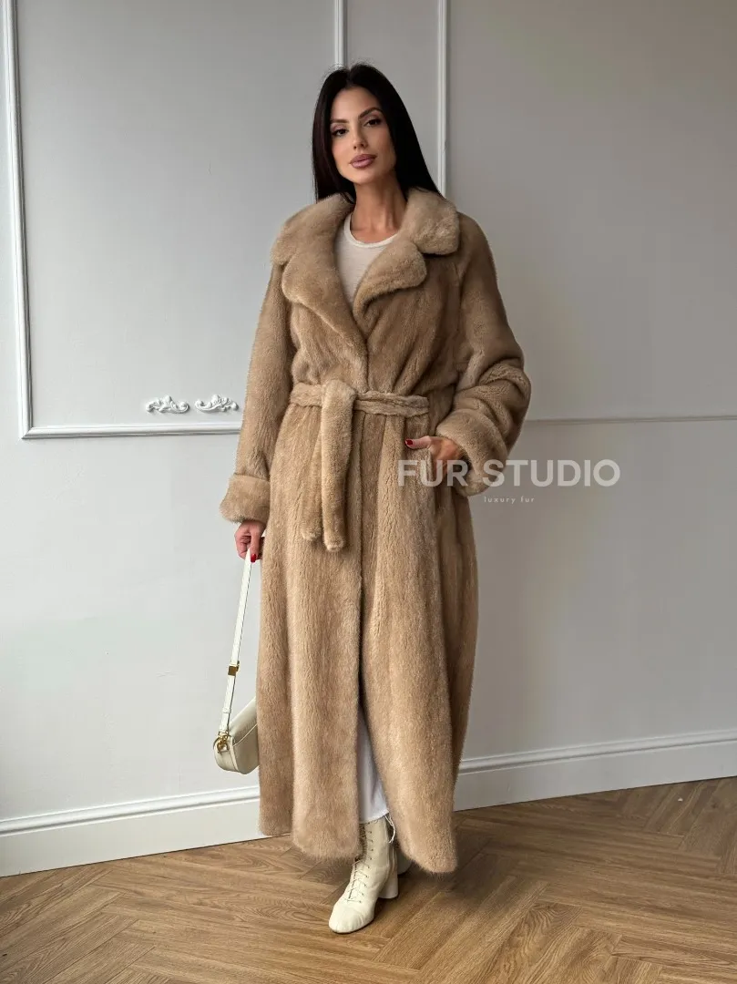 Мех данной шубы аукционная норка, цвет бежевый. Предлагается в размерах от 42 до 52. Длина модели 125-130 см, что выгодно подчеркивает фигуру девушек. Эта модель идеально подойдет для девушек и женщин, предпочитающих роскошные натуральные меха.