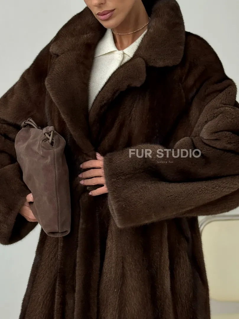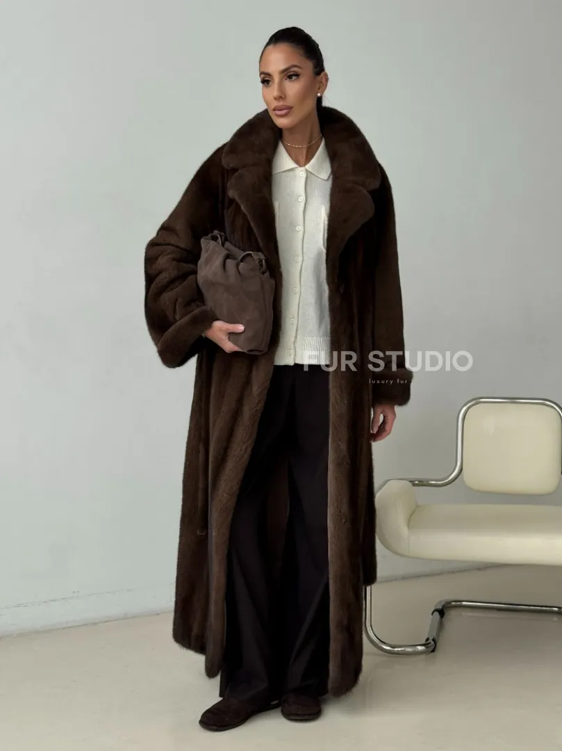 Мех данной шубы аукционная норка , цвет коричневый. Предлагается в размерах от 42 до 50. Длина модели 125-130 см, что выгодно подчеркивает фигуру девушек. Эта модель идеально подойдет для девушек и женщин, предпочитающих роскошные натуральные меха.