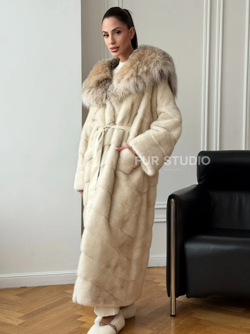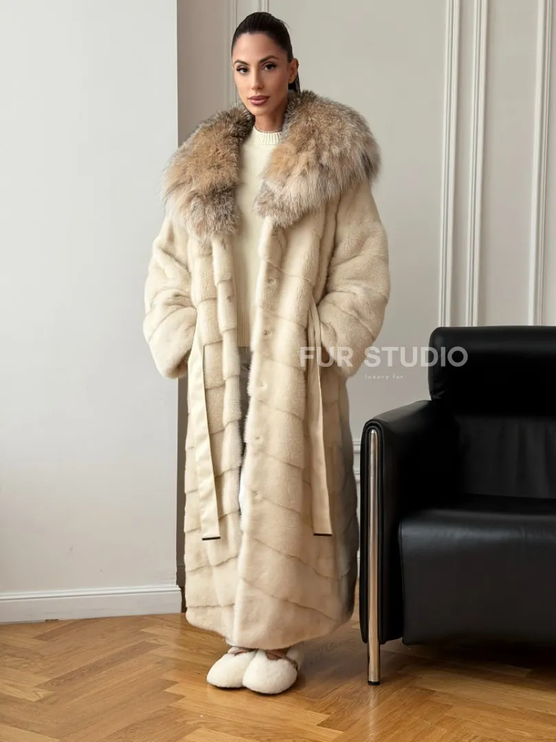Мех данной шубы аукционная норка, цвет бежевый. Предлагается в размерах от 42 до 52. Длина модели 125-130 см, что выгодно подчеркивает фигуру девушек. Эта модель идеально подойдет для девушек и женщин, предпочитающих роскошные натуральные меха.