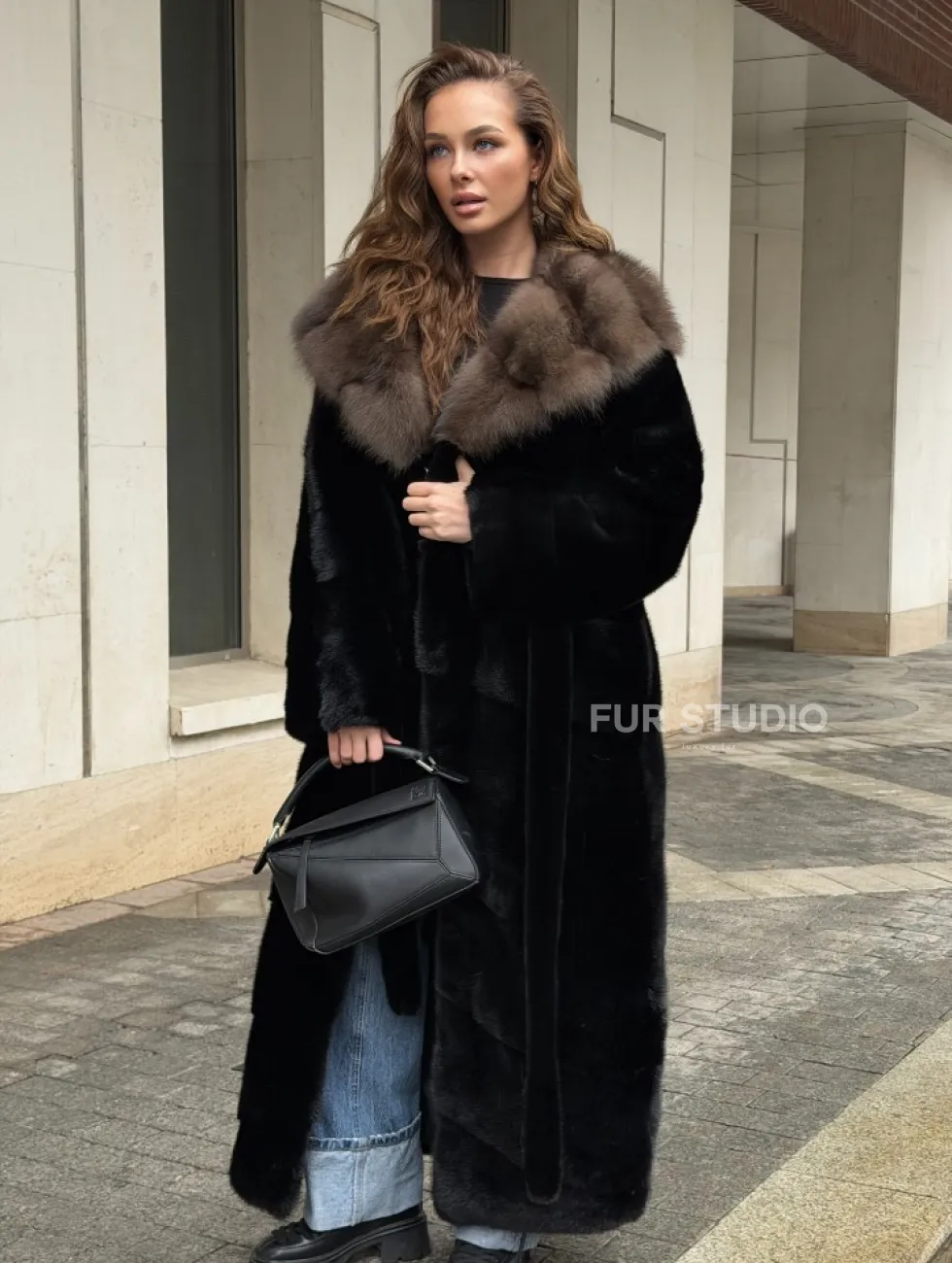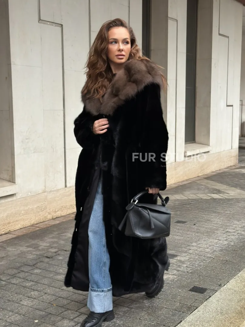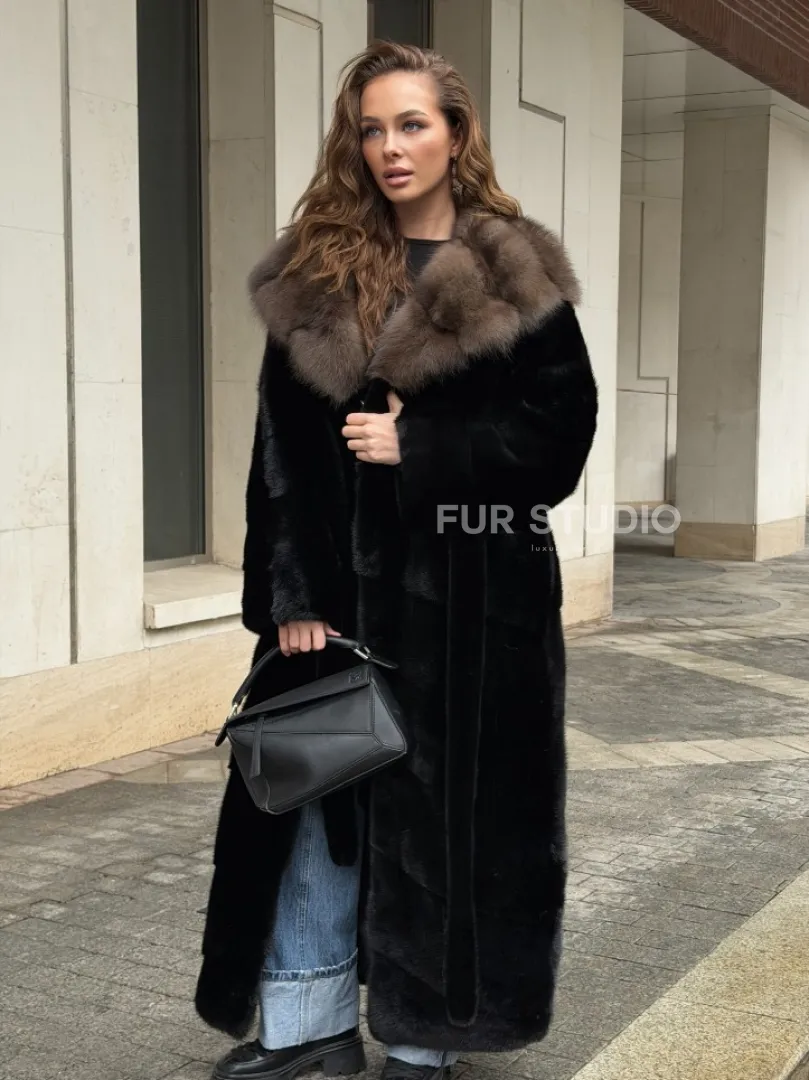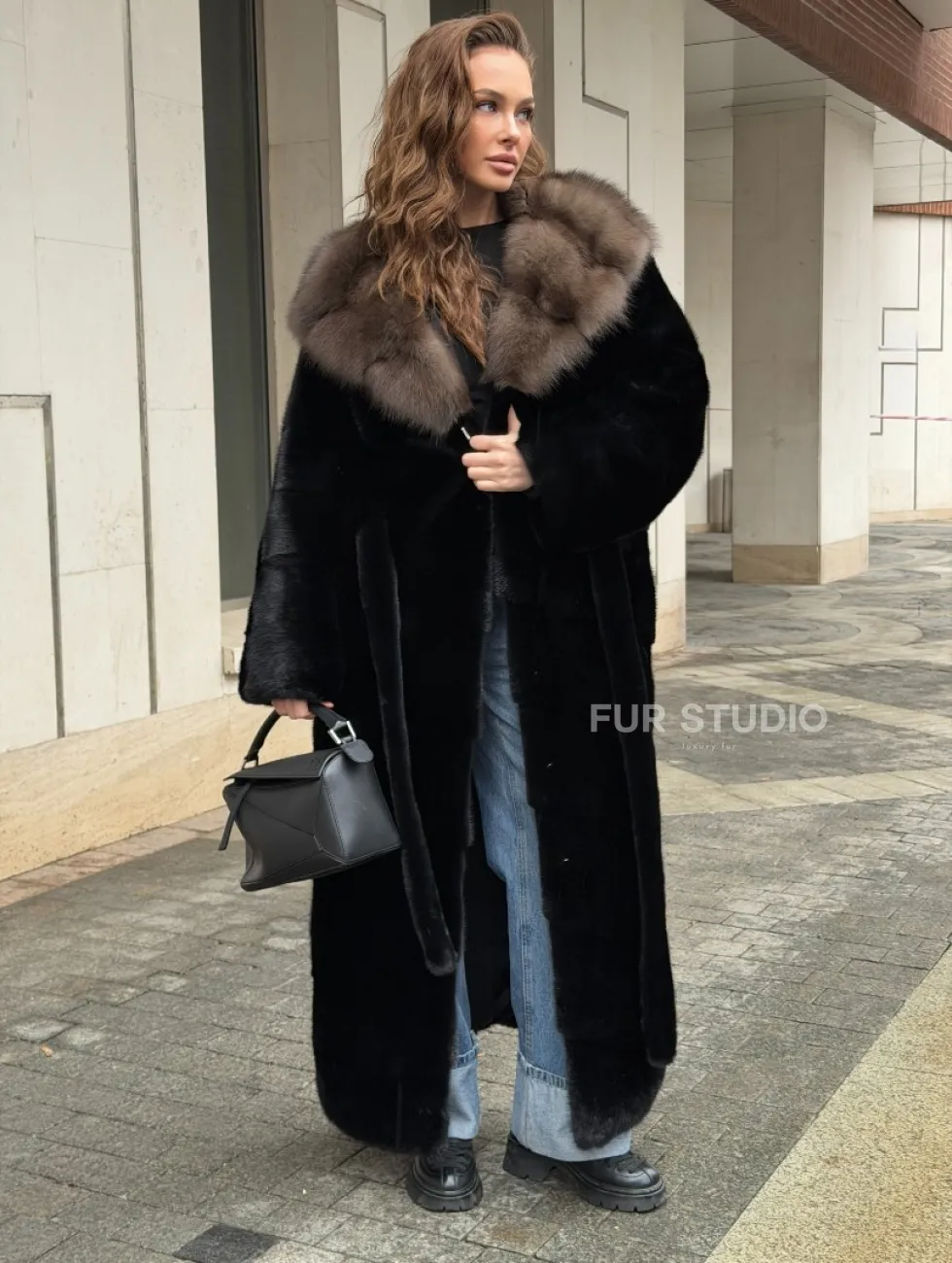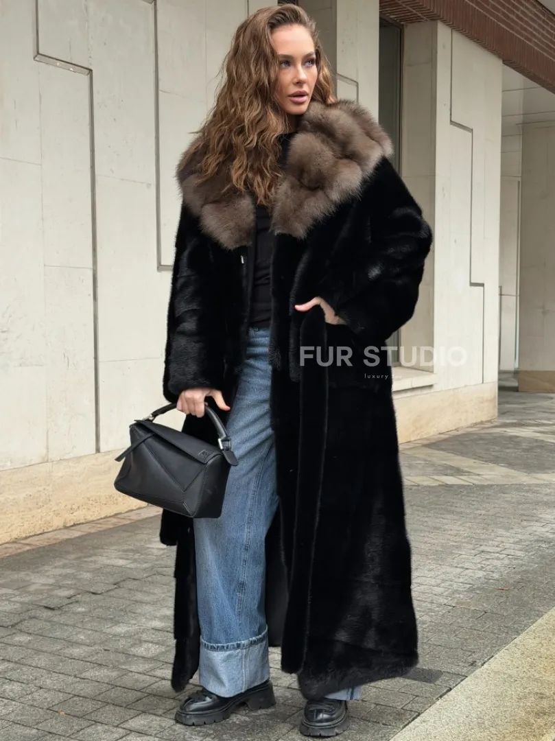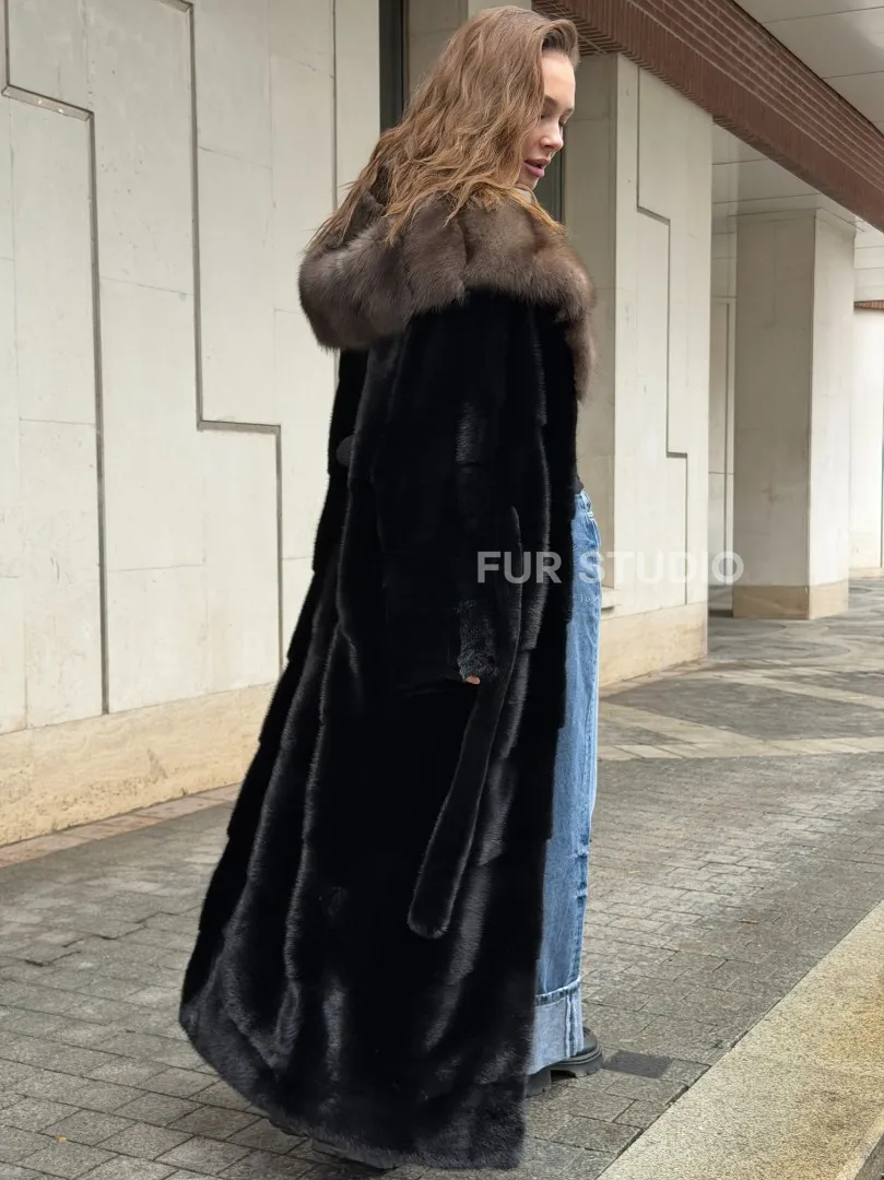 Черная норковая шуба с капюшоном из меха куницы - выбор женщин, которые хотят выглядеть стильно вне зависимости от погоды. Сочетание меха норки и куницы делают изделие неординарным. Цвет выгодно подчеркнет оттенок волос и глаз владелицы. Капюшон позаботится о прическе и не даст замерзнуть в ветреную погоду. Длина оптимальна и покрывает все участки тела. Это очень удобно для любительниц голых ножек в холодное время года.
