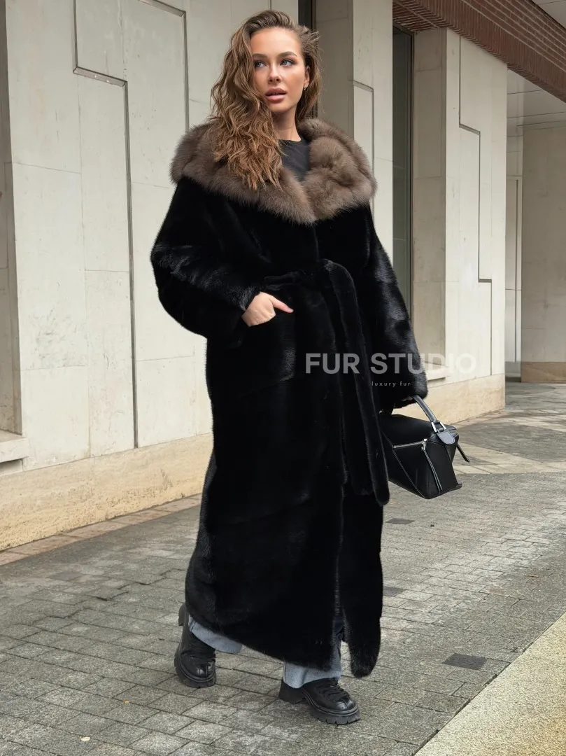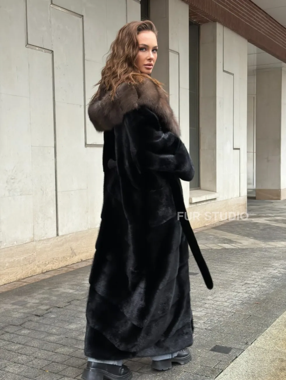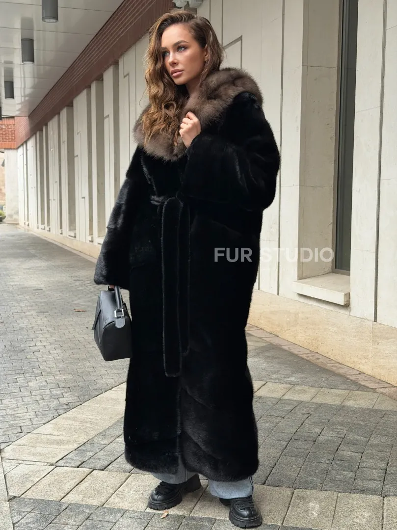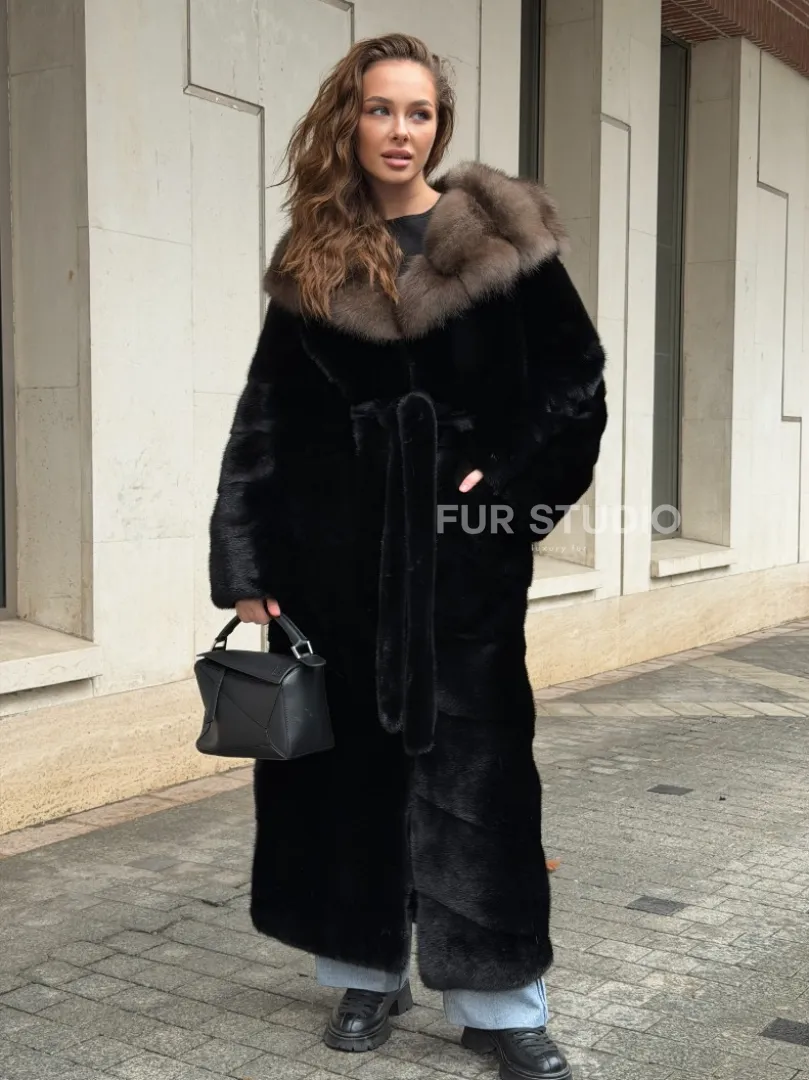 Удобные рукава не дадут замерзнуть ручкам в непогоду. Необычный пояс очертит талию и создаст силуэт “песочные часы”. Роскошные манжеты подчеркнут изящные кисти. Купить черную норковую шубу с капюшоном из меха куницы могут женщины, которые имеют безукоризненный вкус и разбираются в моде.