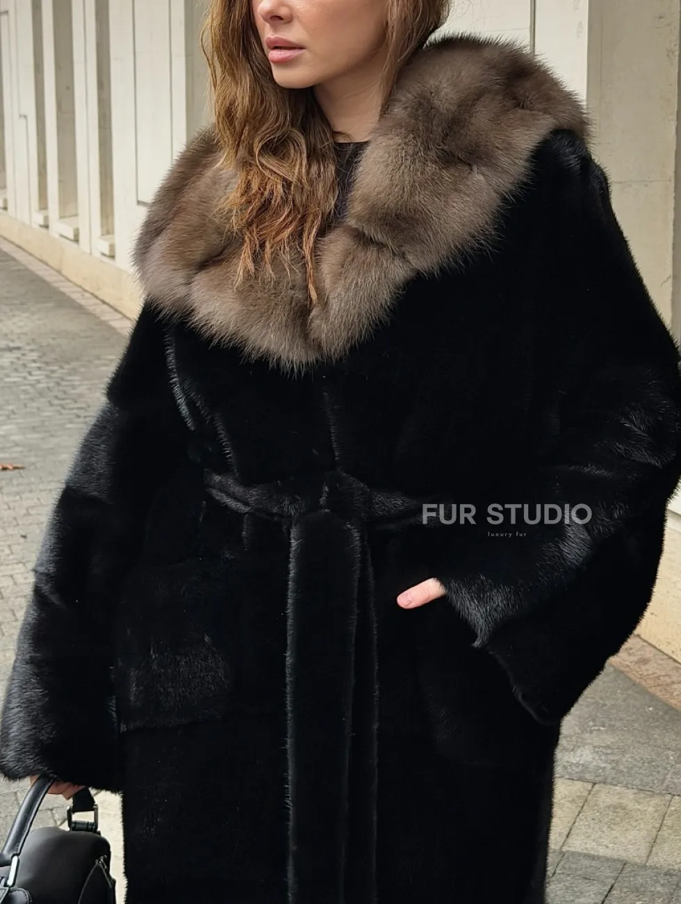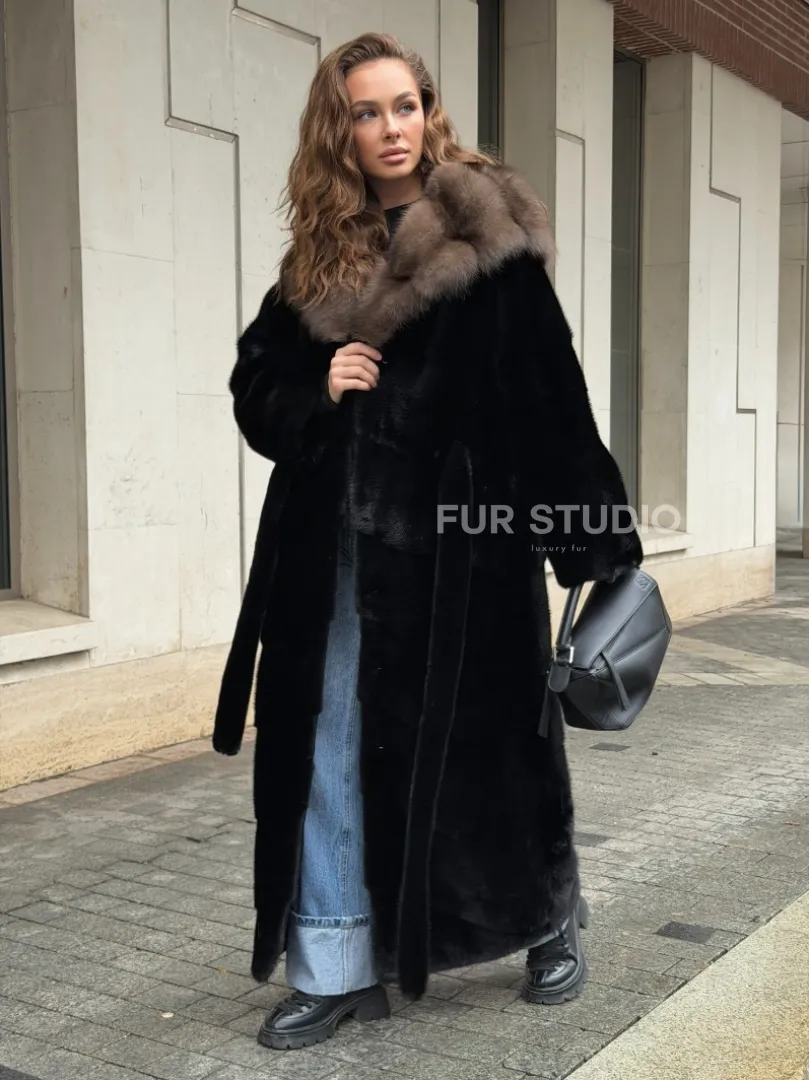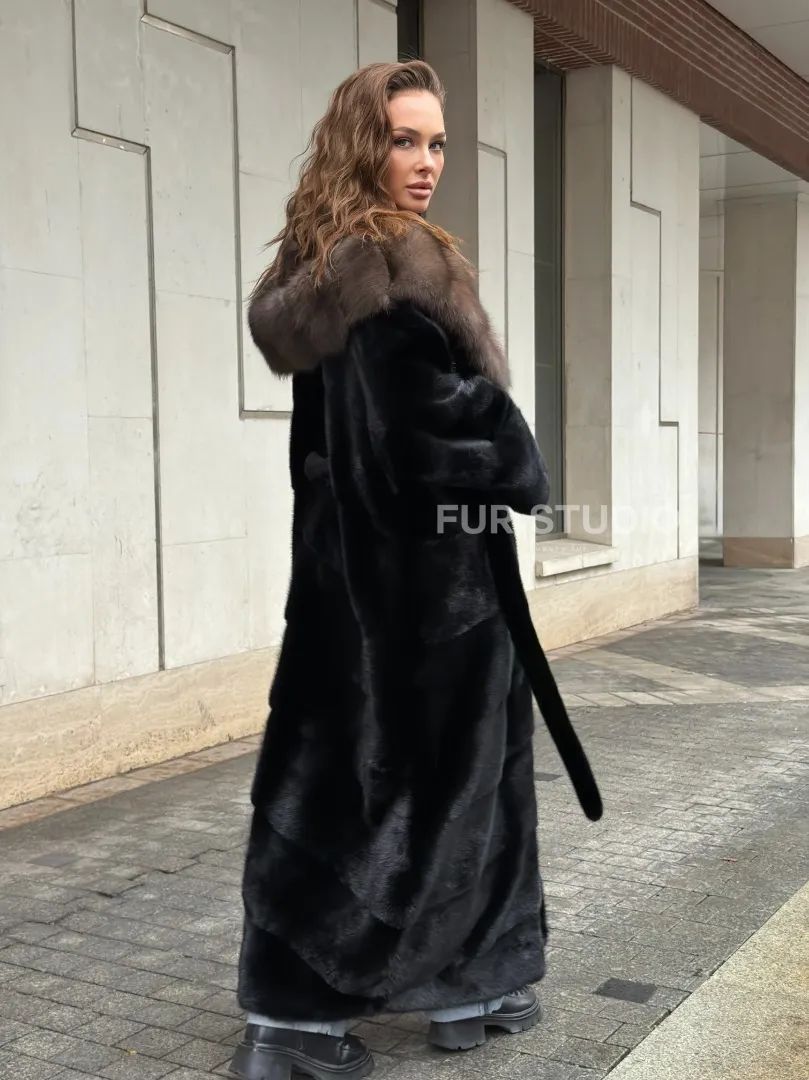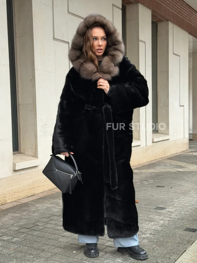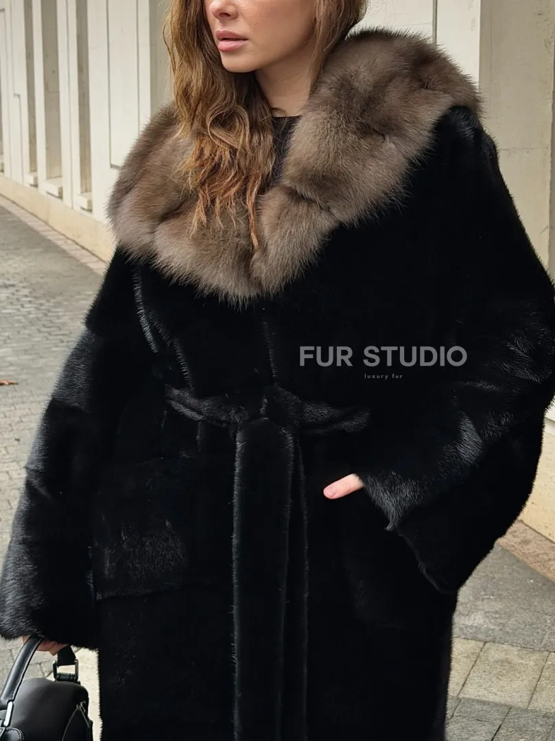 Удобные рукава не дадут замерзнуть ручкам в непогоду. Необычный пояс очертит талию и создаст силуэт “песочные часы”. Роскошные манжеты подчеркнут изящные кисти. Купить черную норковую шубу с капюшоном из меха куницы могут женщины, которые имеют безукоризненный вкус и разбираются в моде.
