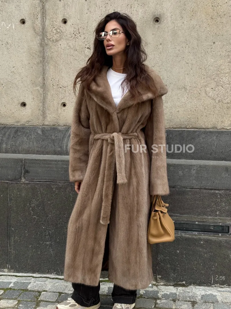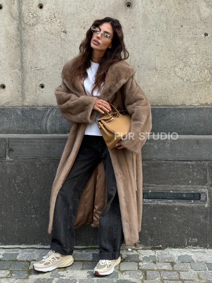 Мех данной шубы аукционная норка, цвет бежевый. Предлагается в размерах от 42 до 50. Длина модели 120-125 см , что выгодно подчеркивает фигуру девушек. Эта модель идеально подойдет для девушек и женщин, предпочитающих роскошные натуральные меха.