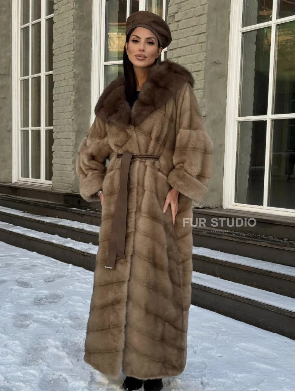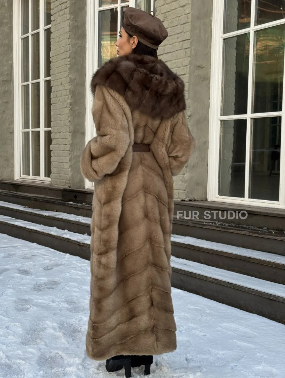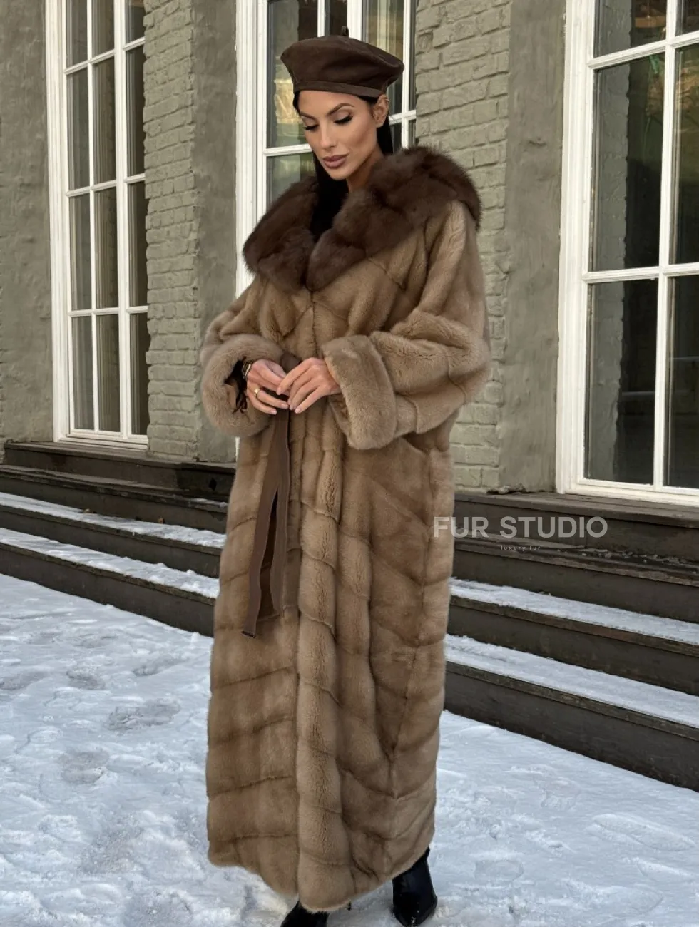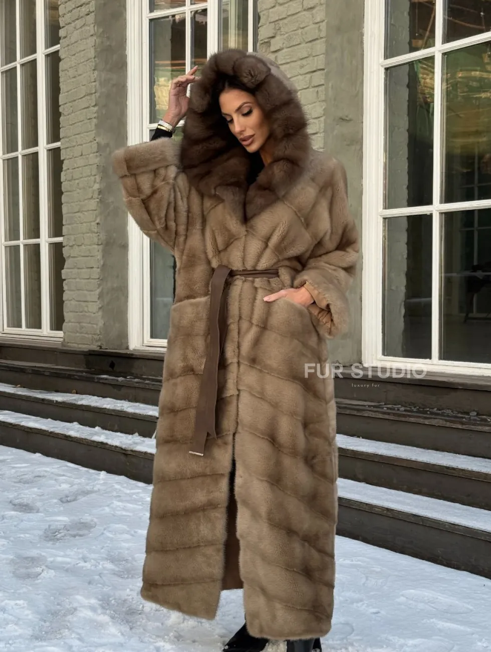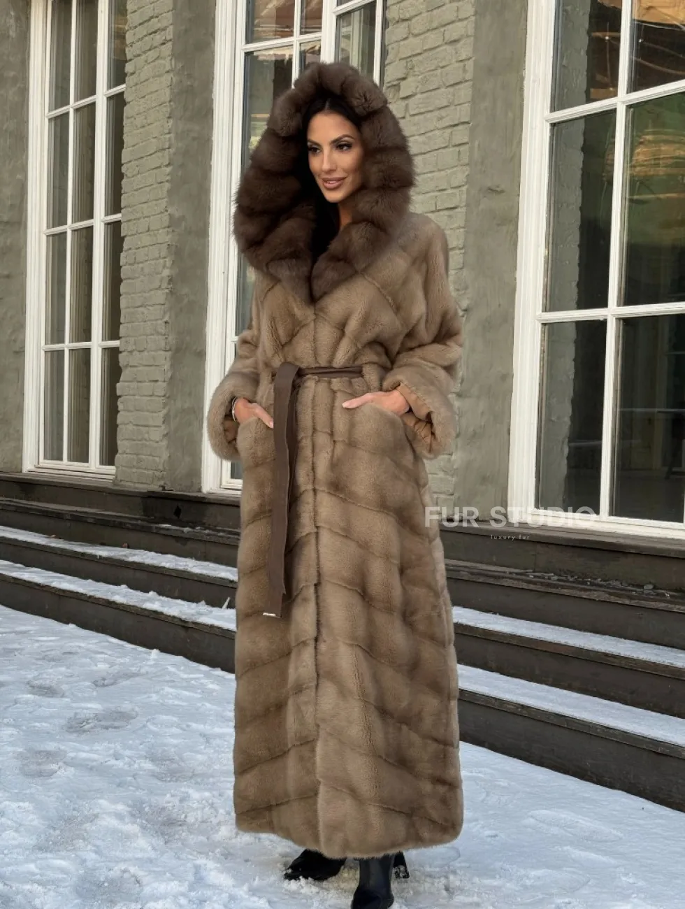 Длинная норковая шуба в цвете пастель с капюшоном из натуральной куницы доступна для покупки в нашем шоуруме Furs Studio в Москве. У нас так же есть доставка во все города России. Добавьте немного роскоши в свой гардероб с этой шубой, которая будет служить вам многие годы.