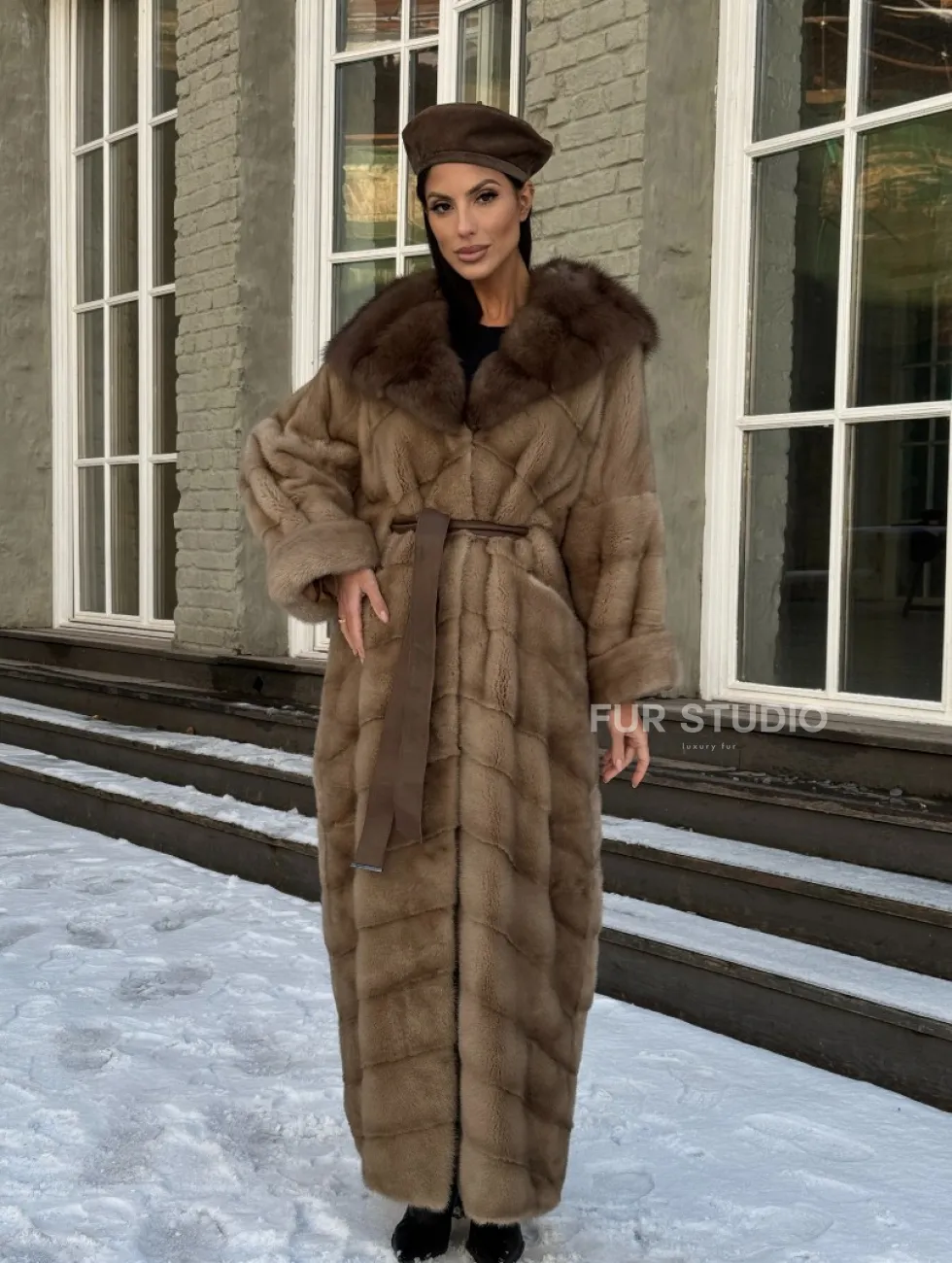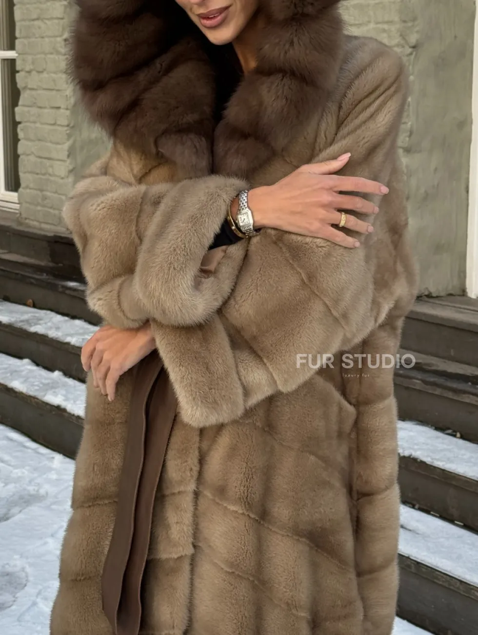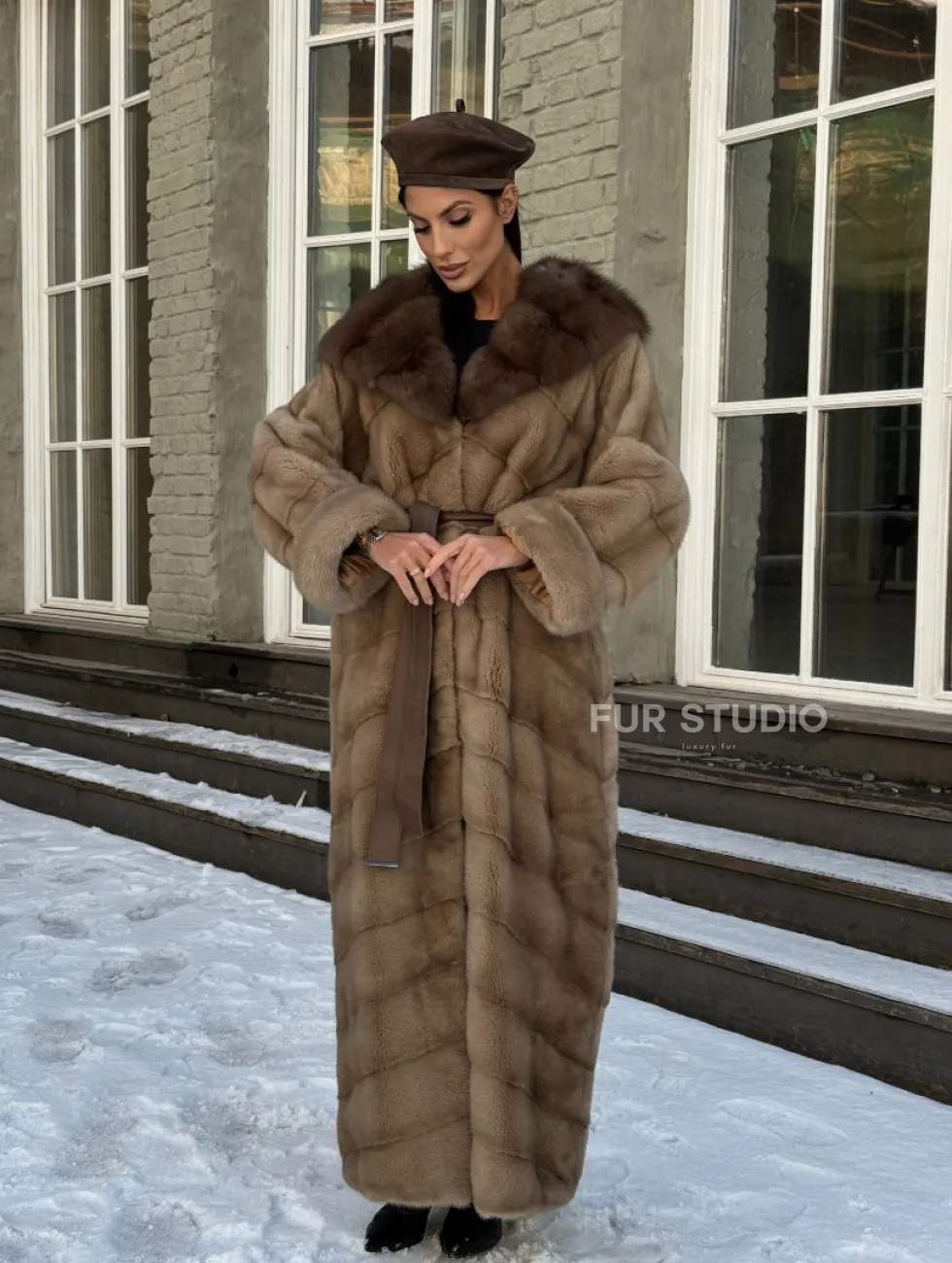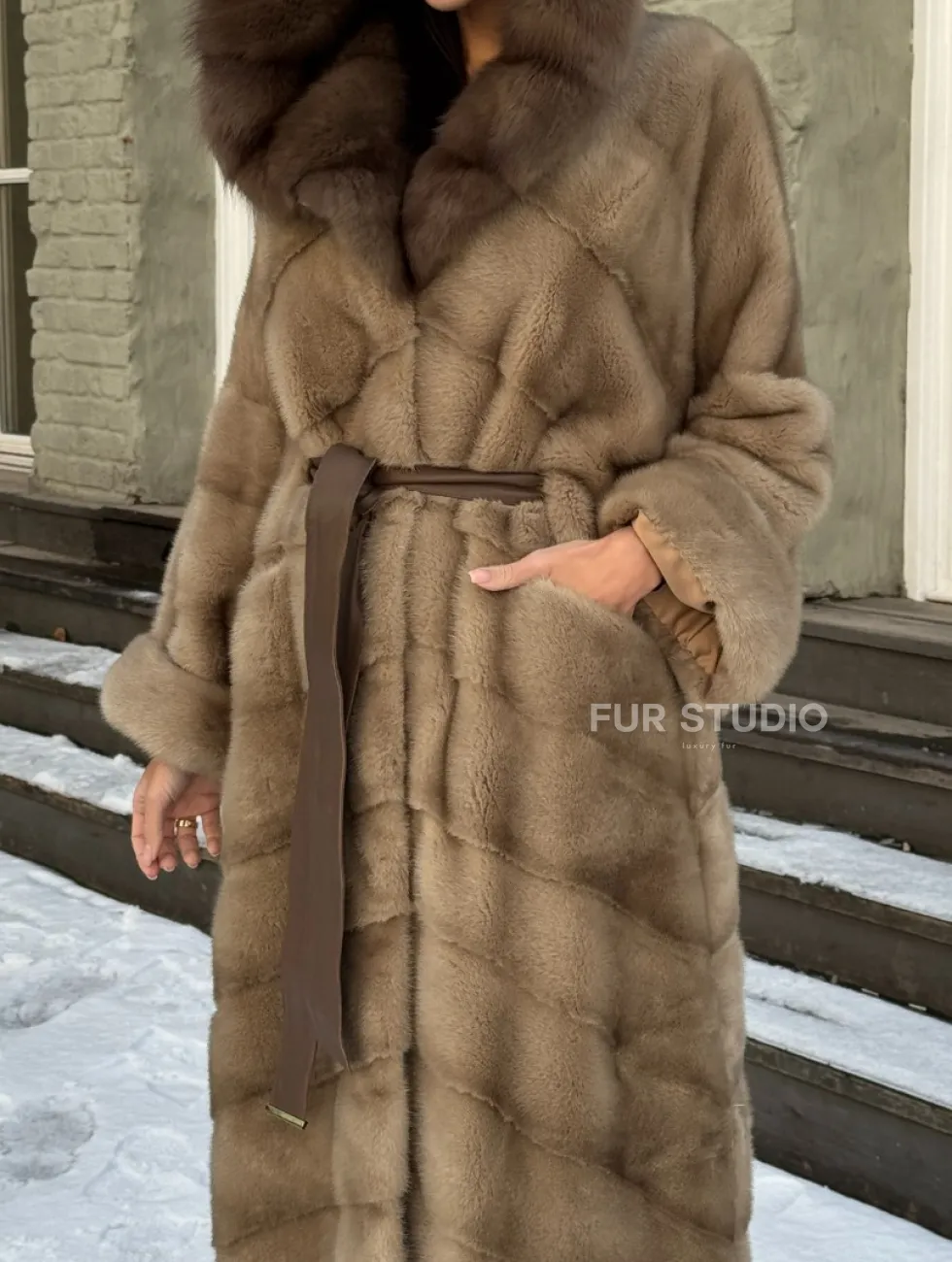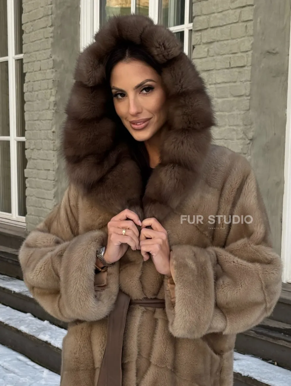 Длинная норковая шуба в цвете пастель с капюшоном из натуральной куницы доступна для покупки в нашем шоуруме Furs Studio в Москве. У нас так же есть доставка во все города России. Добавьте немного роскоши в свой гардероб с этой шубой, которая будет служить вам многие годы.