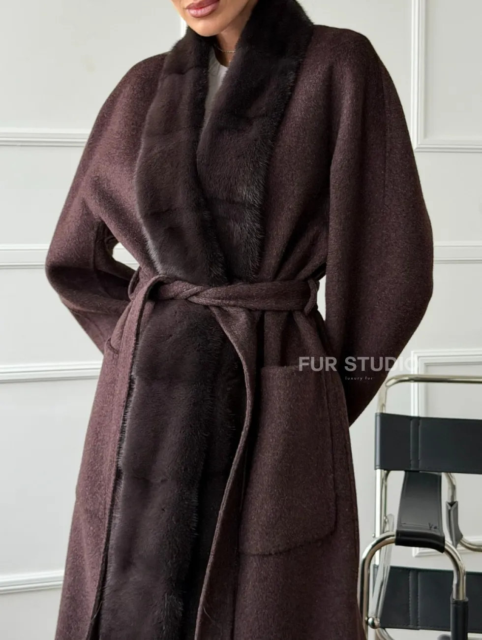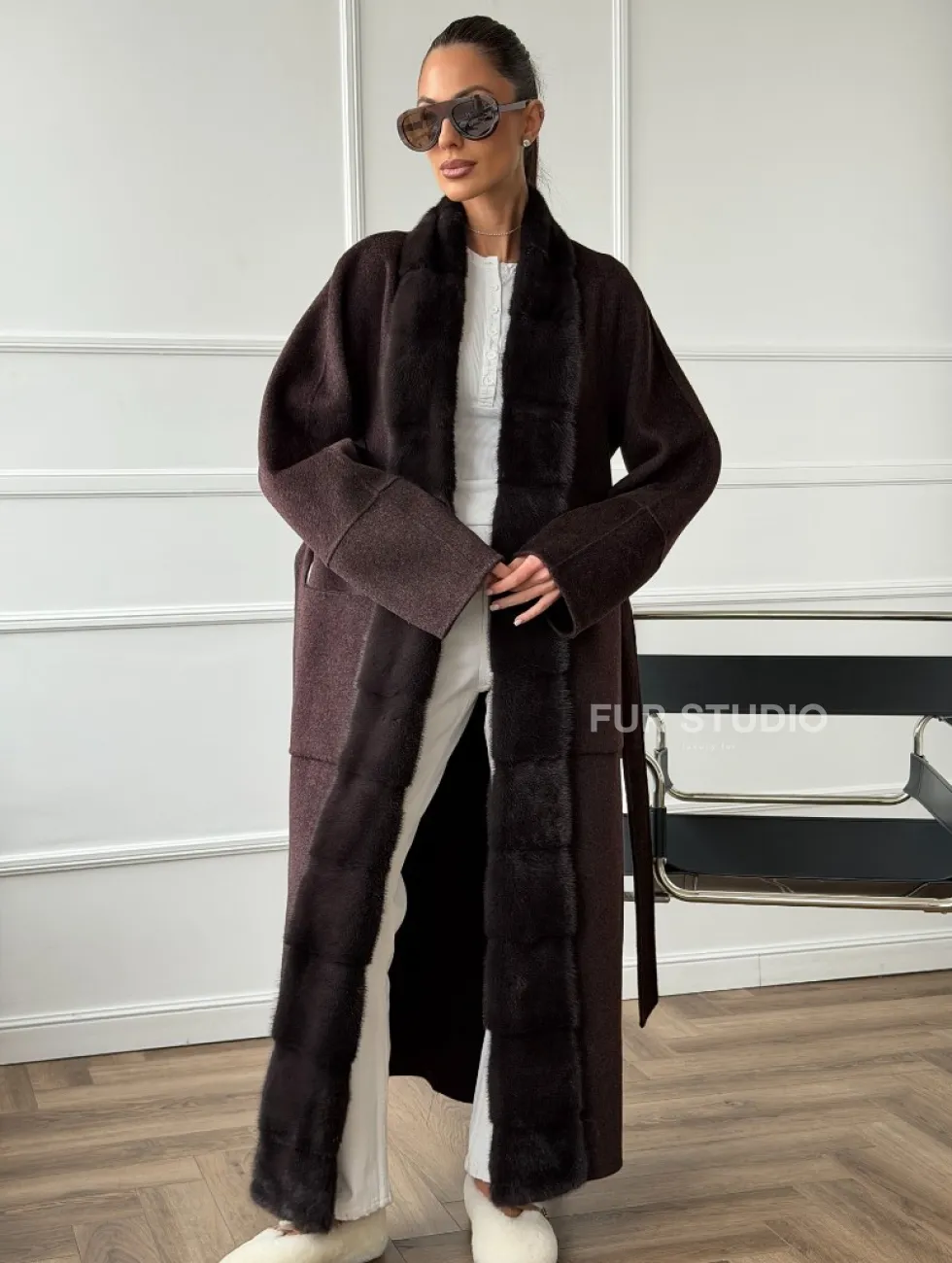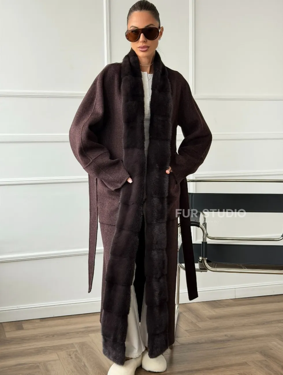Длинное демисезонное пальто с мехом норки 102673