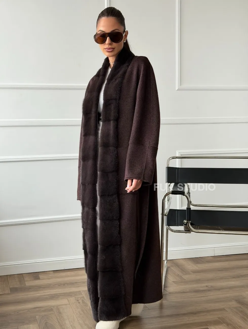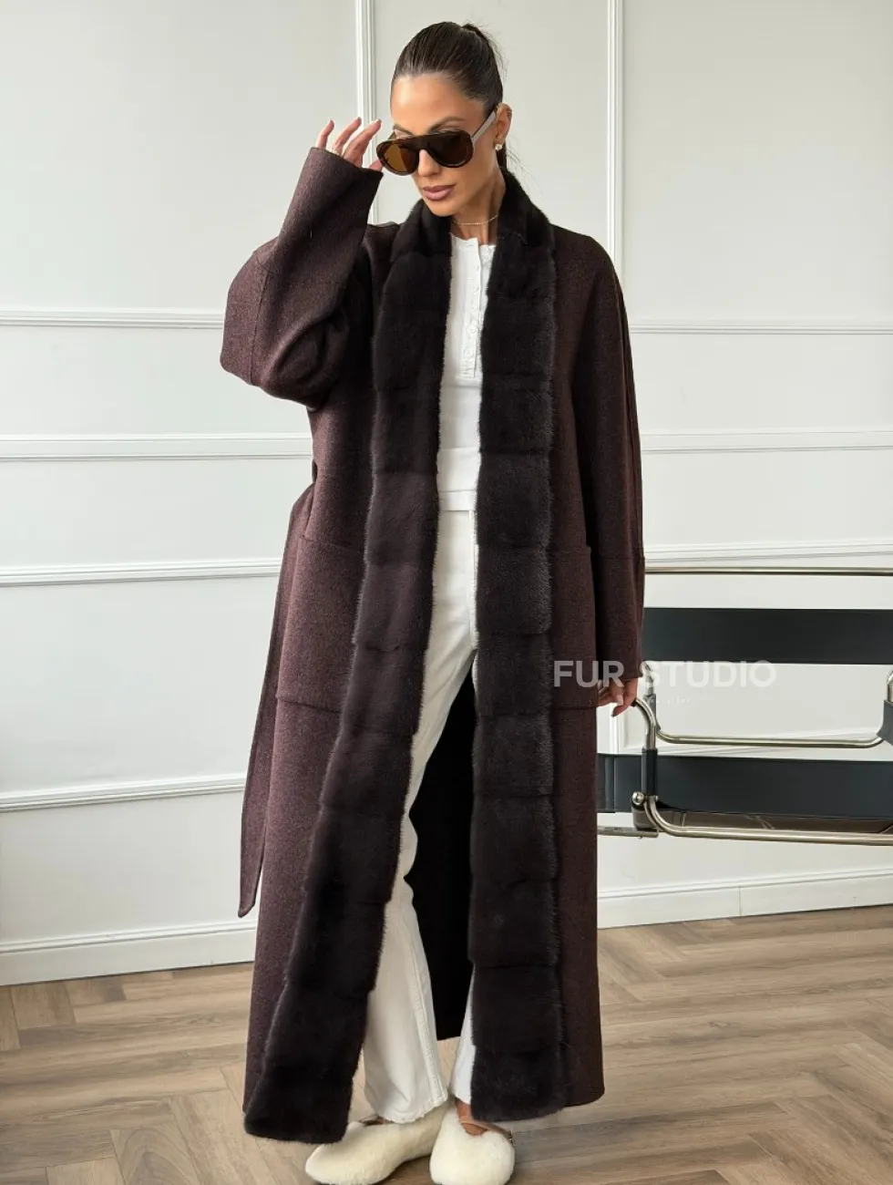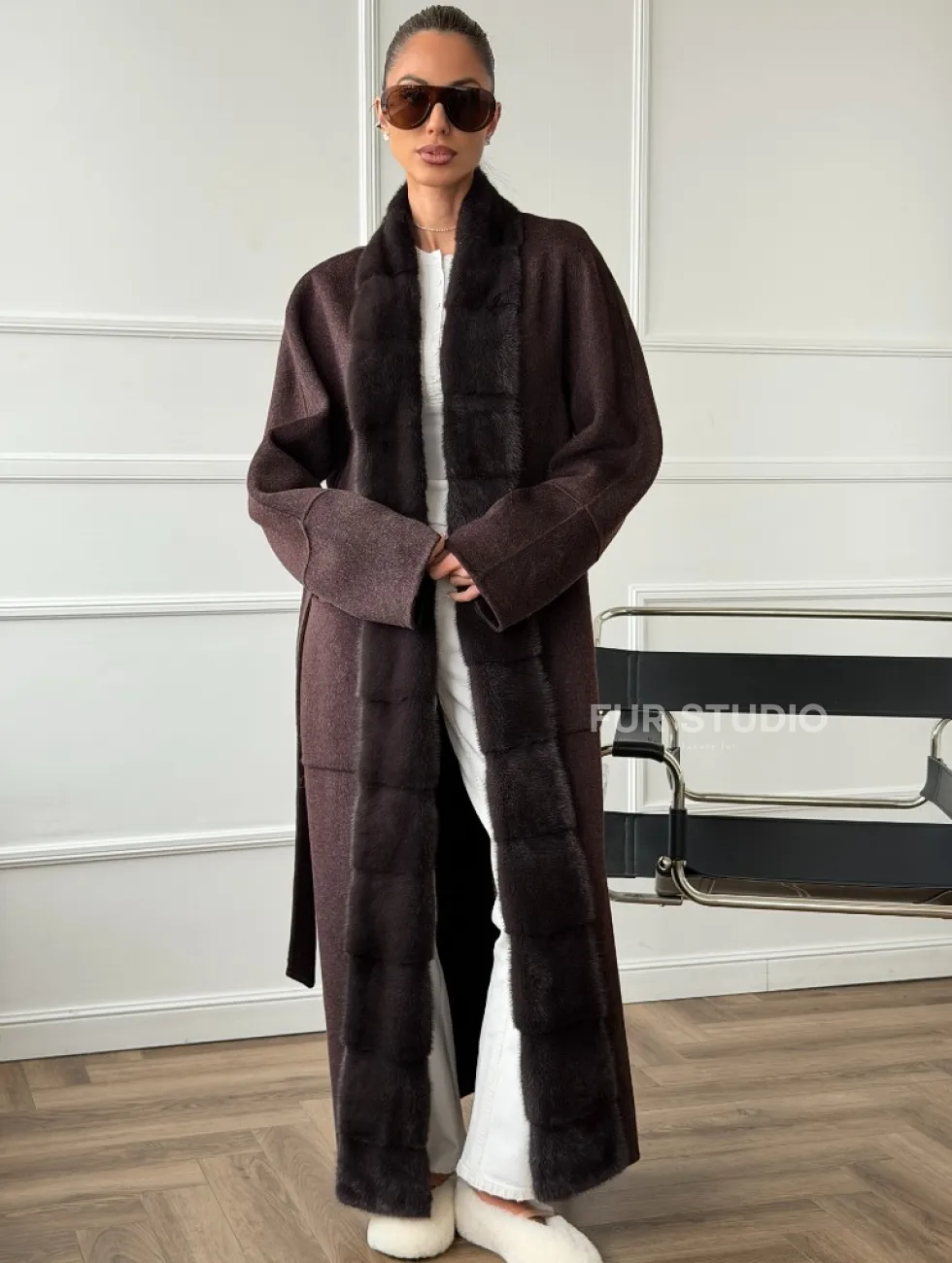 Длинное демисезонное пальто с мехом норки 102673