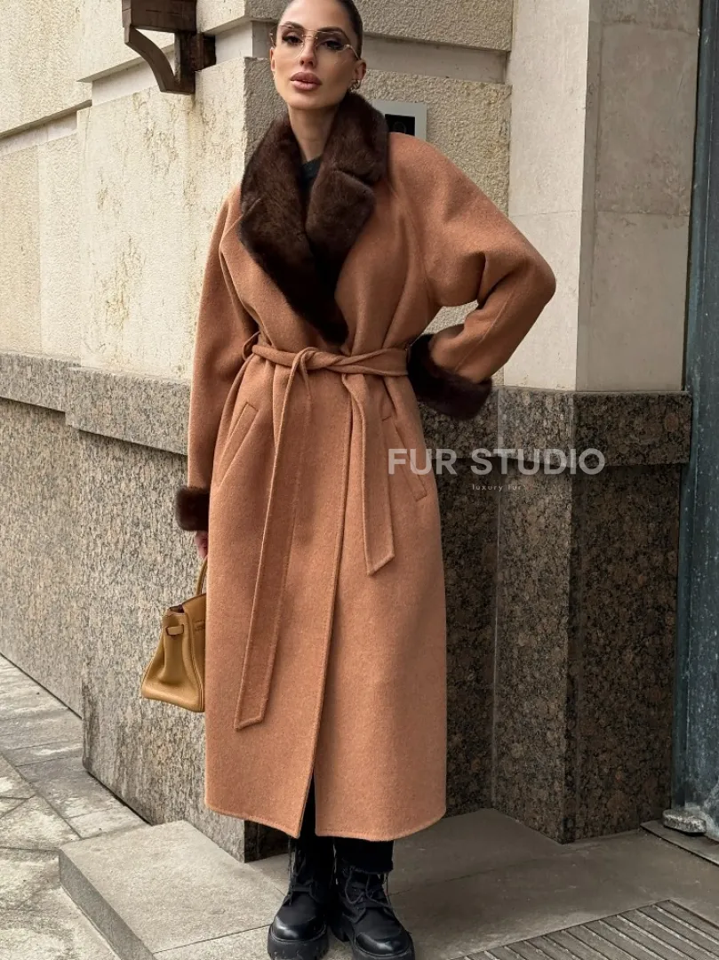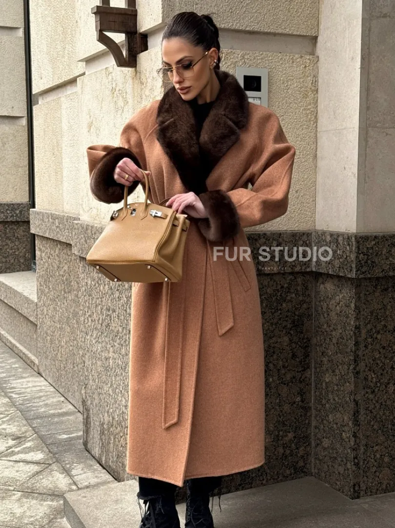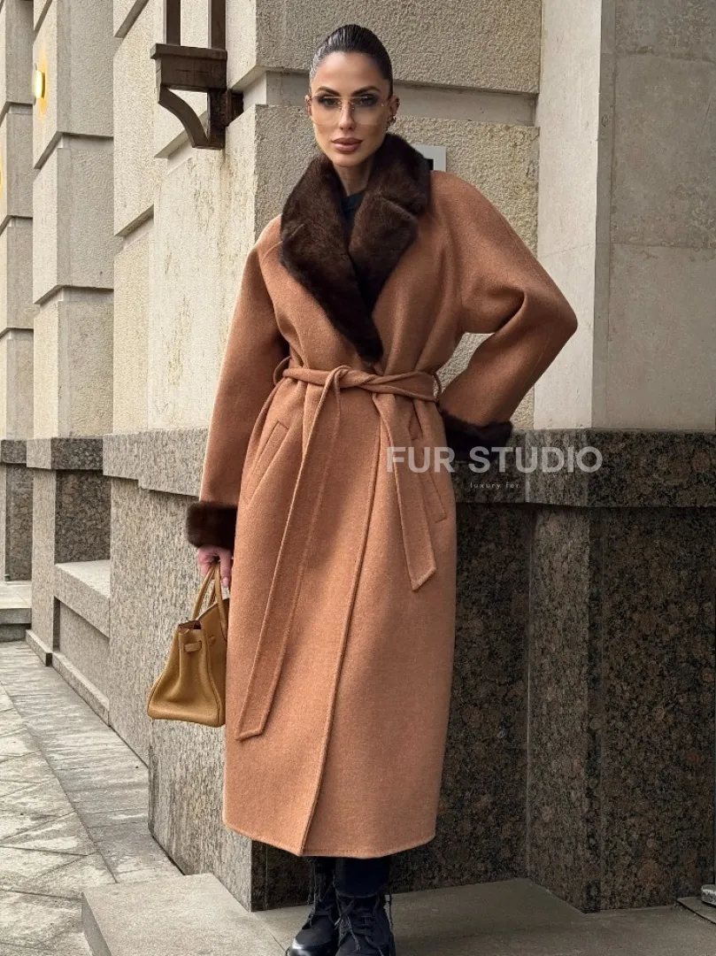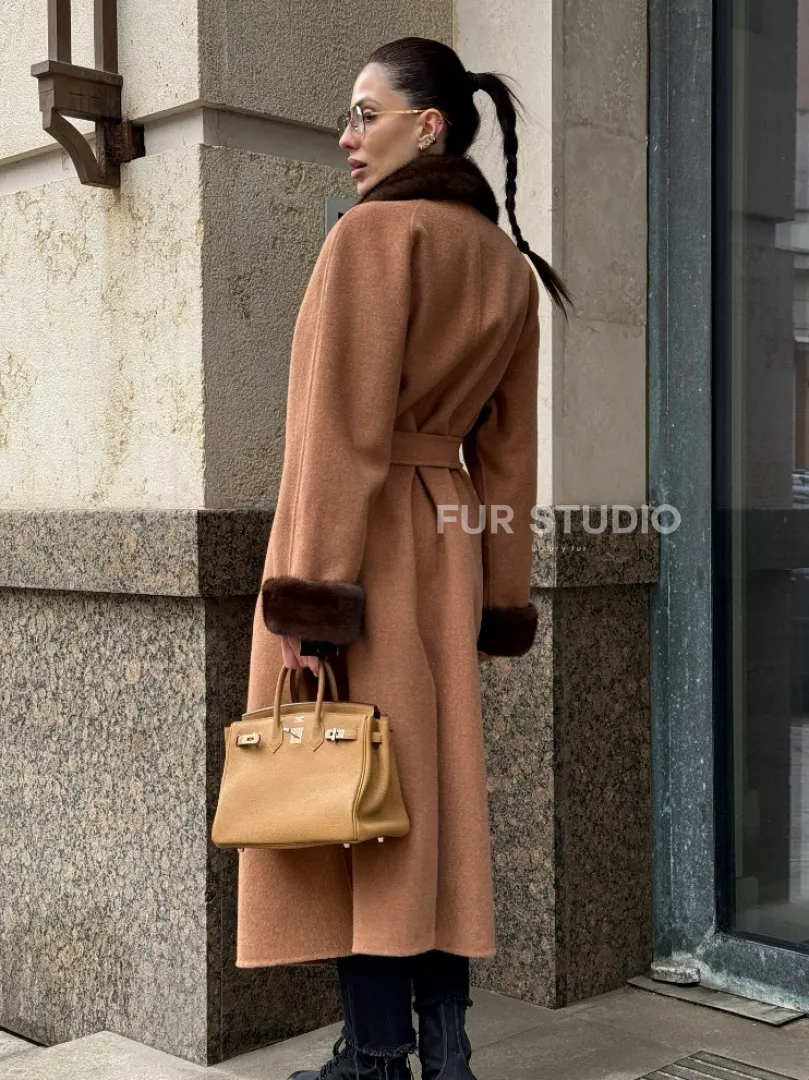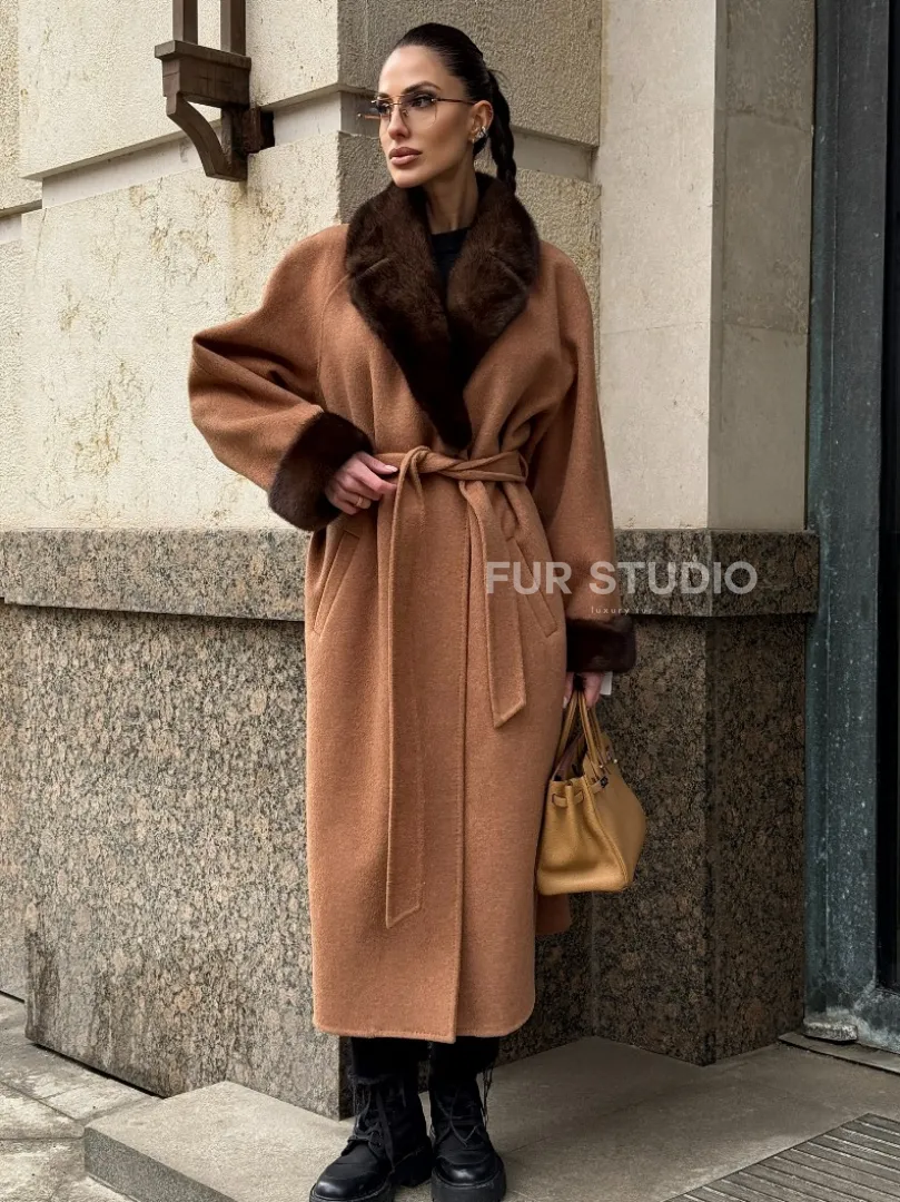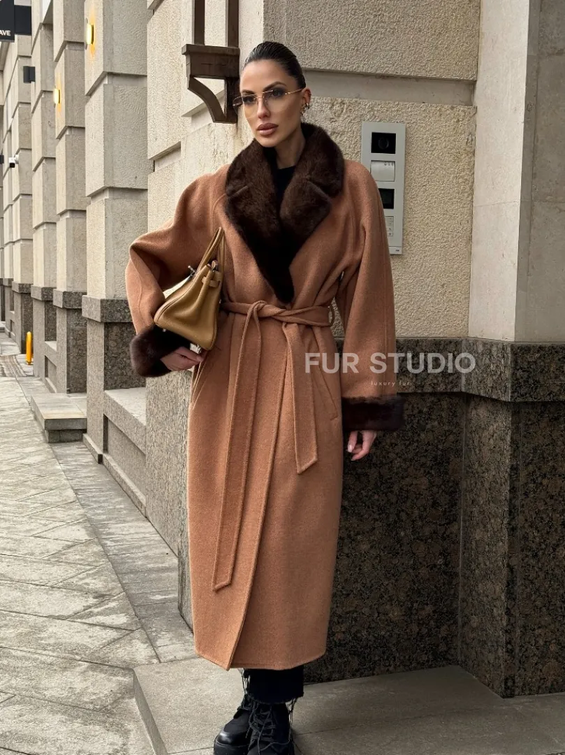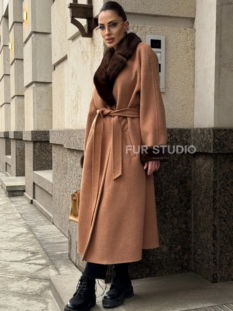Длинное демисезонное пальто с отделкой из меха норки 101850