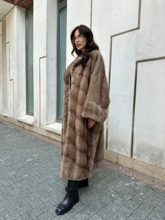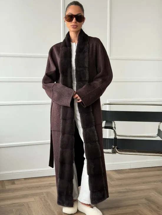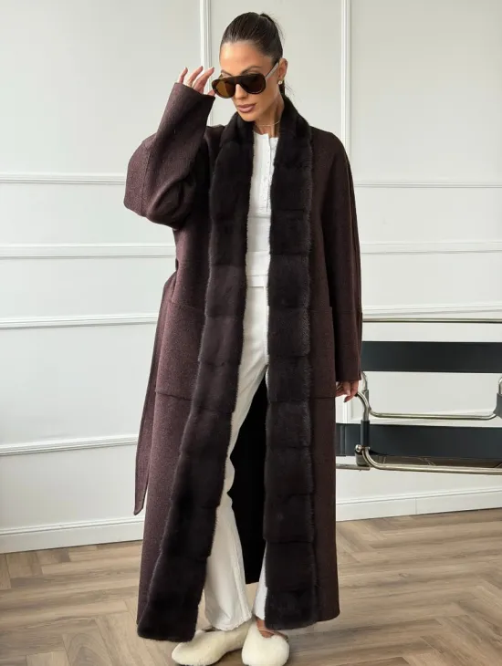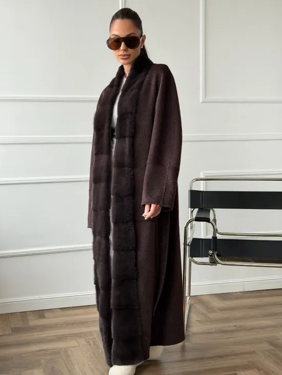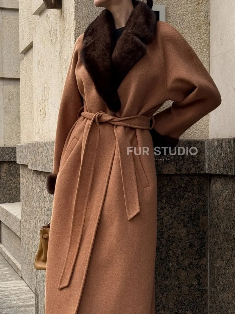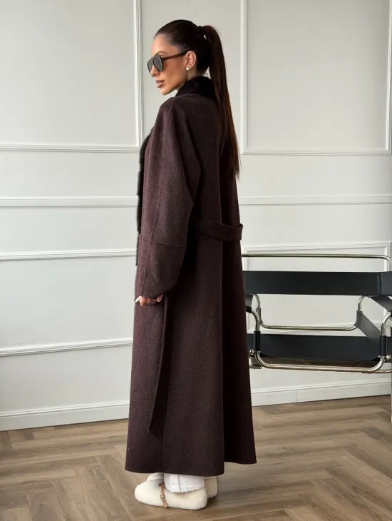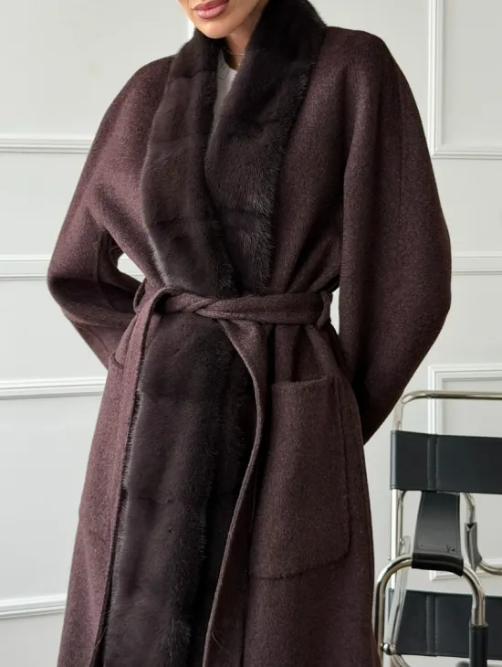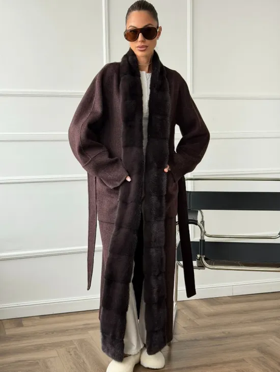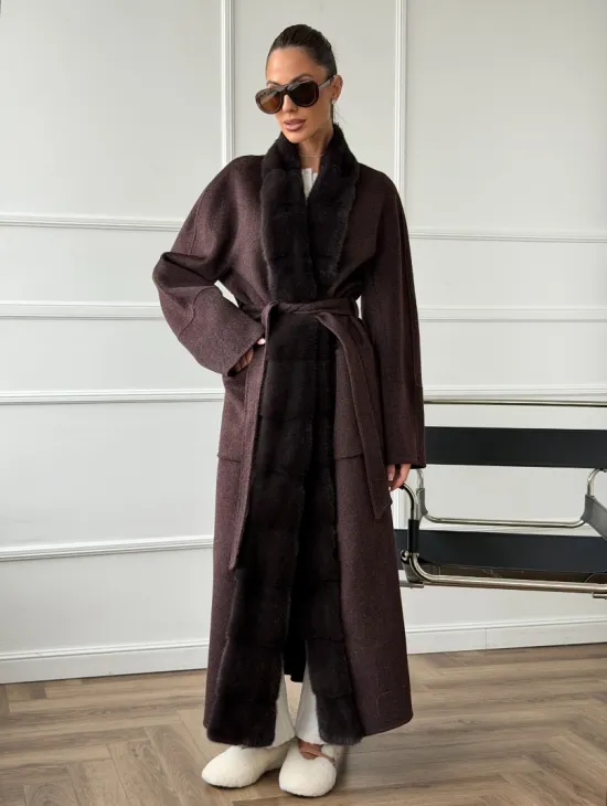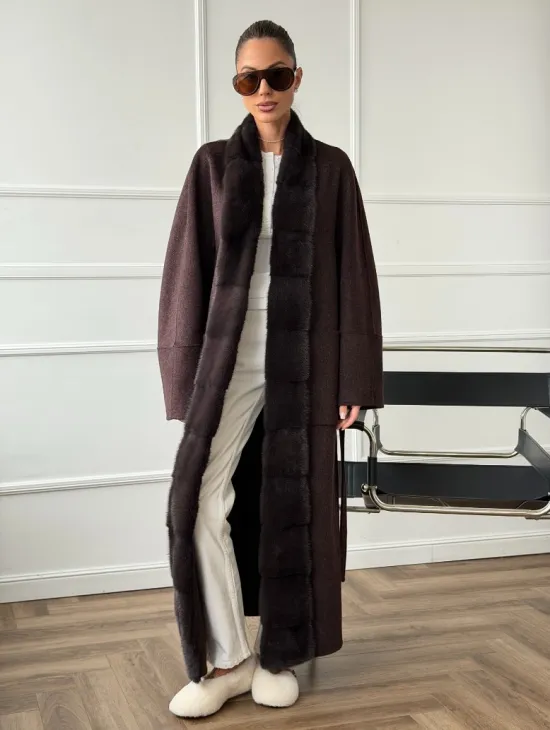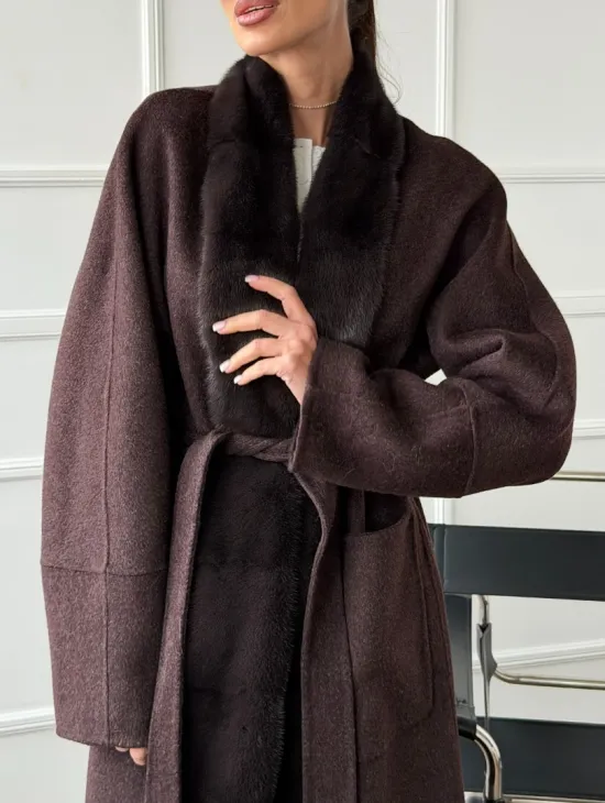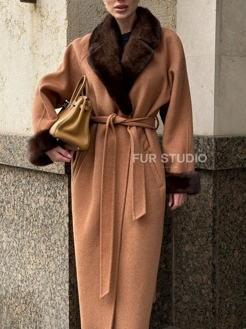 Длинное демисезонное пальто с отделкой из меха норки 101850