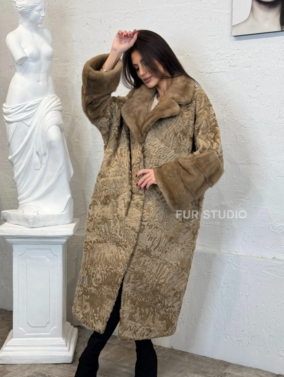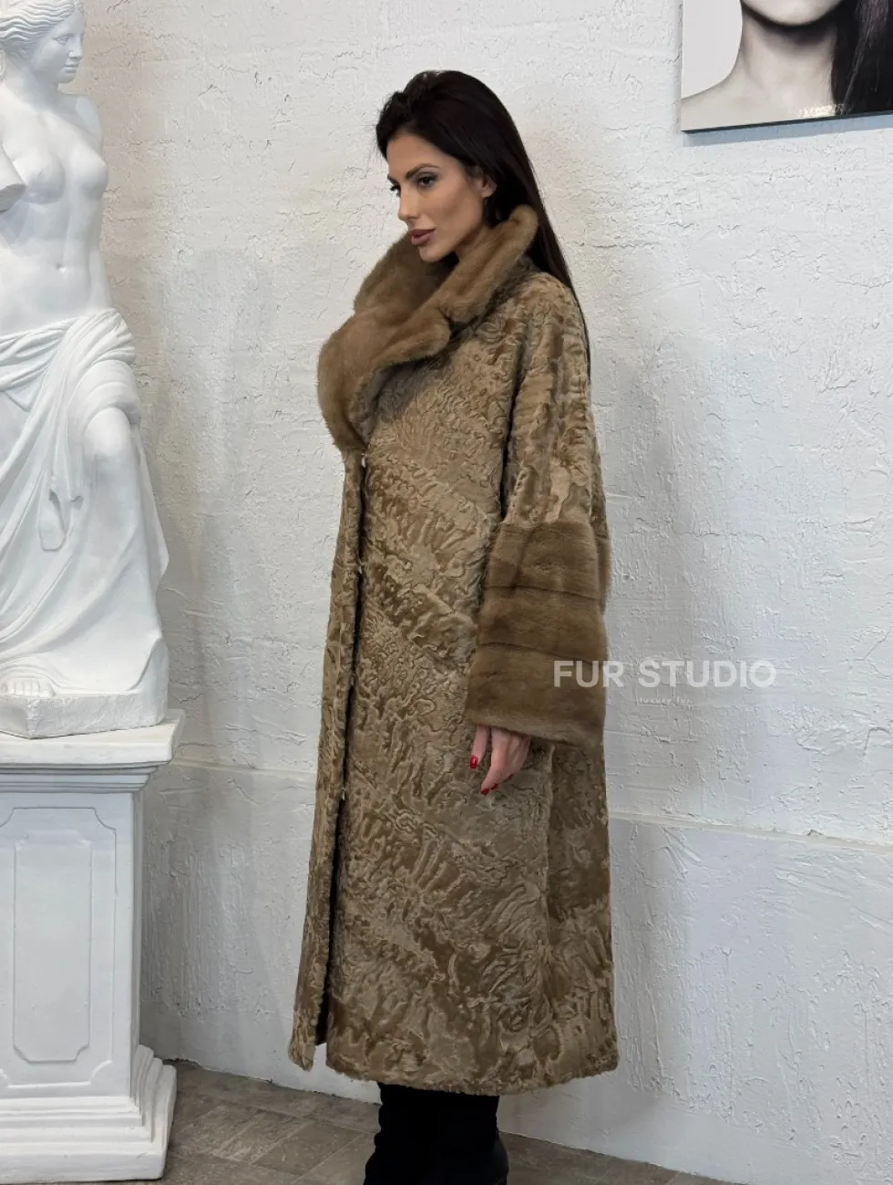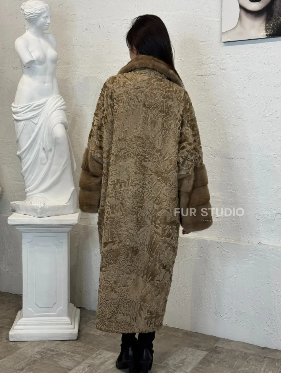 Длинное женское пальто из натурального меха каракульчи с отделкой из норки доступна для покупки в нашем шоуруме Furs Studio в Москве. У нас так же есть доставка во все города России. Добавьте немного роскоши в свой гардероб с этой шубой, которая будет служить вам многие годы.