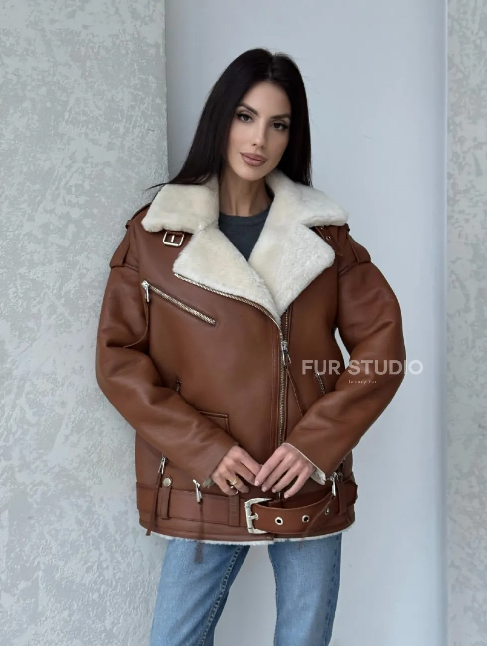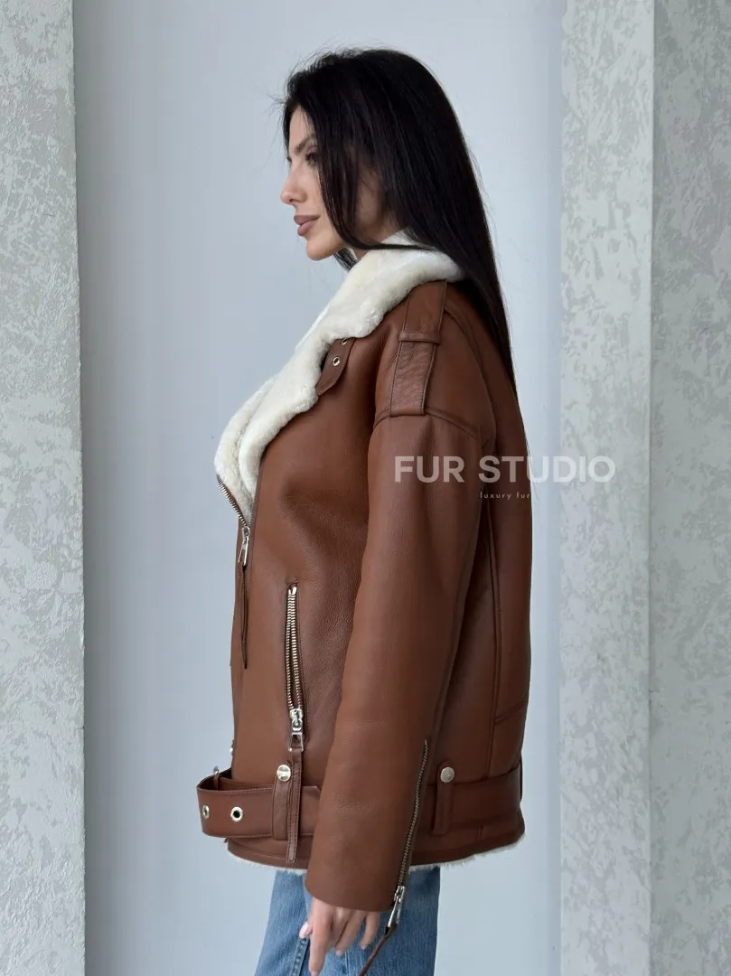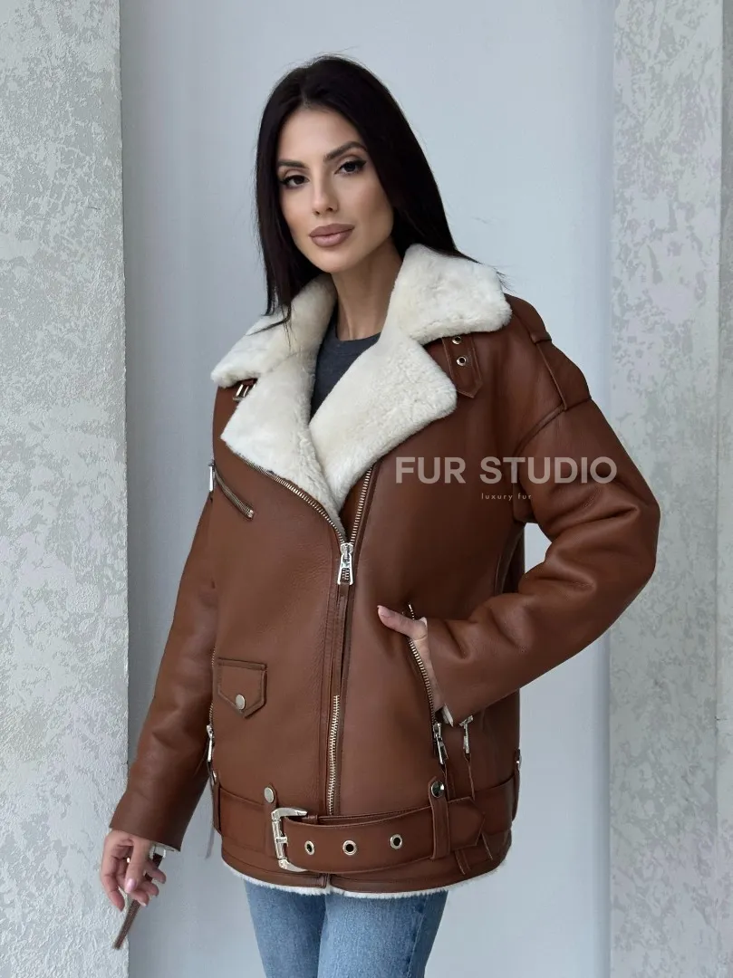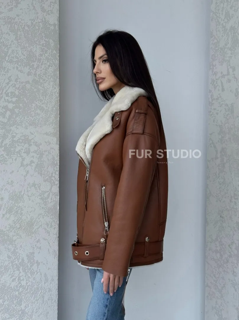 Дубленка авиатор из натуральной кожи в цвете виски – выбор современных девушек. Модель – тренд этого сезона. Мех овчины позаботится о комфортной температуре тела в прохладное время года. Необычный цвет виски подчеркнет оттенок волос и кожи владелицы. Качество изделия будет радовать хозяйку долгие годы.
