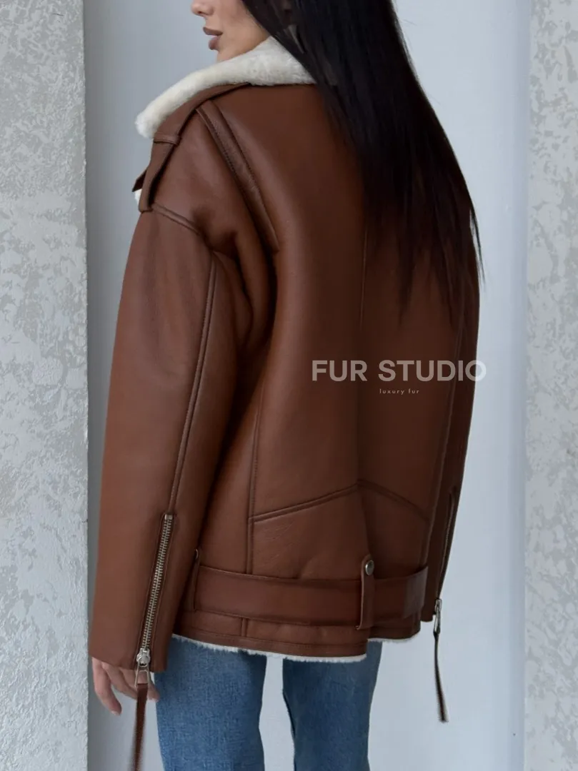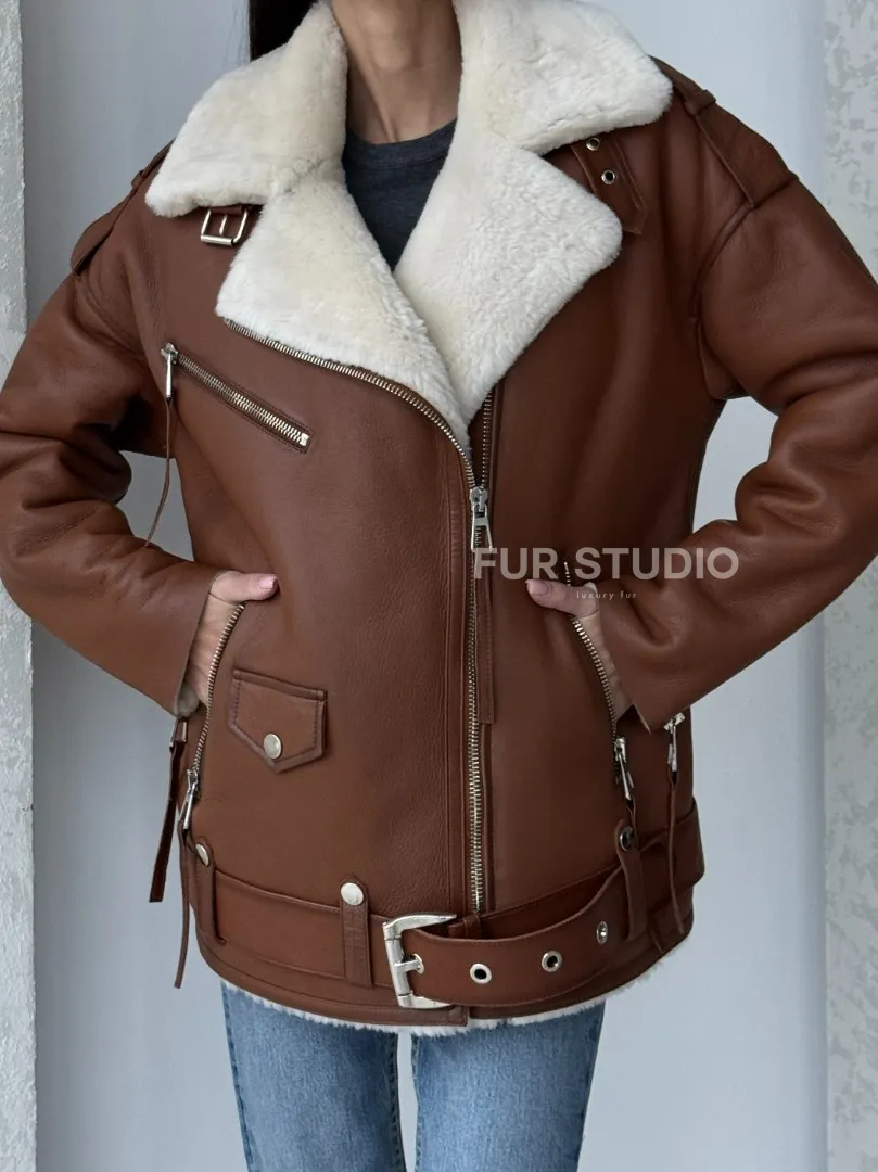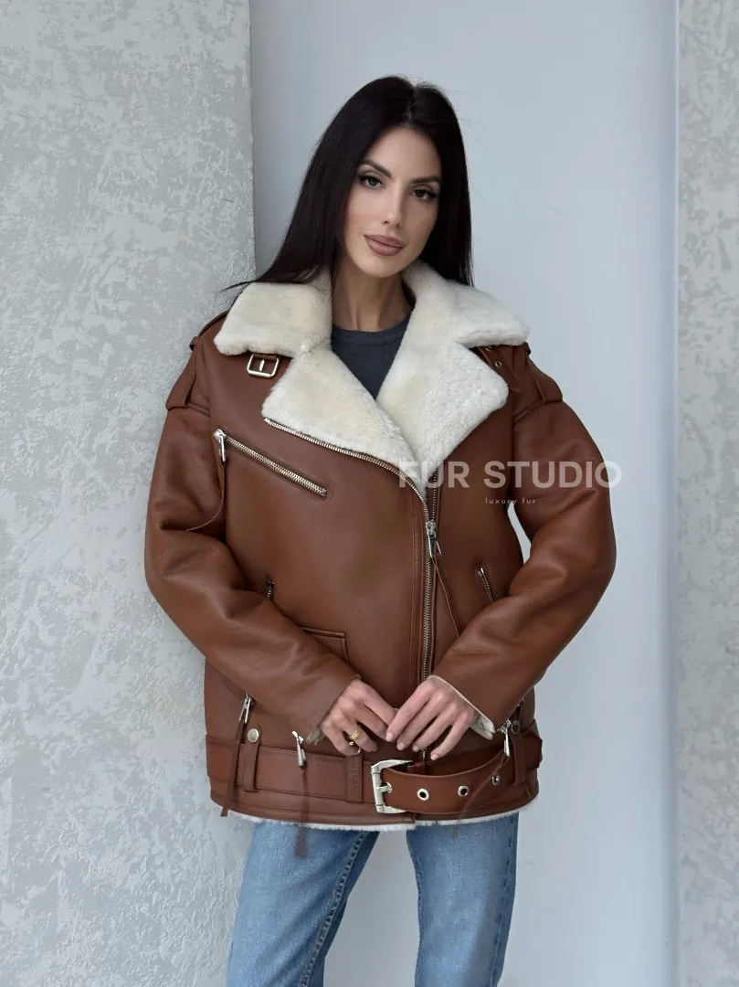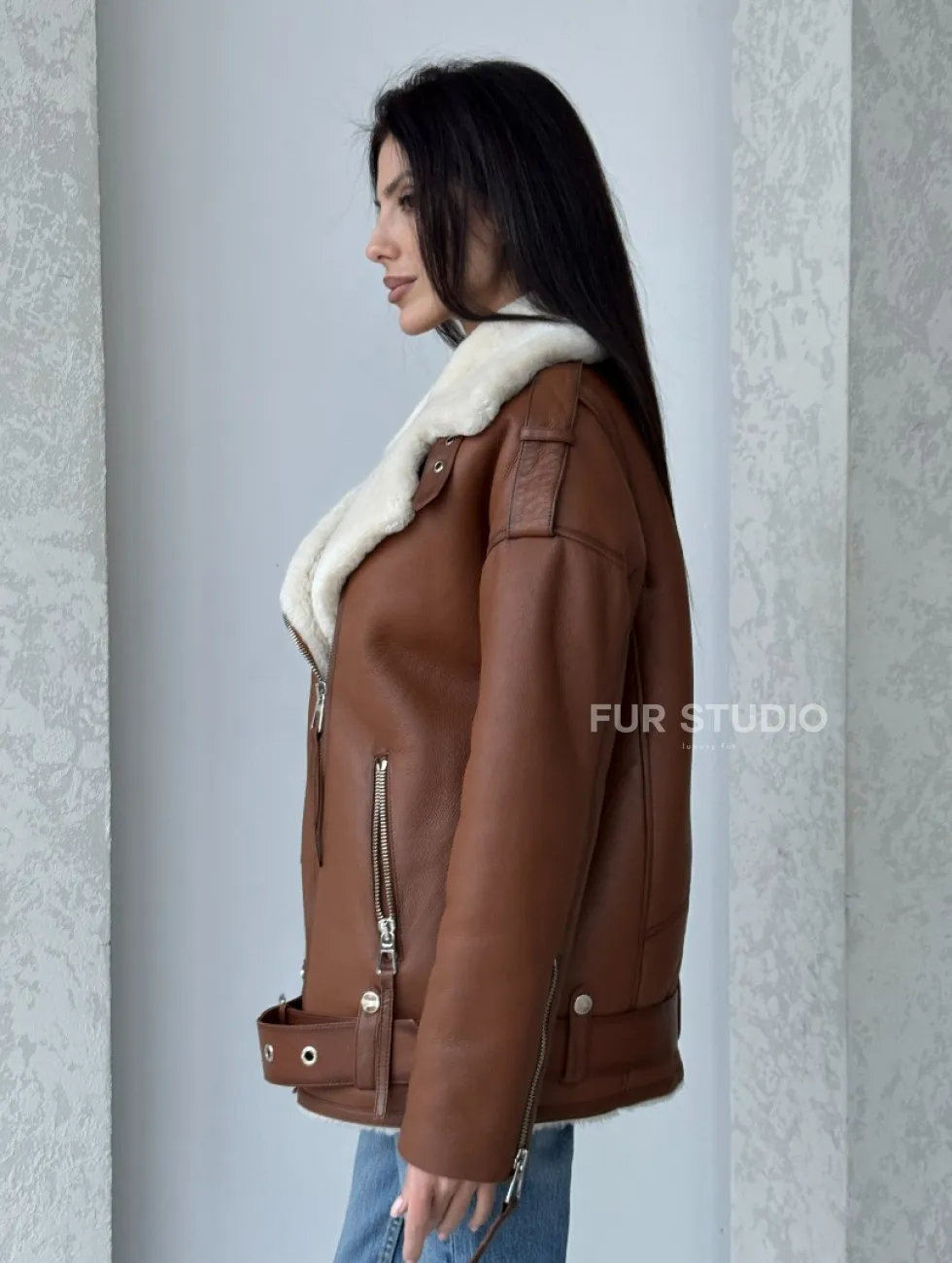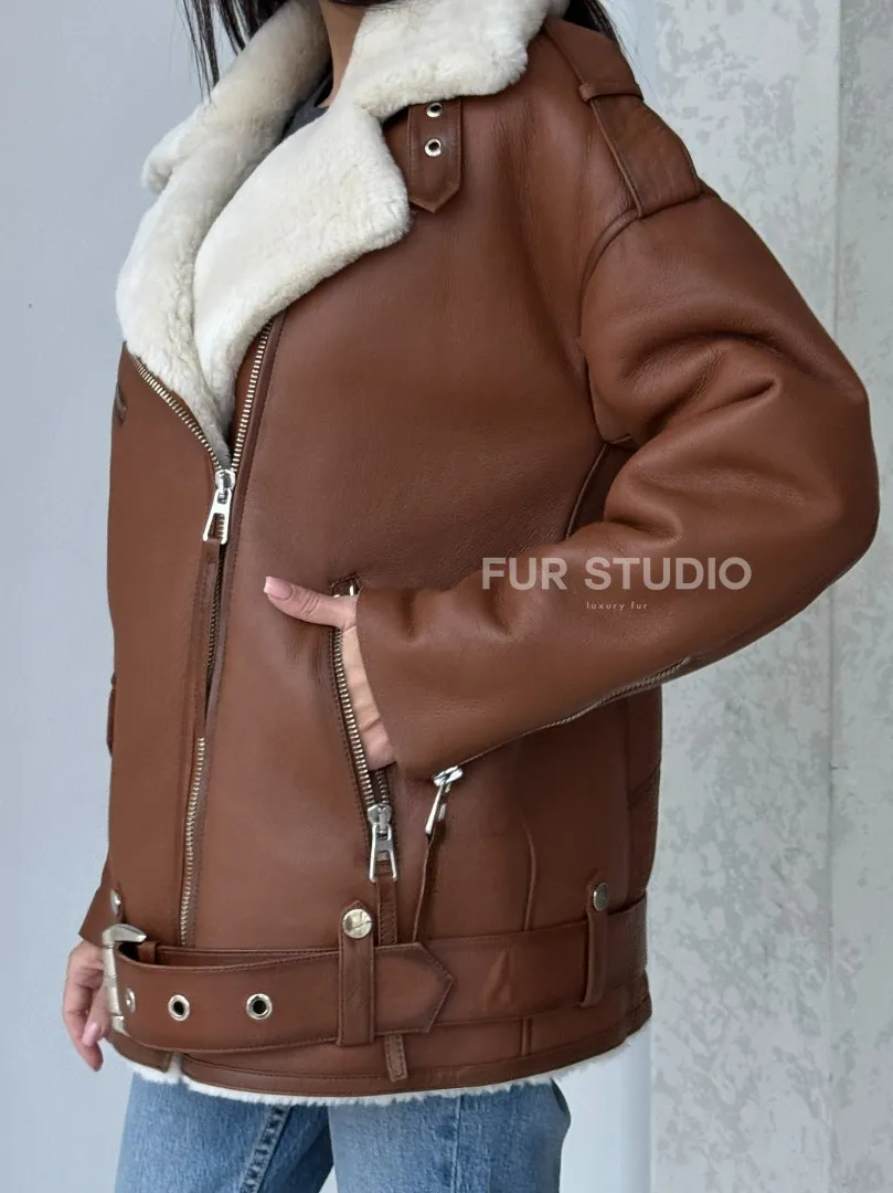 Дубленка авиатор из натуральной кожи в цвете виски – выбор современных девушек. Модель – тренд этого сезона. Мех овчины позаботится о комфортной температуре тела в прохладное время года. Необычный цвет виски подчеркнет оттенок волос и кожи владелицы. Качество изделия будет радовать хозяйку долгие годы.