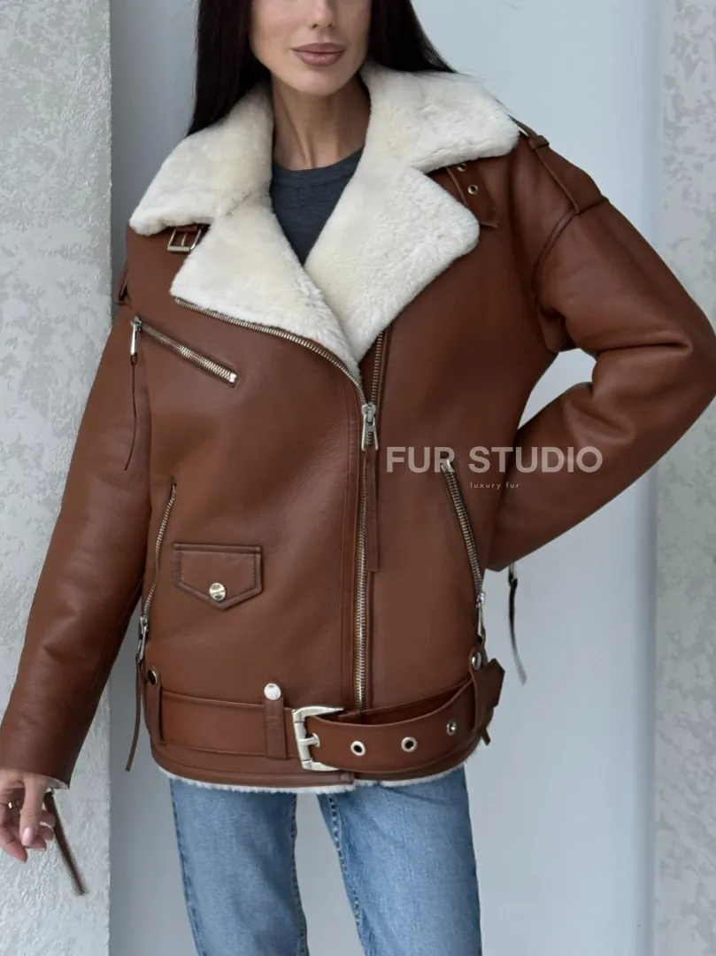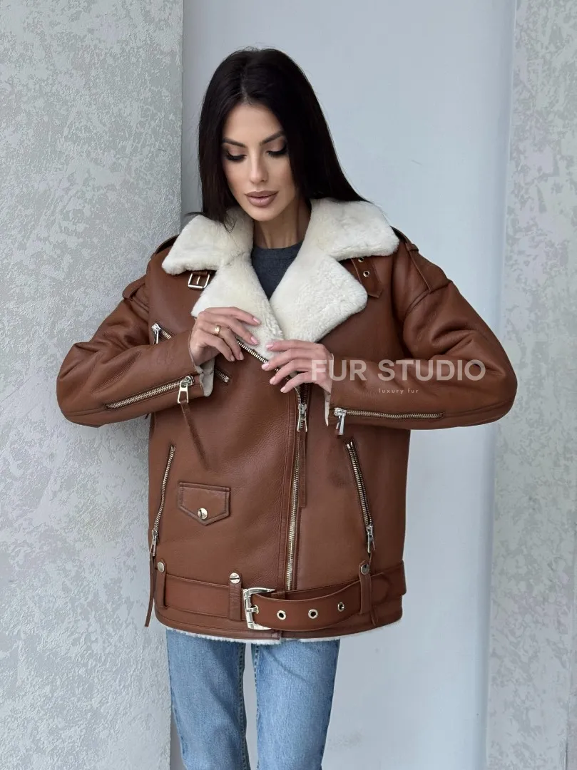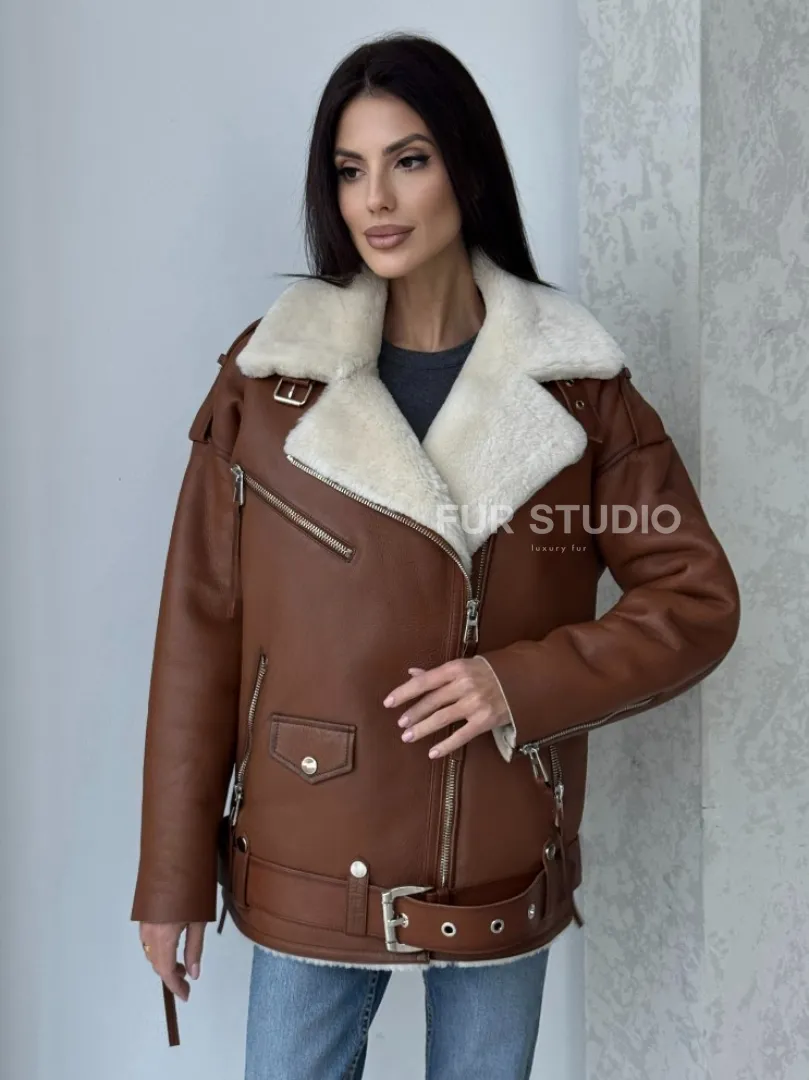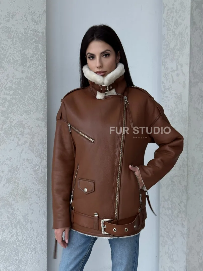 Оптимальная длина комфортна при носке. Прямой крой не сковывает движений, что удобно при вождении машины. Стильный пояс на бедрах добавляет нотку экстравагантности в образ. Модель сочетается с базовым гардеробом. Шикарный воротник не даст замерзнуть шее в непогоду. Фермуары на рукавах смотрятся оригинально. Купить дубленку авиатор из натуральной кожи в цвете виски могут женщины, которые любят выглядеть дерзко, но при этом изысканно.