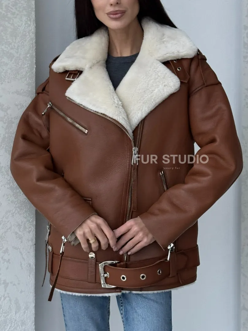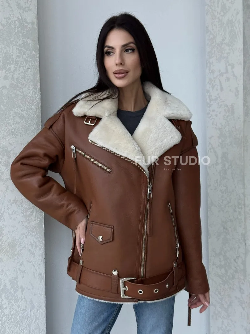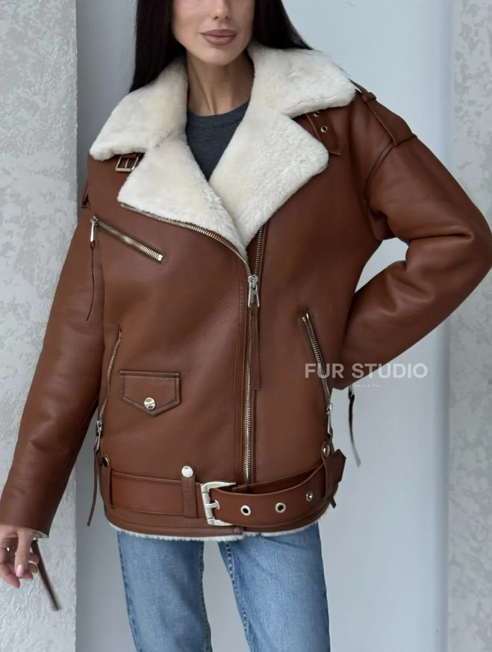 Оптимальная длина комфортна при носке. Прямой крой не сковывает движений, что удобно при вождении машины. Стильный пояс на бедрах добавляет нотку экстравагантности в образ. Модель сочетается с базовым гардеробом. Шикарный воротник не даст замерзнуть шее в непогоду. Фермуары на рукавах смотрятся оригинально. Купить дубленку авиатор из натуральной кожи в цвете виски могут женщины, которые любят выглядеть дерзко, но при этом изысканно.