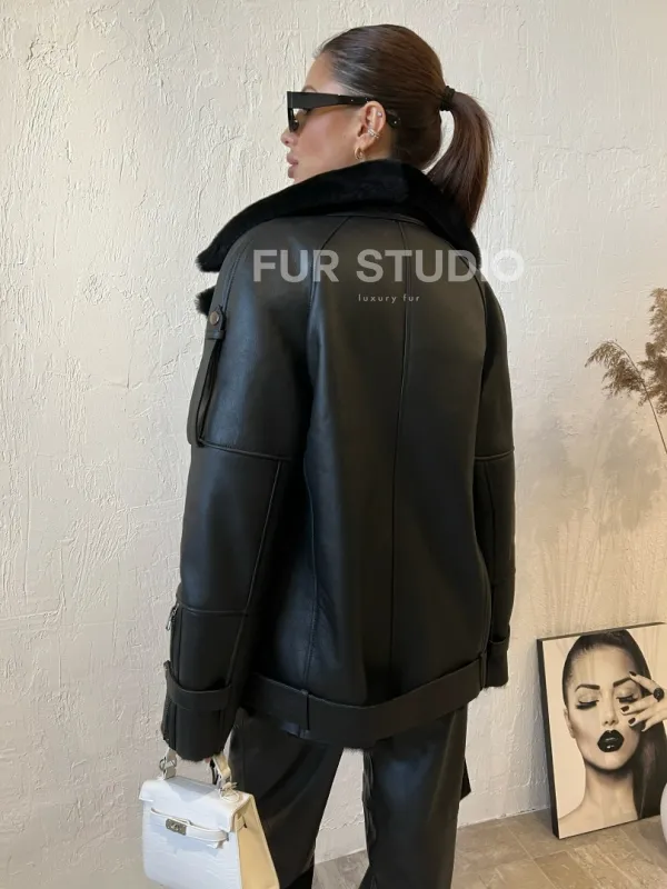 Дубленка авиатор в черном цвете из натуральной овчины - выбор стильных и уверенных женщин. Авиатор модель, которая будет к лицу дамам любого возраста. Теплая овчина согреет в прохладное время года. Кожа приятна на ощупь и неприхотлива в уходе. Материал высокого качества. Стильные заклепки и декоративные фермуары создают дерзкий и немного грубый образ.