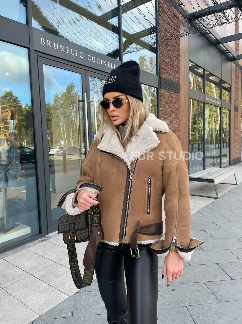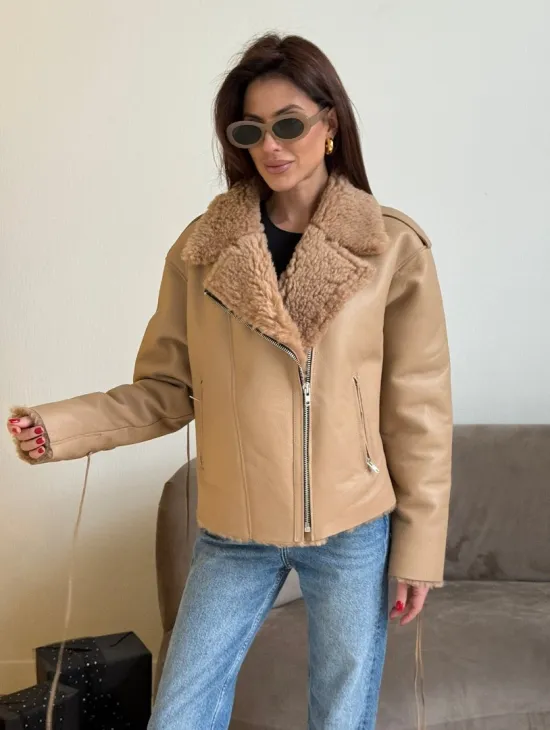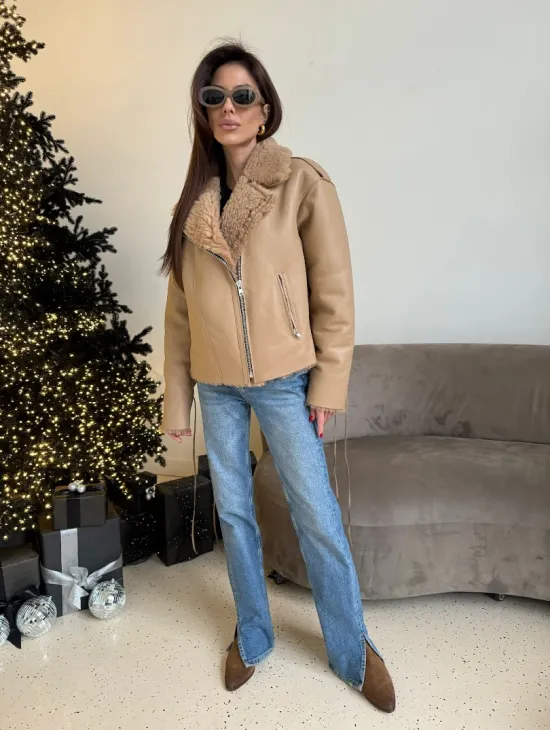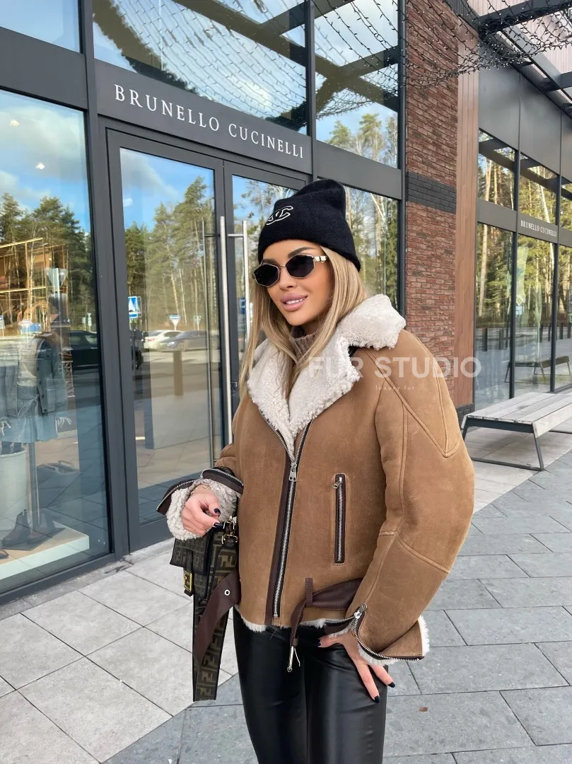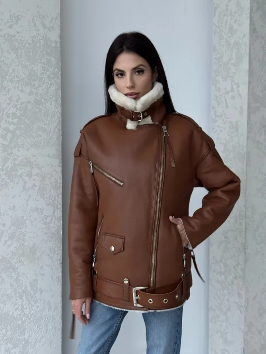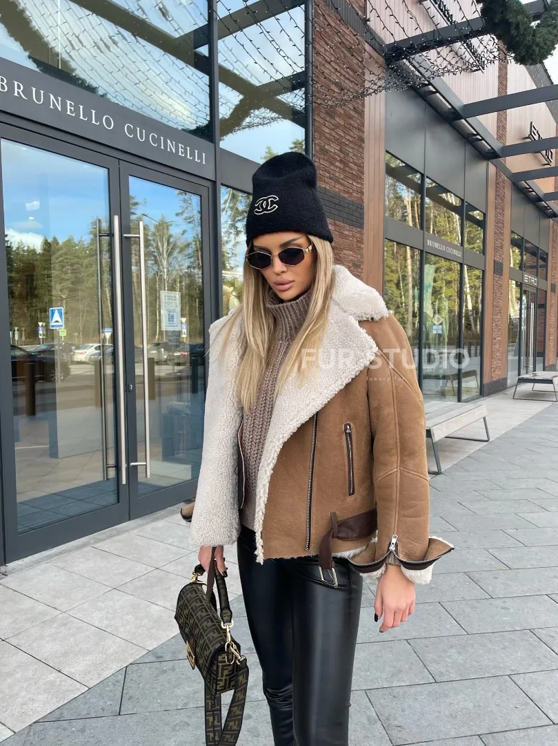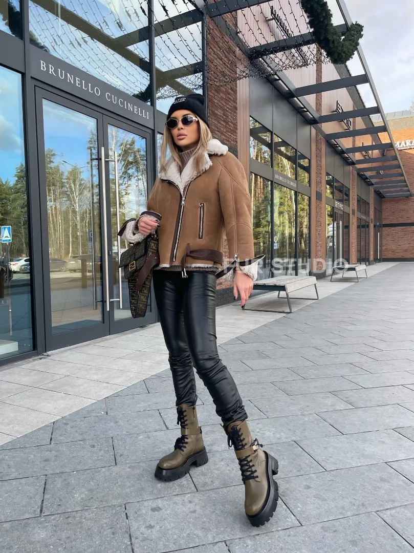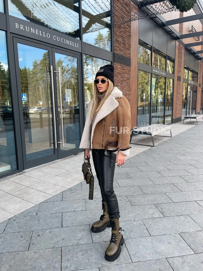 Удобный воротник позаботится о комфортной температуре шеи и подчеркнет ее изгибы. Благородная расцветка выгодно оттенит цвет глаз и волос владелицы. Оригинальный рюкзак и грубая, но стильная обувь будут гармонично сочетаться с образом. Купить дубленку – бомбер со спущенным плечом из натуральной овчины могут молодые девушки, которые хотят выглядеть стильно вне зависимости от времени года.