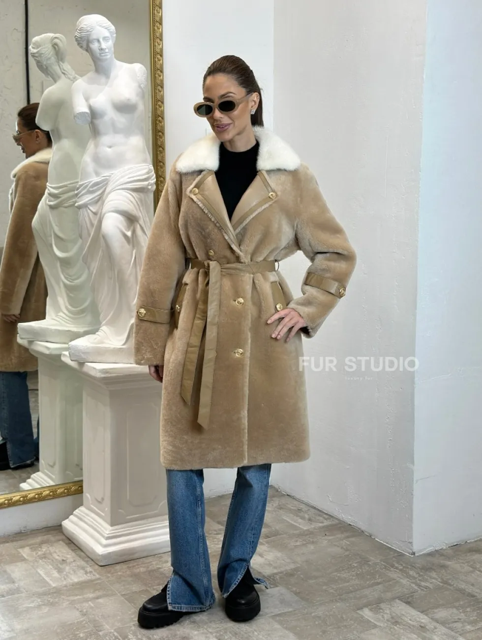 Дубленка из овчины с белым мехом норки - цвет бежевый доступна для покупки в нашем шоуруме Furs Studio в Москве, а также предлагается удобная доставка во все города России. Обогатите свой гардероб этой дубленкой, которая прослужит вам многие годы, добавив немного роскоши в ваш повседневный образ.