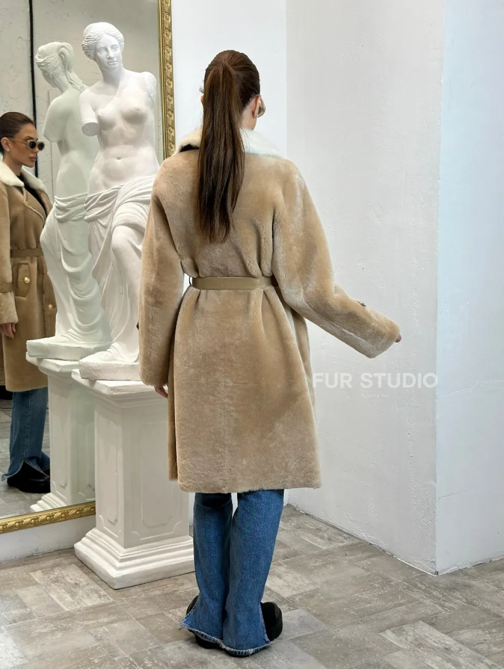 Дубленка из овчины с белым мехом норки - цвет бежевый. Модель предлагается в размерах от 42 до 50. Оптимальная длина моделей 95-100 см подчеркивает линии вашей фигуры. Эта дубленка станет неотъемлемой частью гардероба для тех, кто предпочитает роскошь и утонченность натуральной кожи.