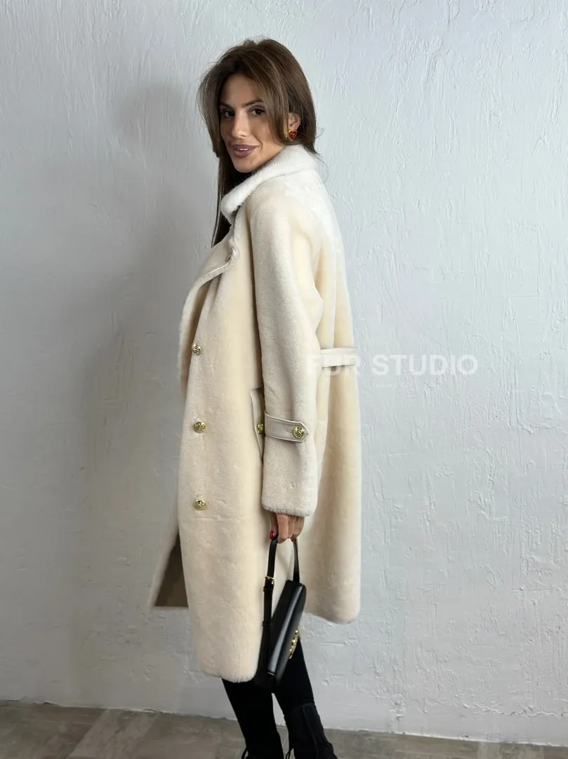 Дубленка из овчины с мехом норки - цвет молочный. Модель предлагается в размерах от 42 до 50. Оптимальная длина моделей 95-100 см подчеркивает линии вашей фигуры. Эта дубленка станет неотъемлемой частью гардероба для тех, кто предпочитает роскошь и утонченность натуральной кожи.